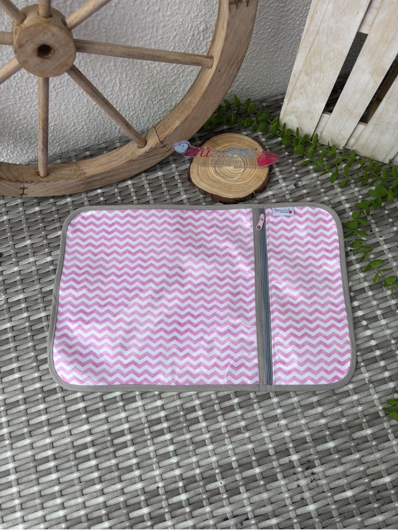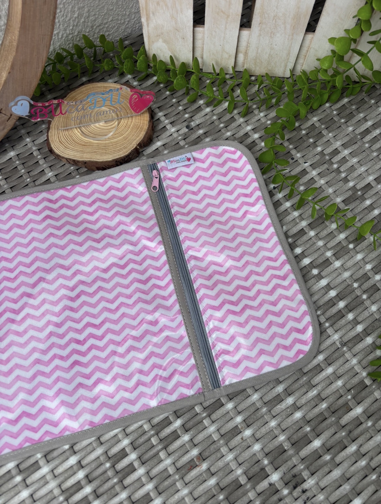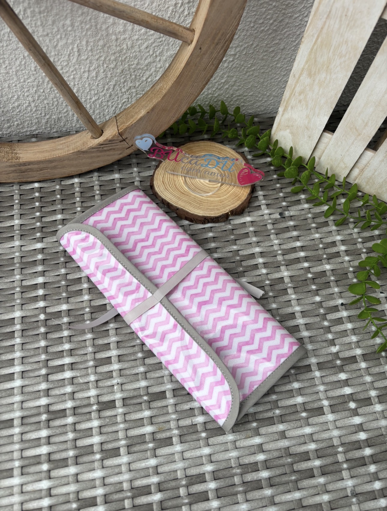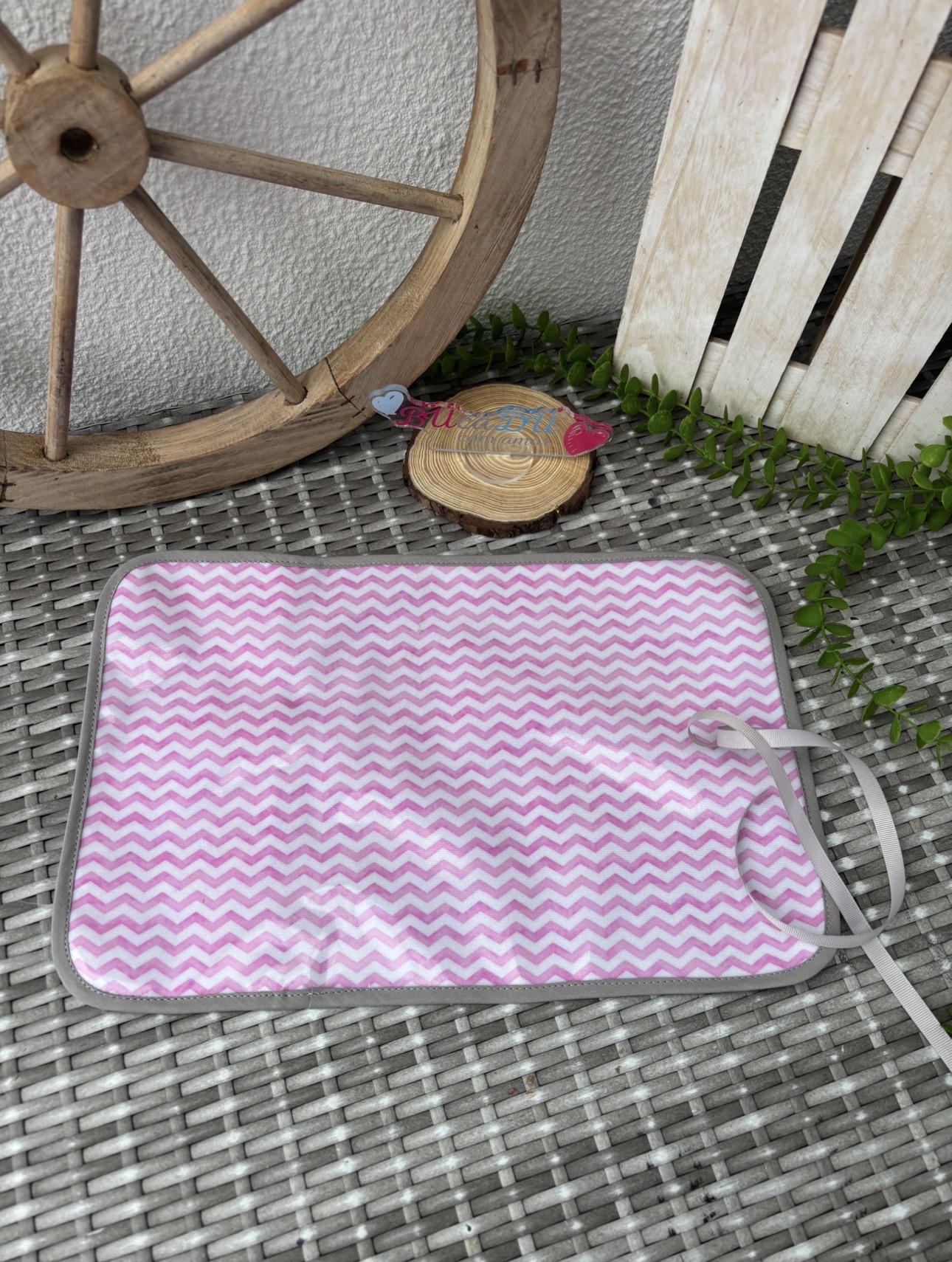 Tapete ou toalha rosa e branco com padrão zig-zag em superfície de vime cinzento