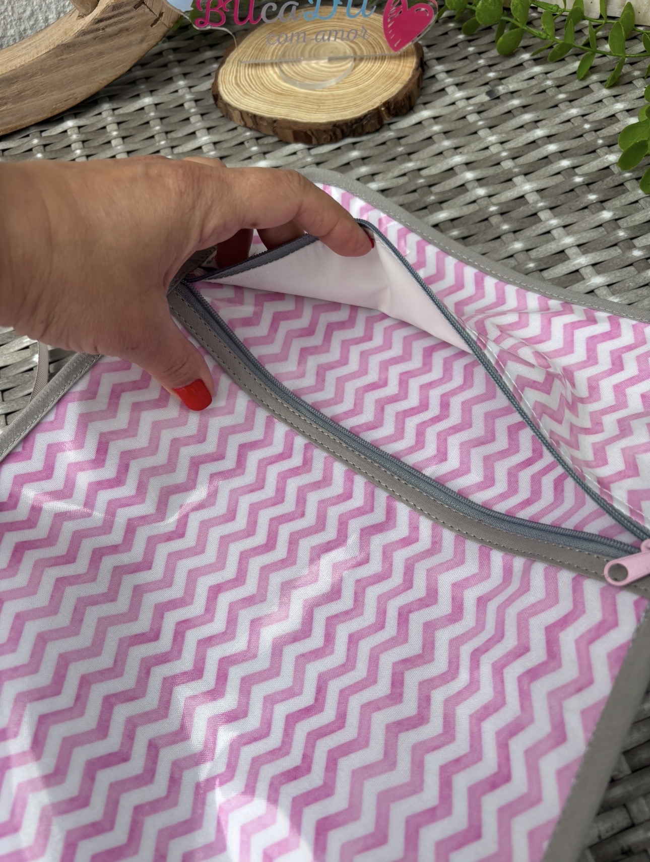 • Bolsa ou estojo com padrão ziguezague cor-de-rosa e branco e fecho de correr cinzento