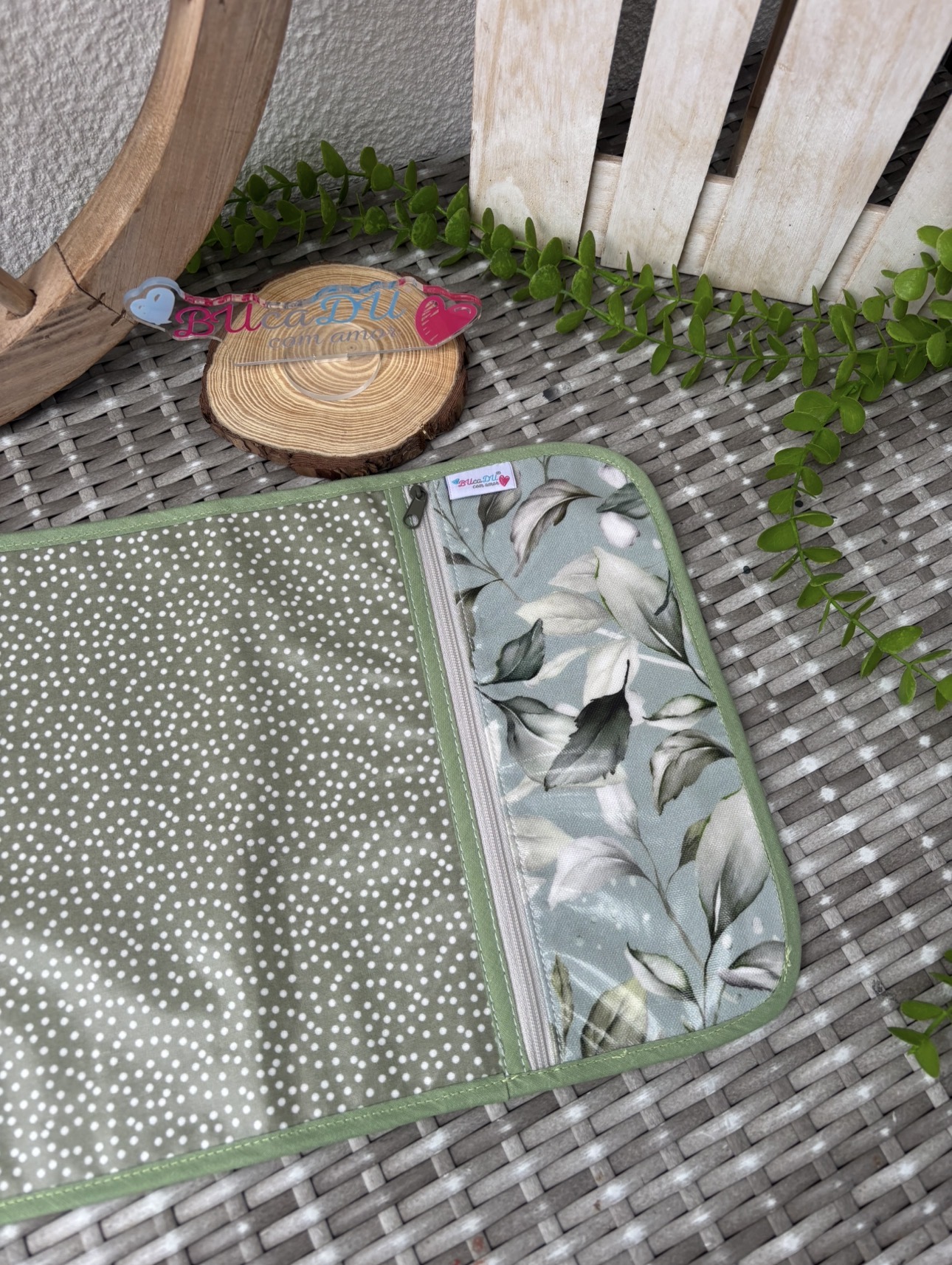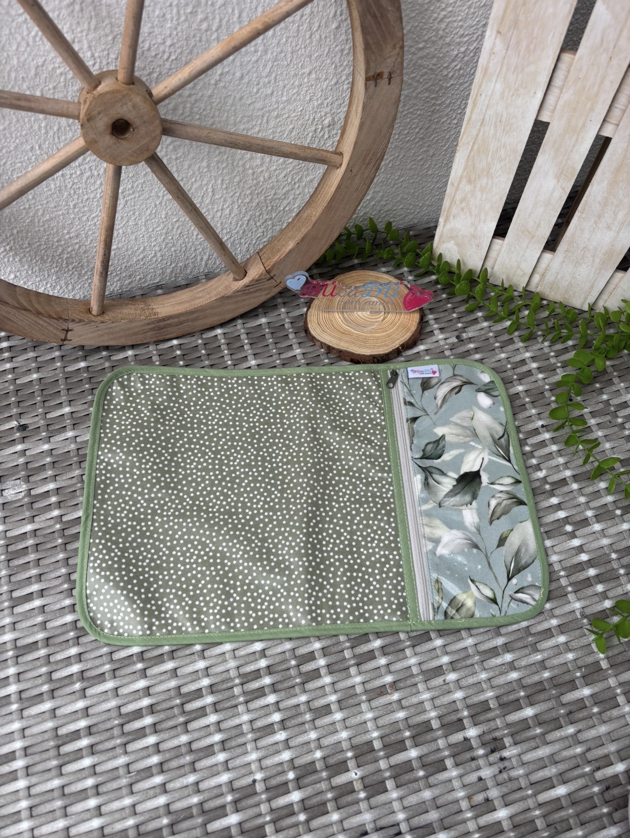 • Carteira ou organizador de tecido com padrão folhas verde e bolinhas brancas