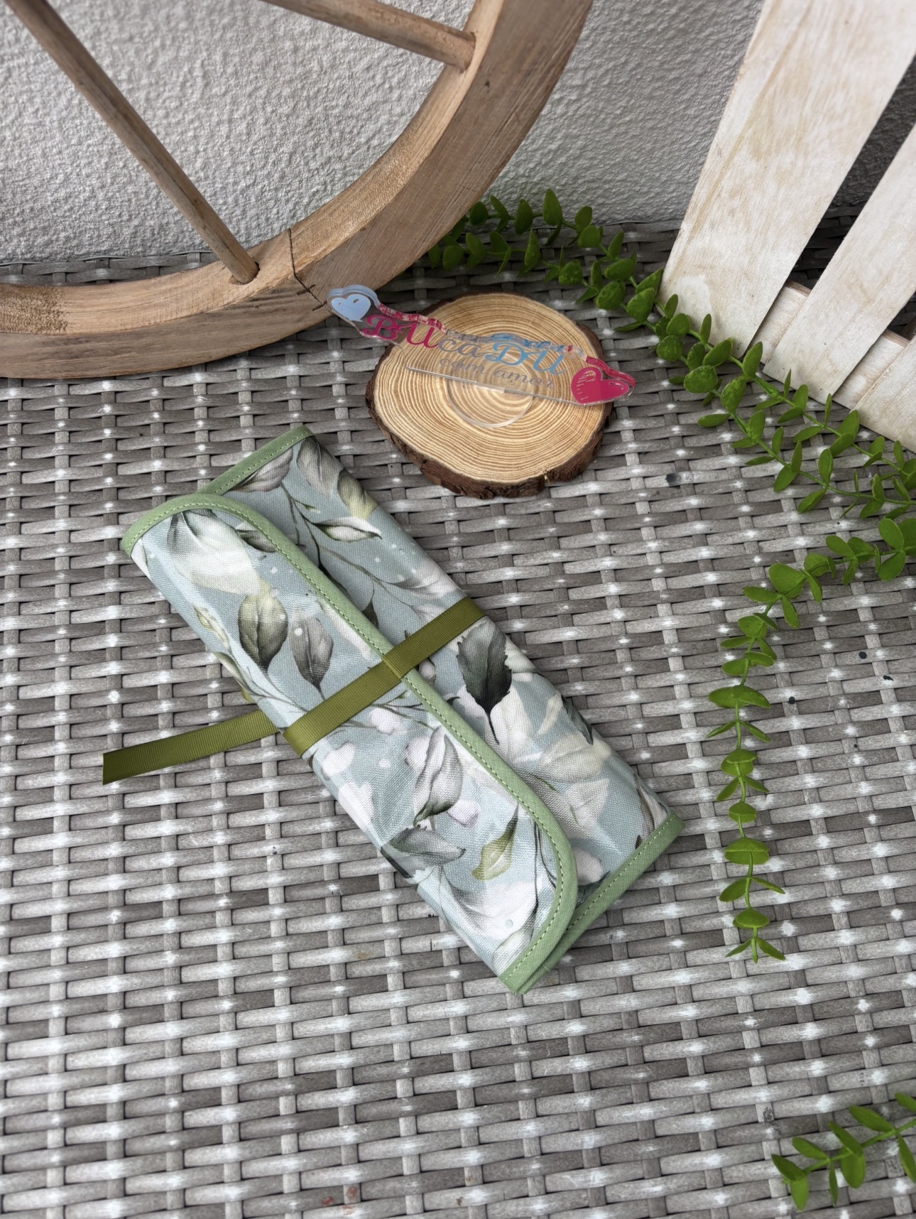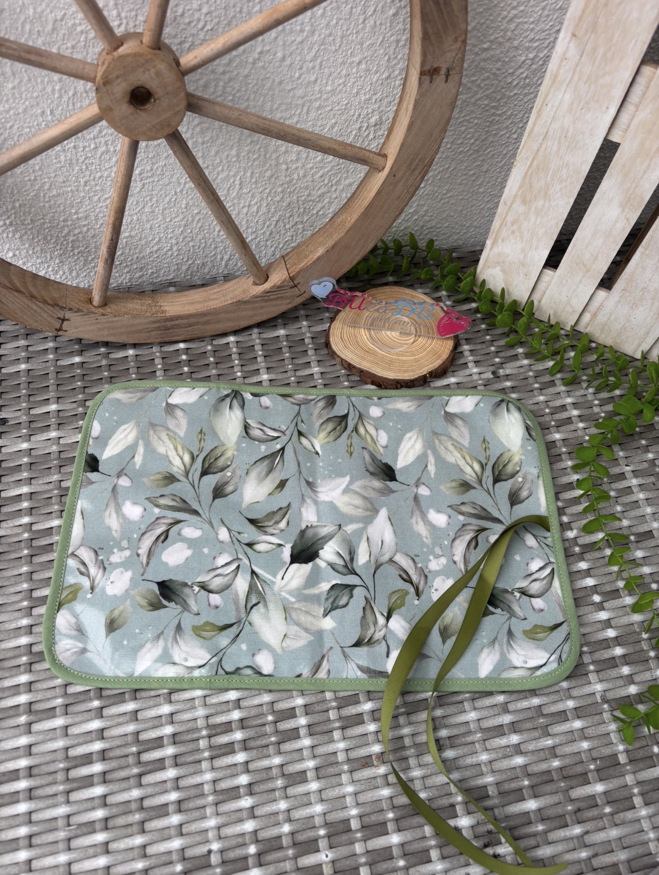 • Toalhete com padrão de folhas verdes e brancas, com fita verde, sobre superfície de vime cinza, roda de madeira e paletes brancos.