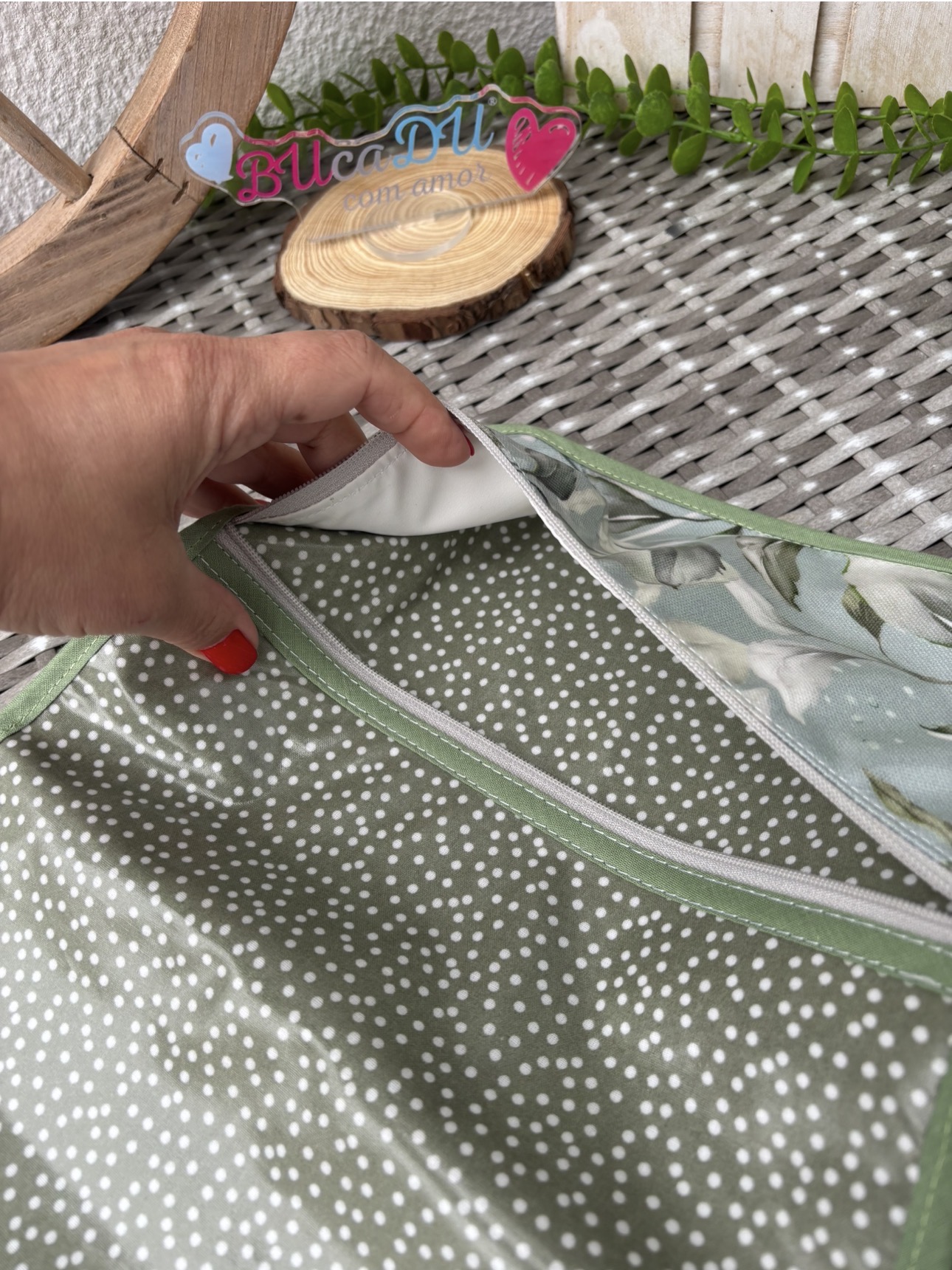 • Bolsa verde com bolinhas brancas e flores, com fecho, em ambiente decorativo