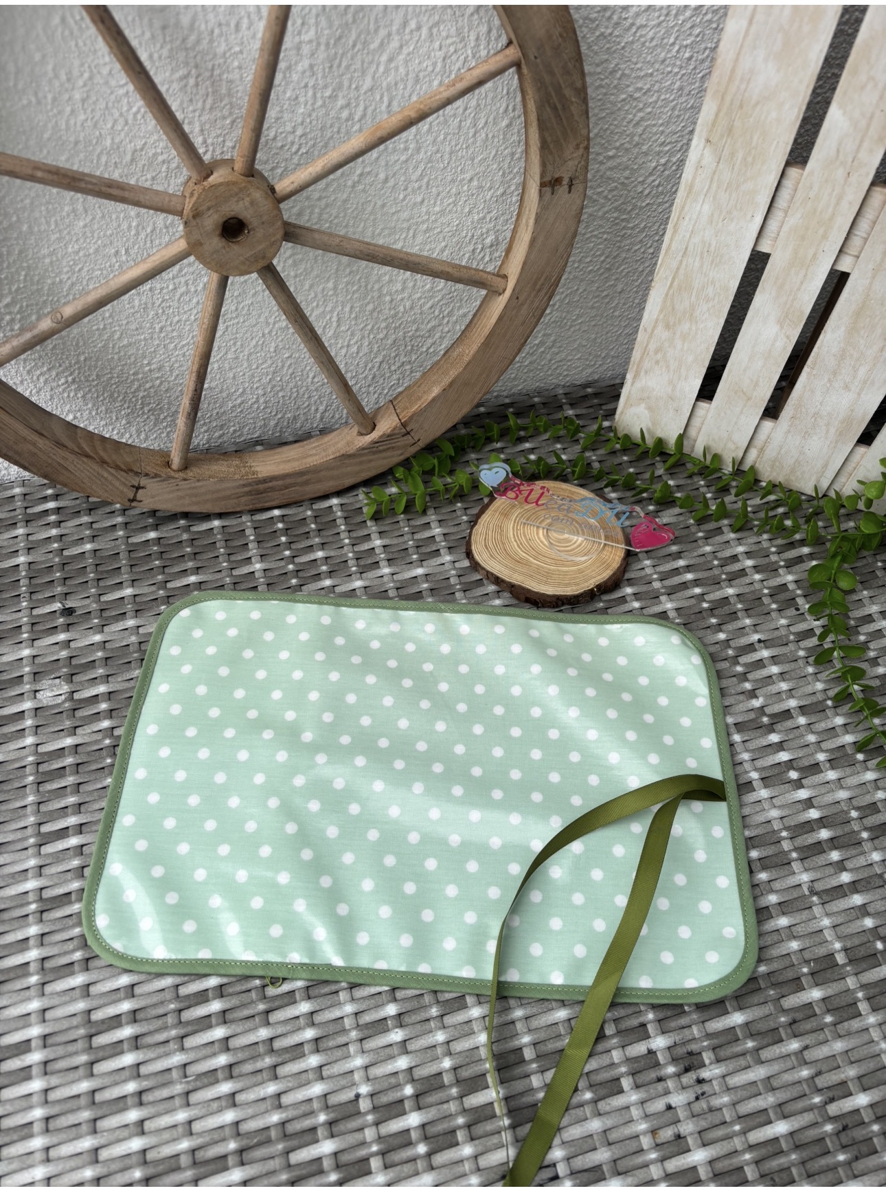 • Tecido verde claro com bolinhas brancas e fita verde sobre superfície trançada cinza junto a roda e madeira decorativa