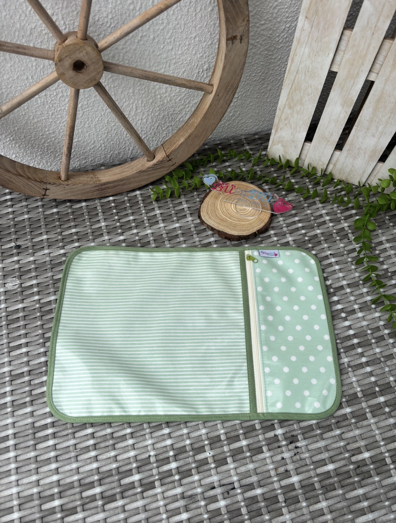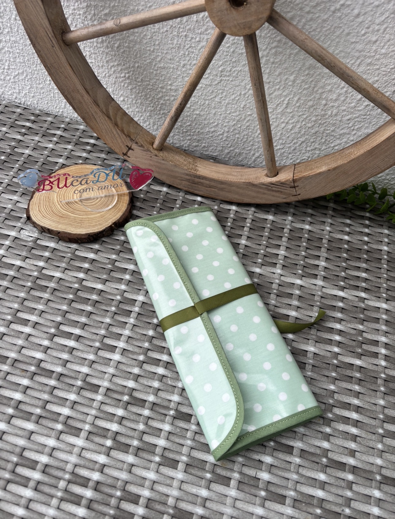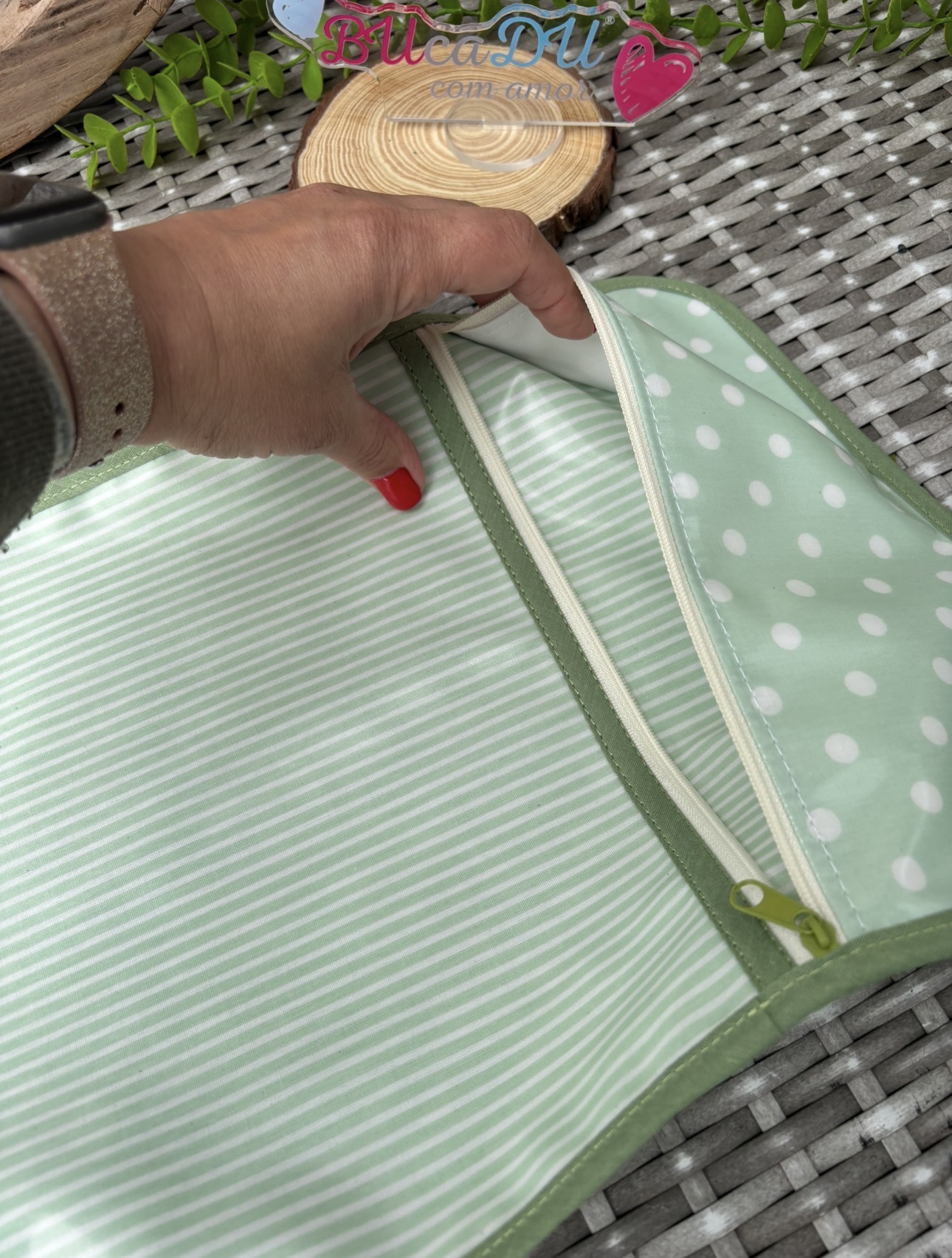 • Bolsa verde com bolinhas brancas e interior riscado, zíper aberto, mão a segurá-la sobre mesa de verga.