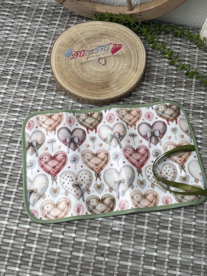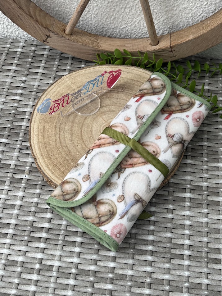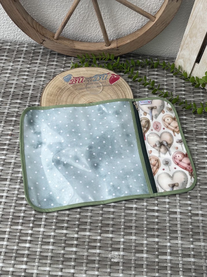 • Estojo tecido branco com padrão infantil e bordas verdes
