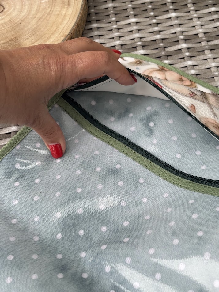 • Estojo com padrão de bolinhas e fecho de correr aberto