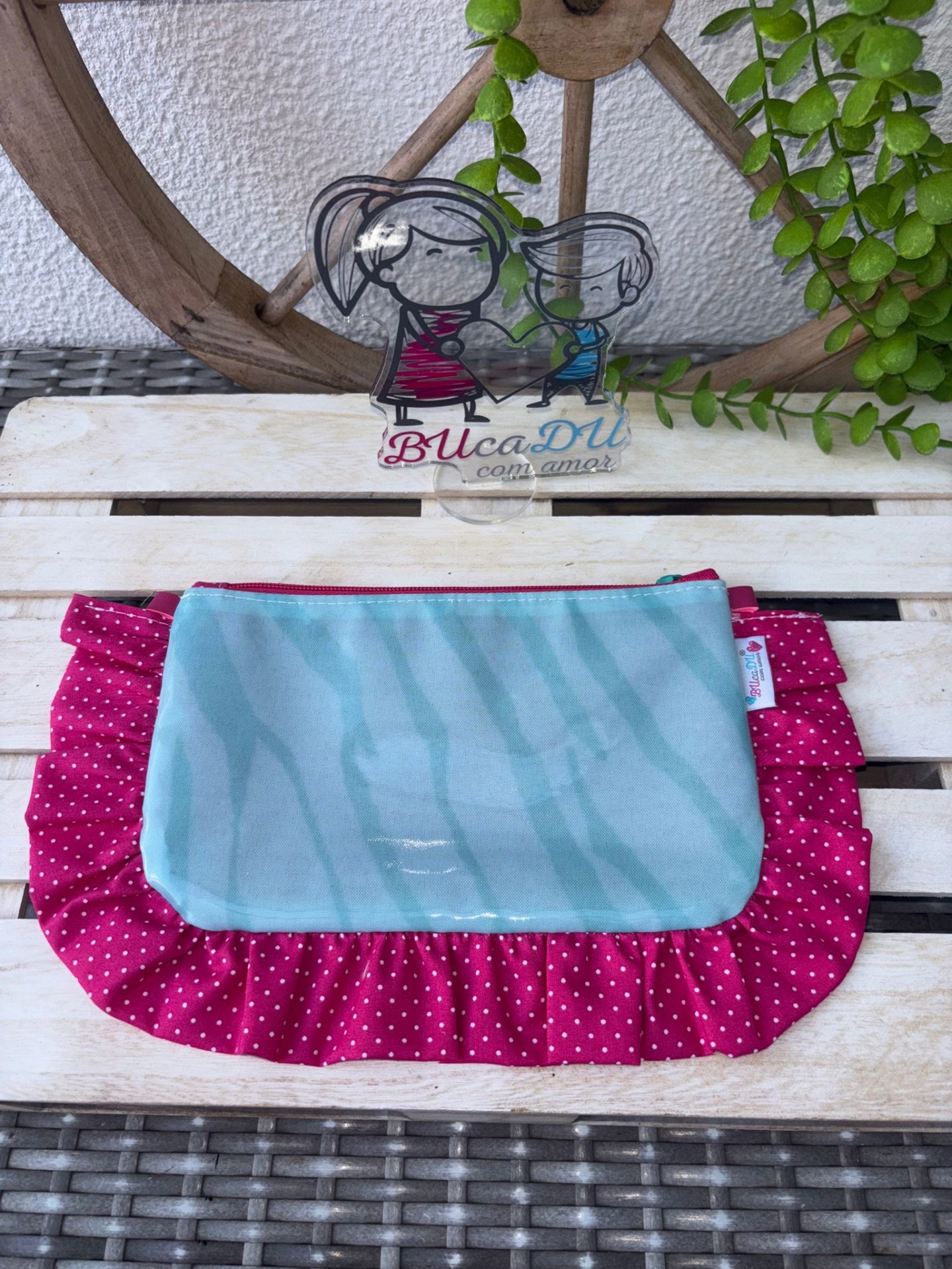 • Bolsa azul claro zebrada com bolsa vermelha de bolinhas brancas em superfície de madeira branca