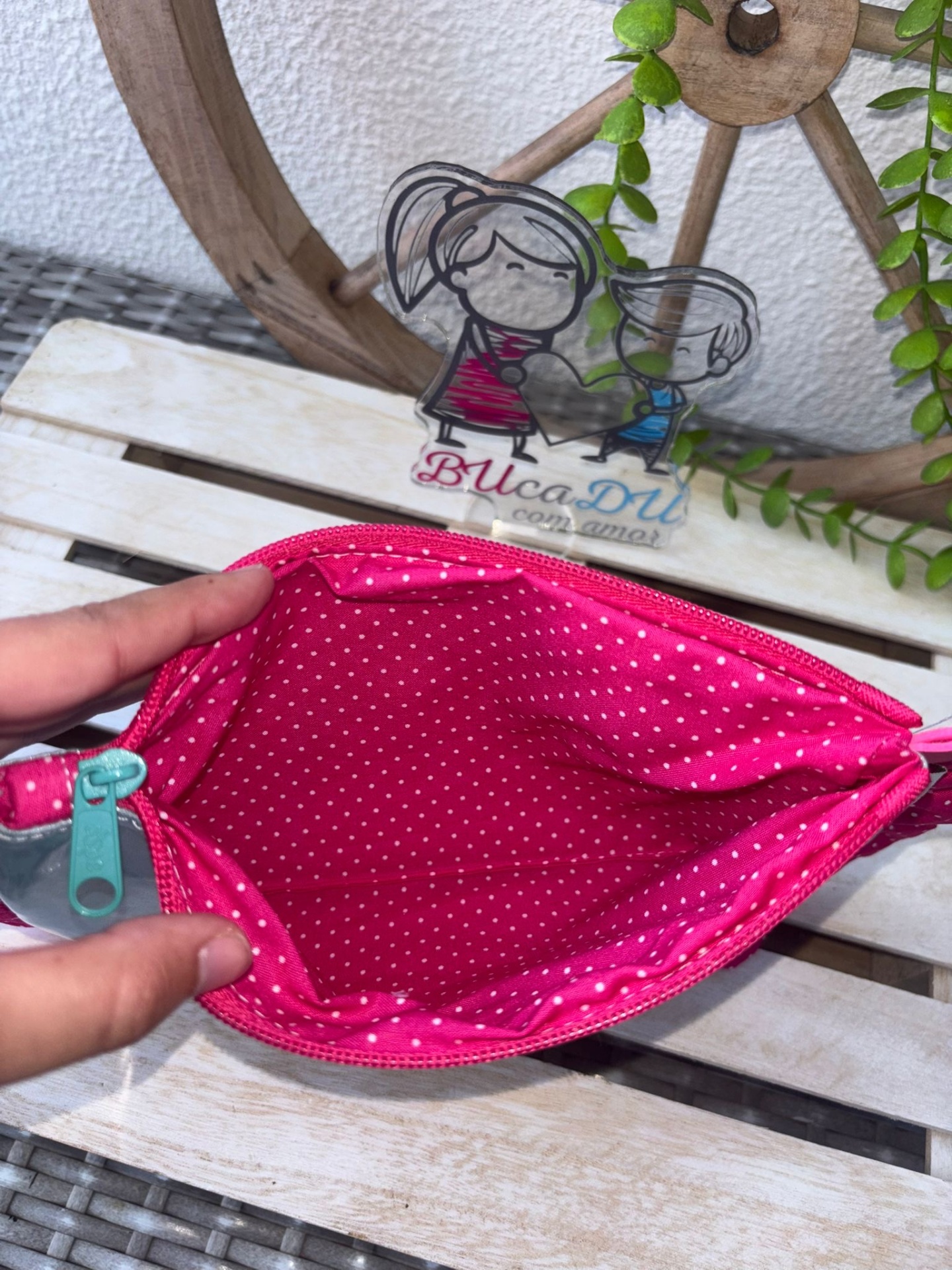 • Carteira rosa com interior de bolinhas brancas e fecho azul claro junto a roda de madeira e planta verde