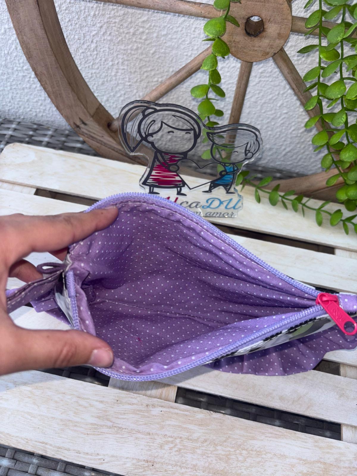 • Bolsa ou estojo com padrão colorido e fecho lilás sobre superfície de madeira clara.