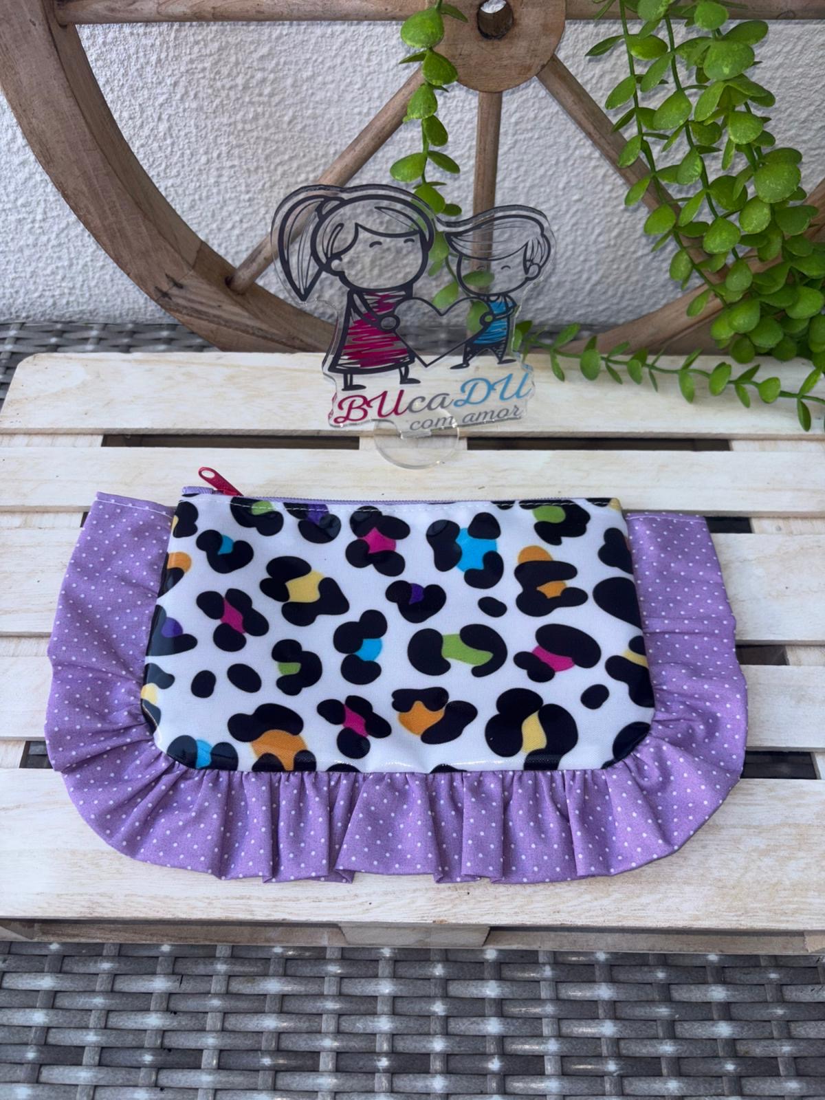 • Bolsa ou nécessaire com padrão animal multicolorido e tecido lilás com bolinhas brancas