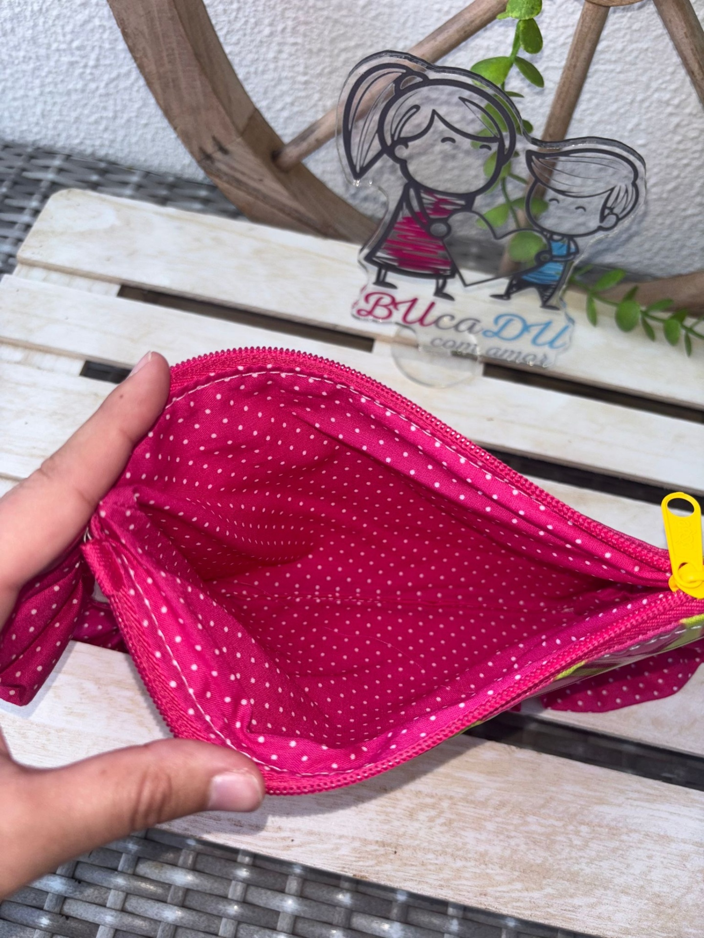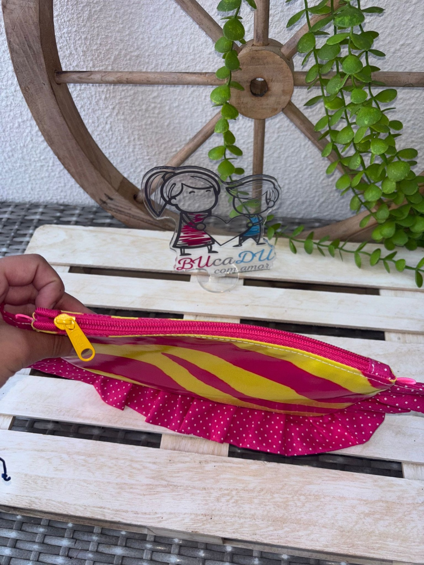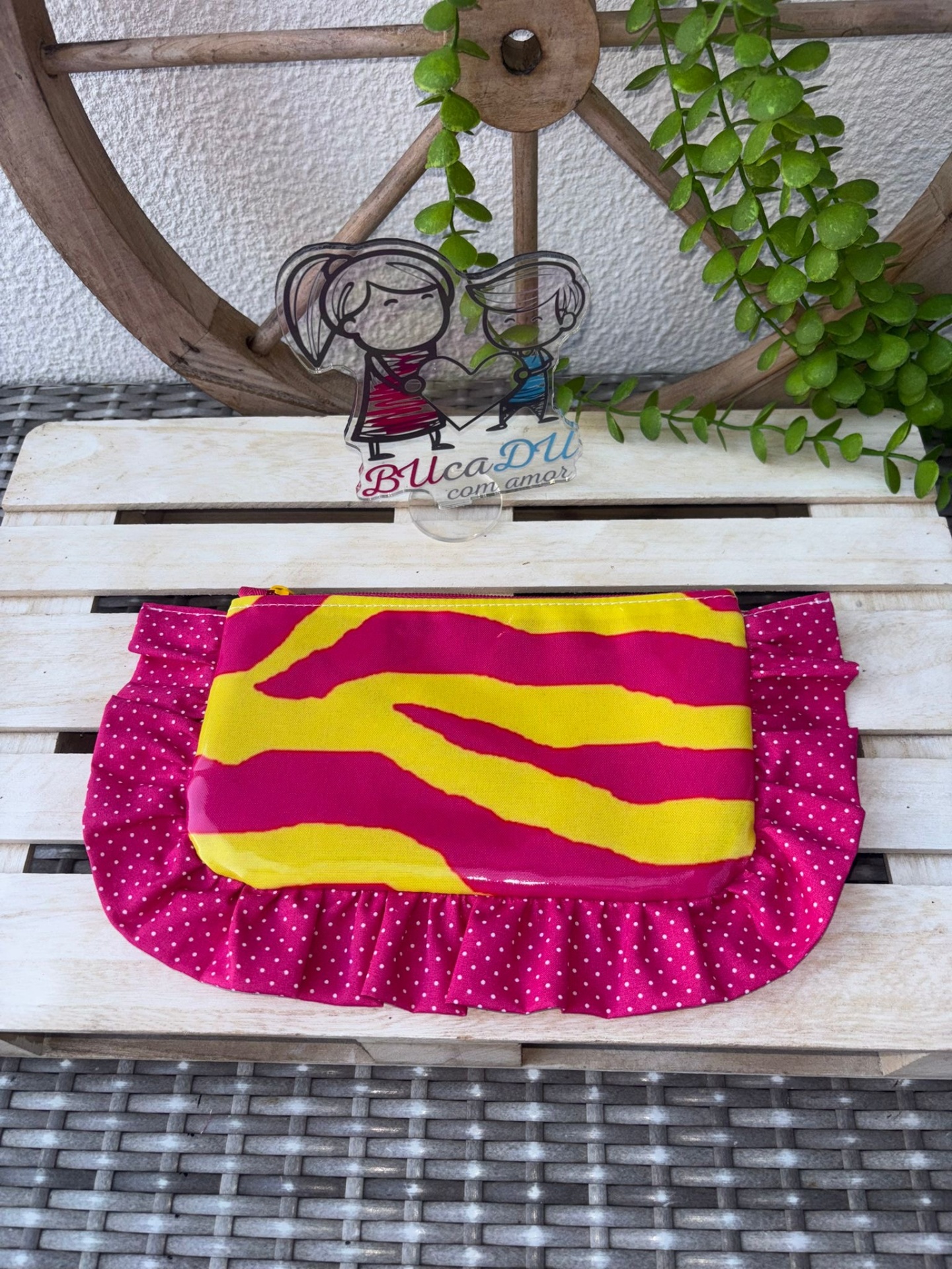 • Nécessaire amarelo e rosa com renda rosa de bolinhas em fundo de madeira clara com decoração de roda de madeira e plantas