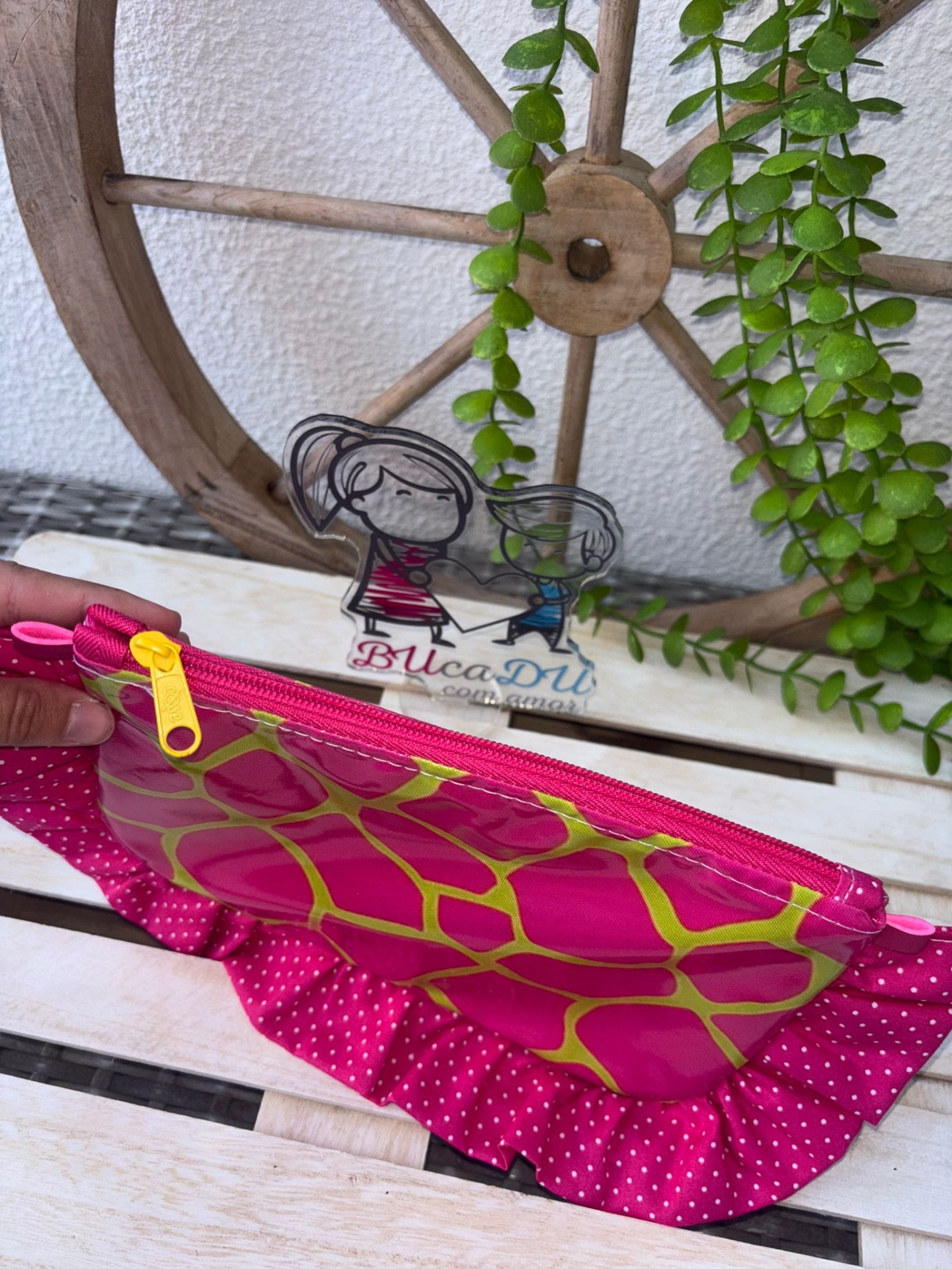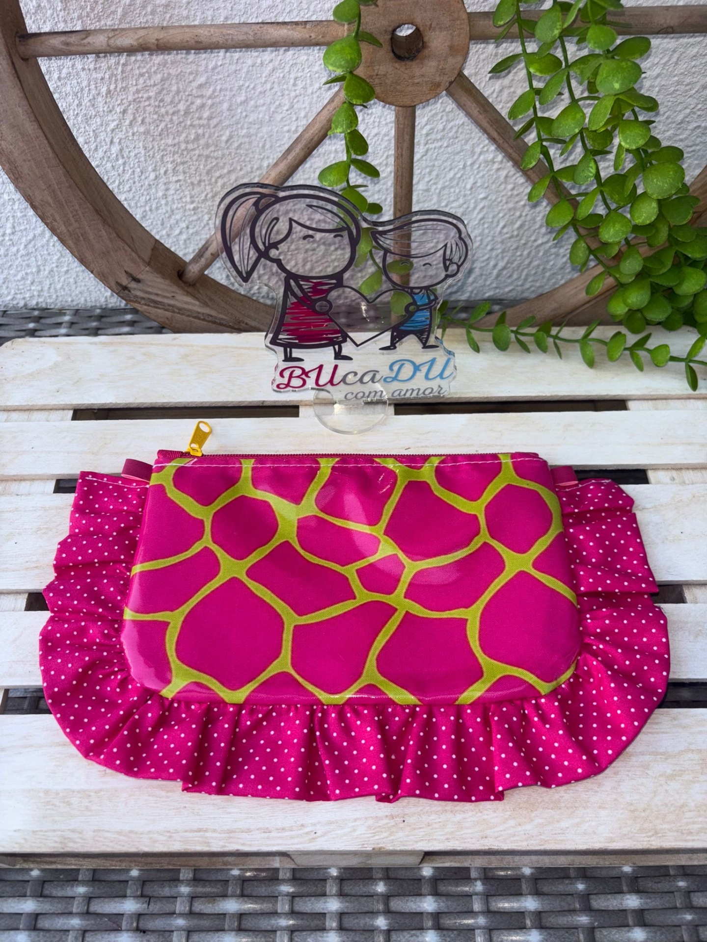 • Bolsa ou estojo rosa com padrão floral e folhos, fecho de correr amarelo, fundo com roda de madeira e planta verde.