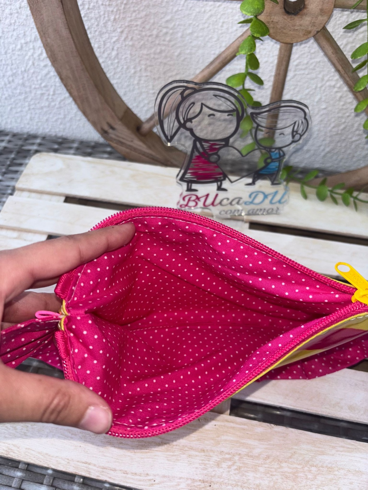 • Estojo ou bolsa rosa com interior de pontos brancos e fecho amarelo.