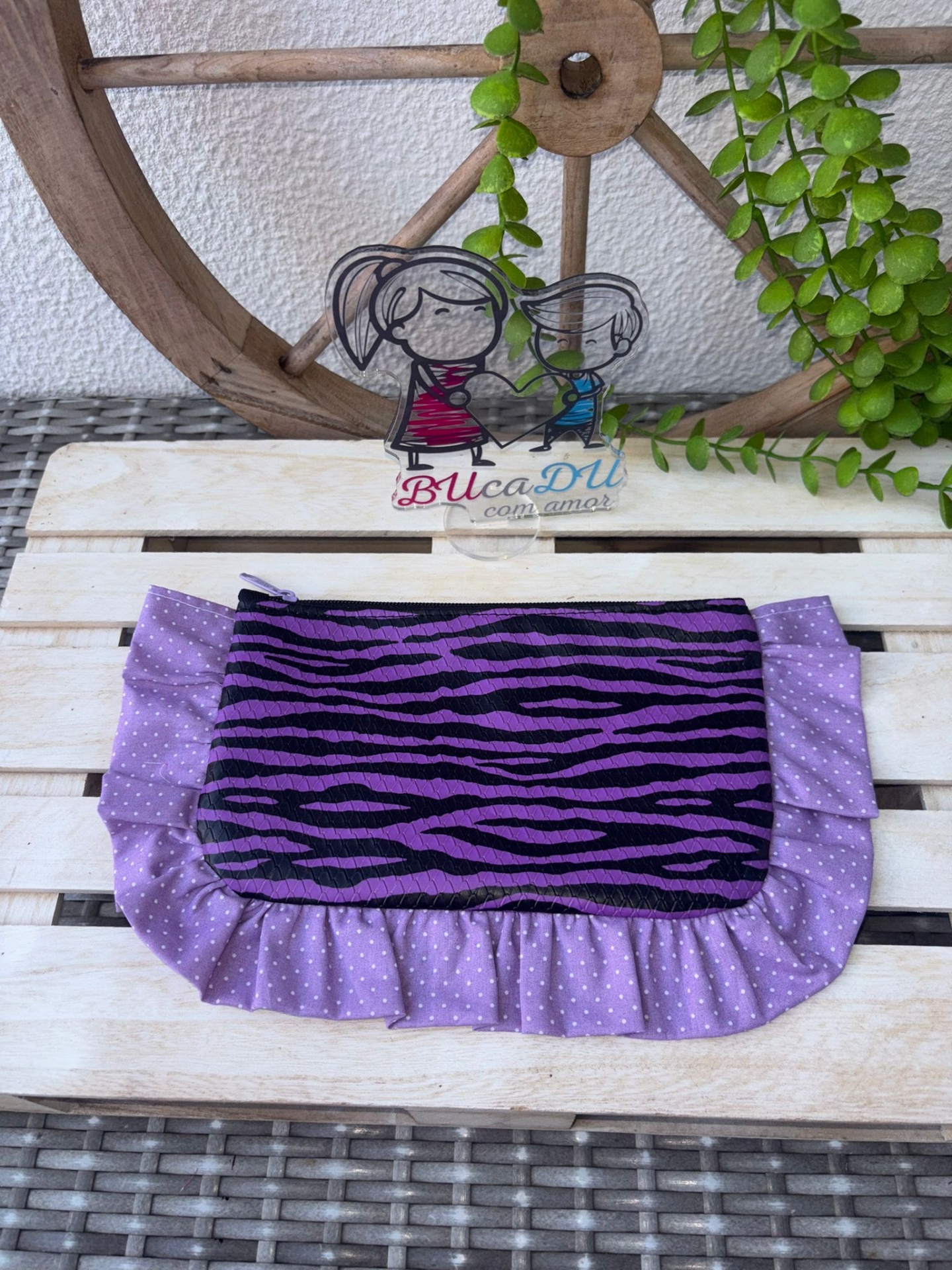 • Bolsa padrão zebra roxa com remate lilás e bolinhas brancas sobre base de madeira clara.