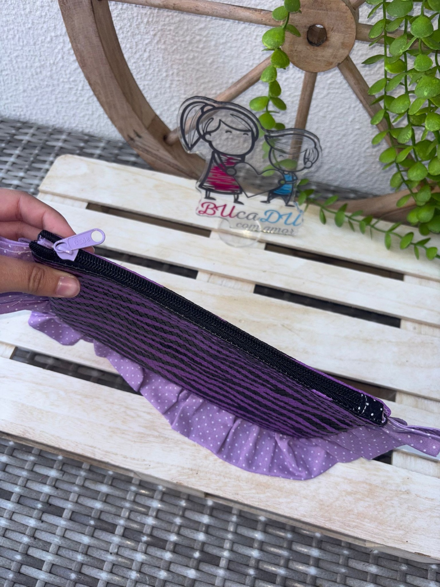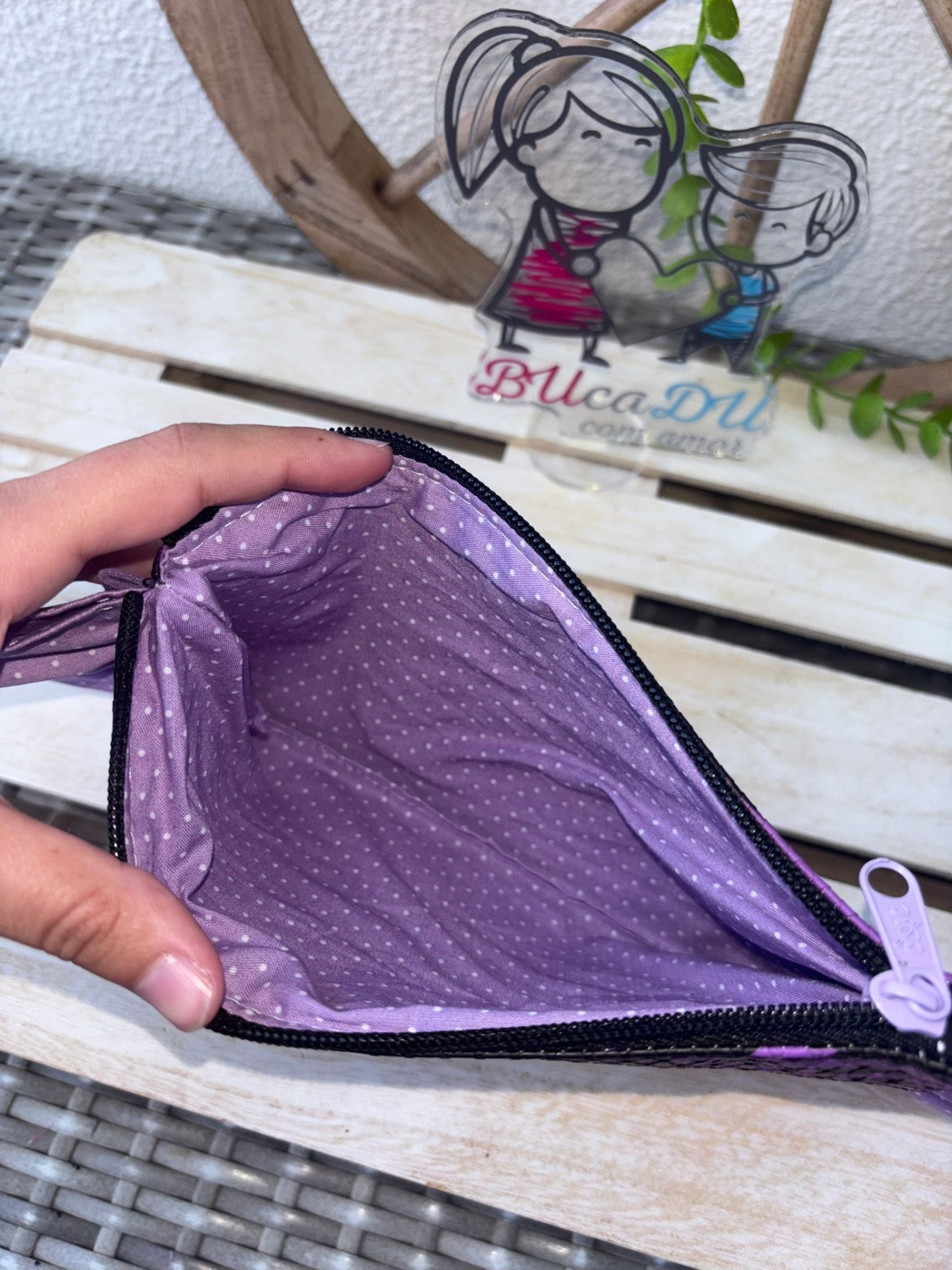 • Estojo roxo e preto com fecho lilás e detalhes em tecido lilás com bolinhas