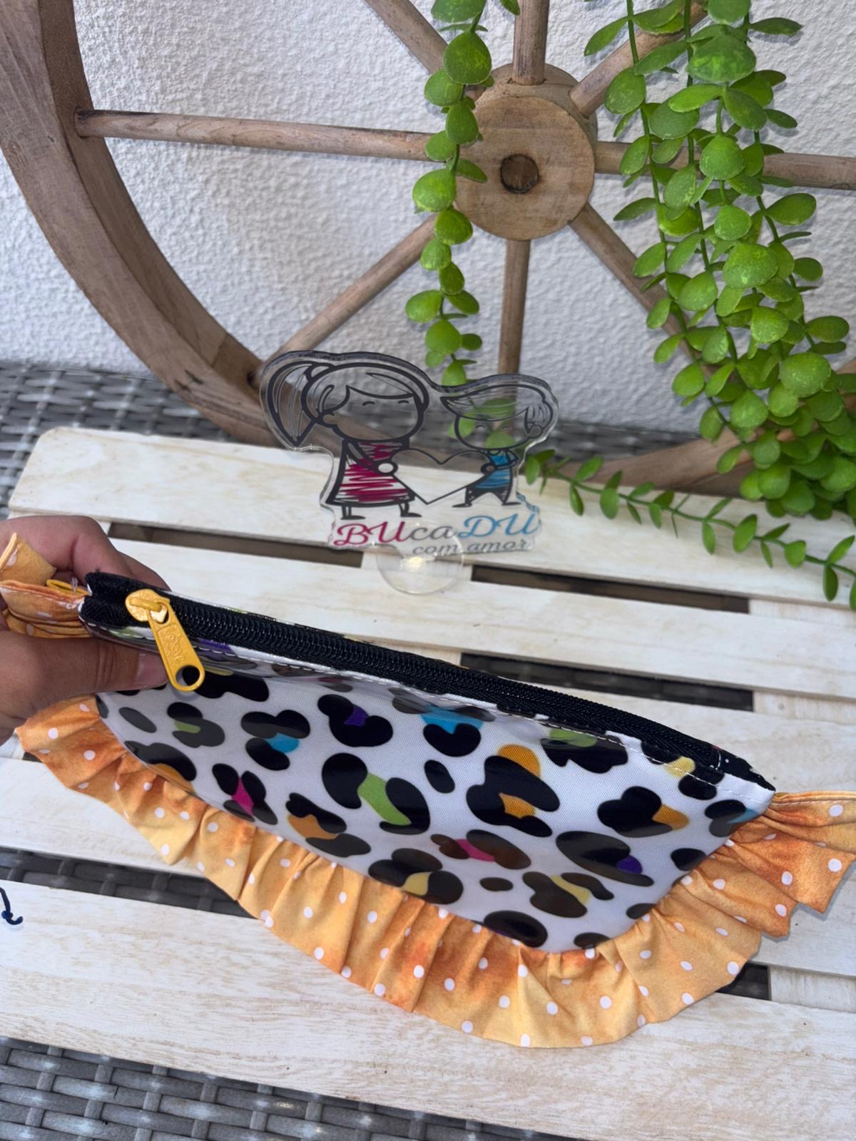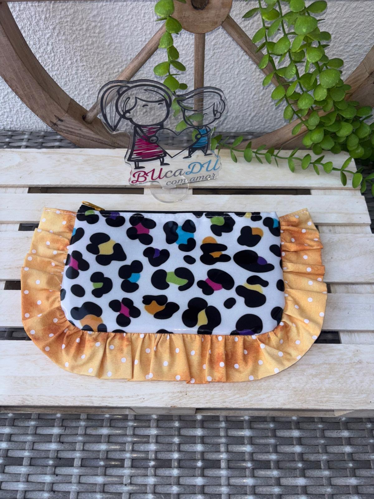 Estojo com padrão animal print e borda amarela com bolinhas brancas