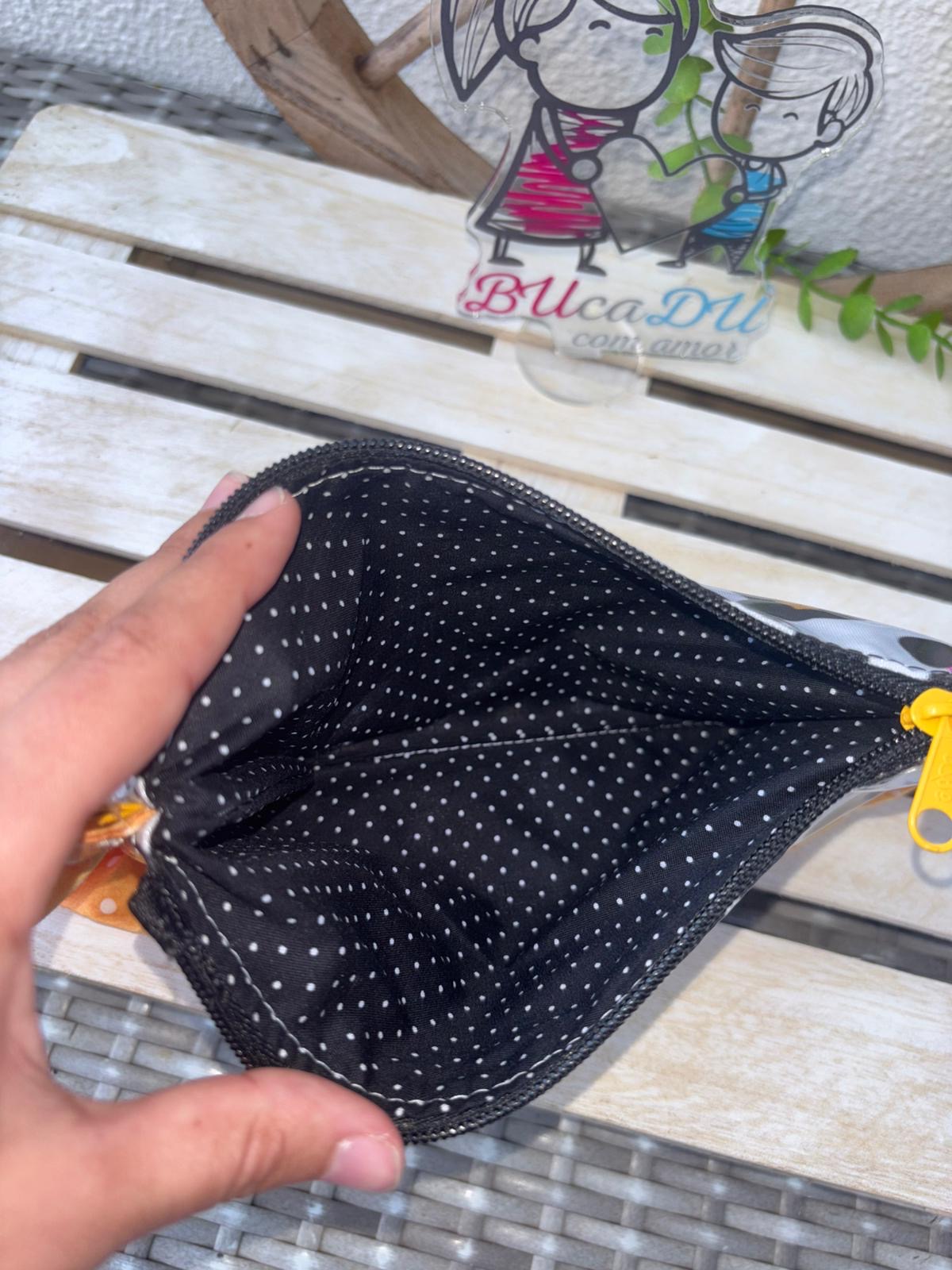 • Carteira pequena com interior preto de bolinhas brancas e fecho amarelo aberta na mão