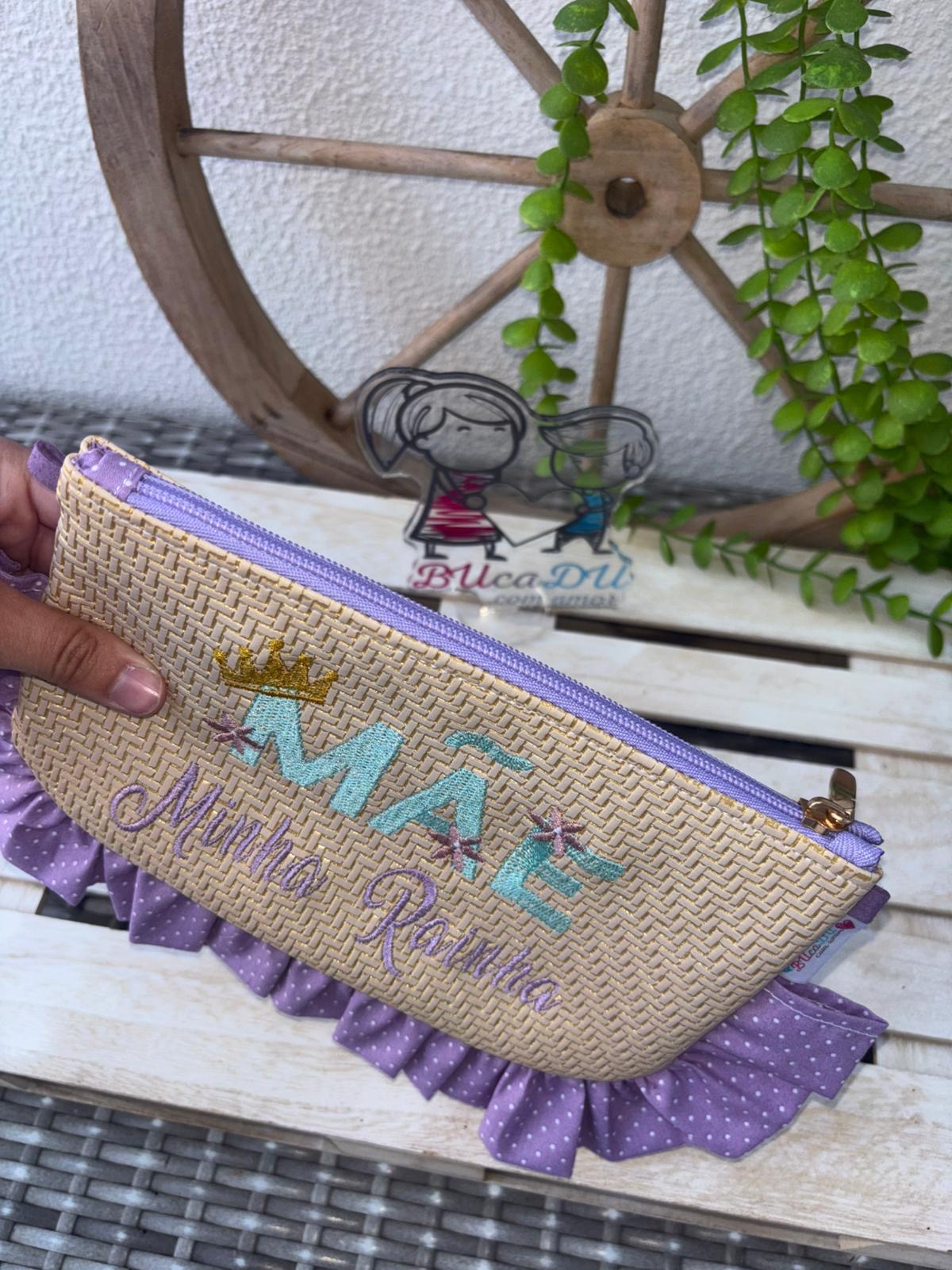 • Estojo castanho com fecho lilás e babado lilás com bolinhas brancas, bordado com texto MÃE Minha Rainha.
