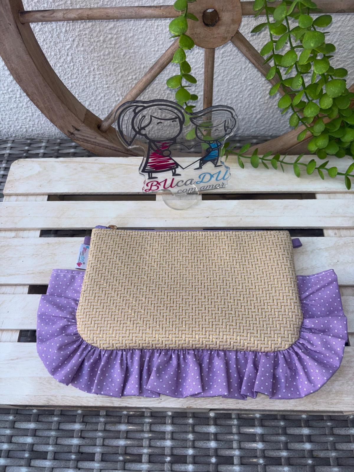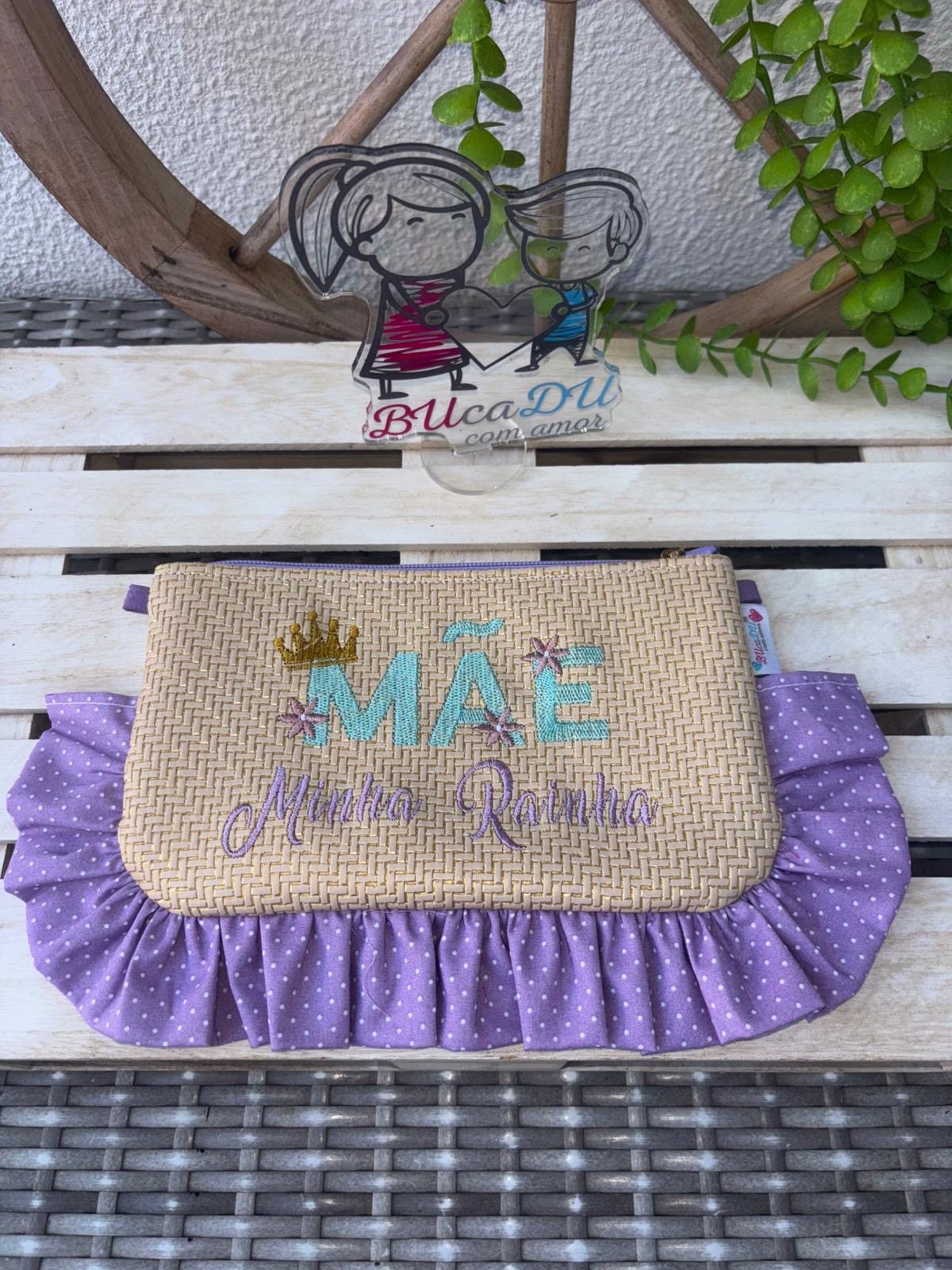 • Necessaire artesanal com bordado escrito MÃE Minha Rainha e babado lilás com bolinhas brancas.