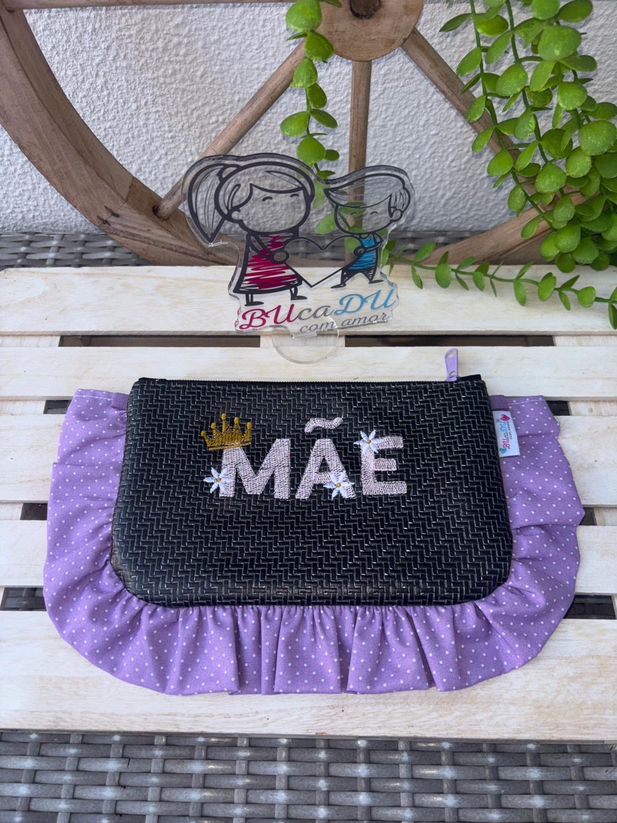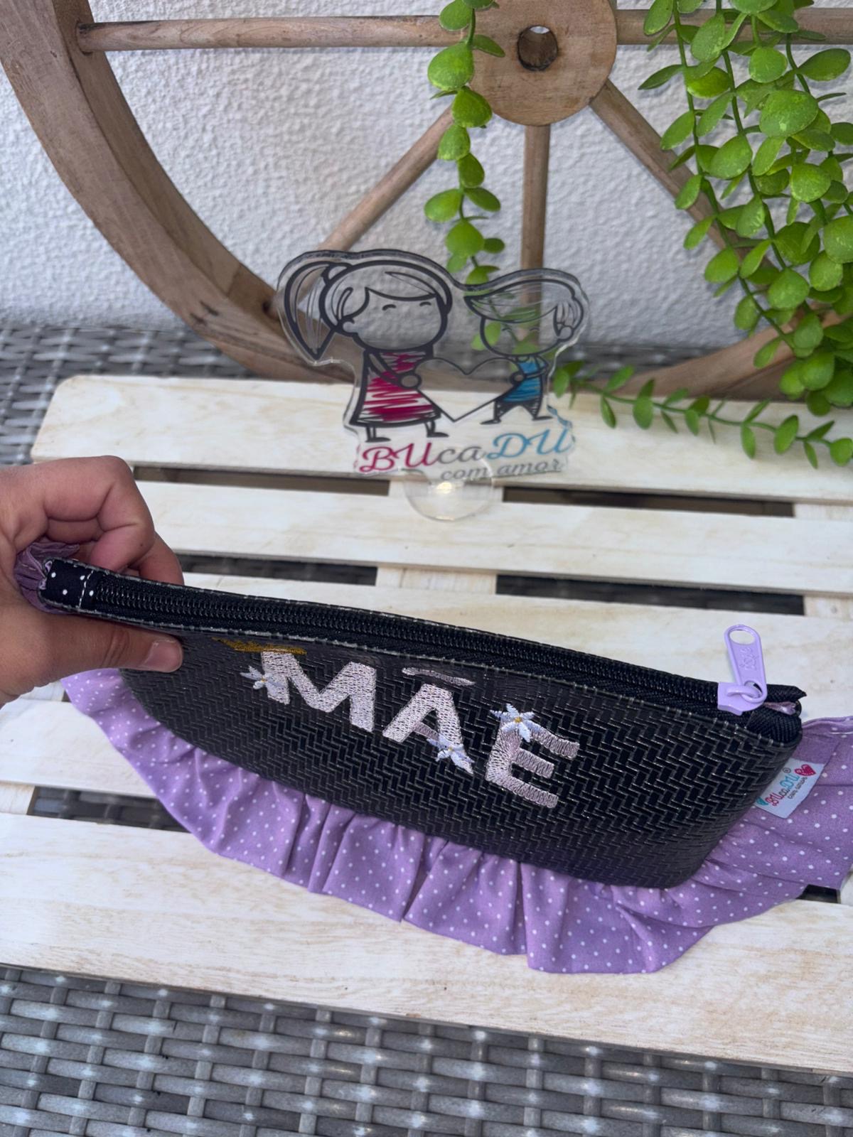 • Estojo preto com base lilás com bolinhas brancas, bordado MAE, em mesa de madeira com roda de madeira e plantas