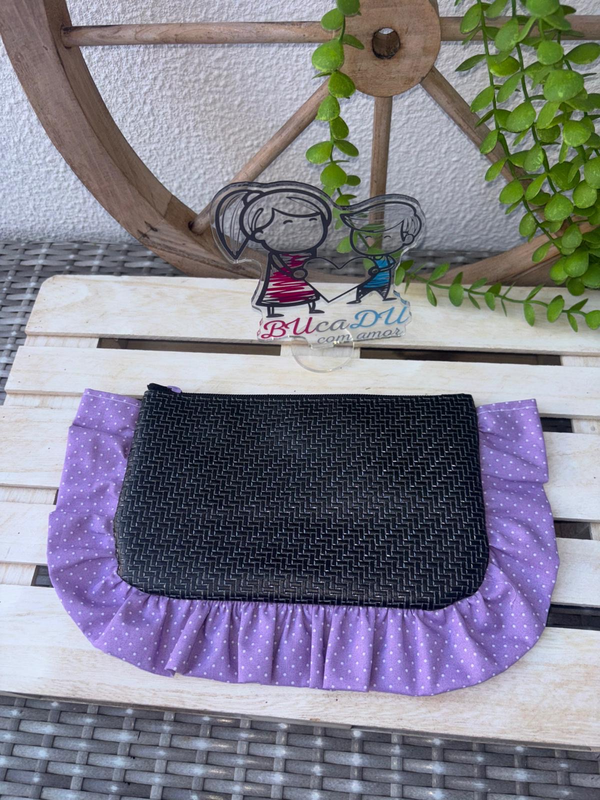 • Carteira preta e lilás com bolinhas brancas sobre base de madeira clara com planta e roda de madeira.