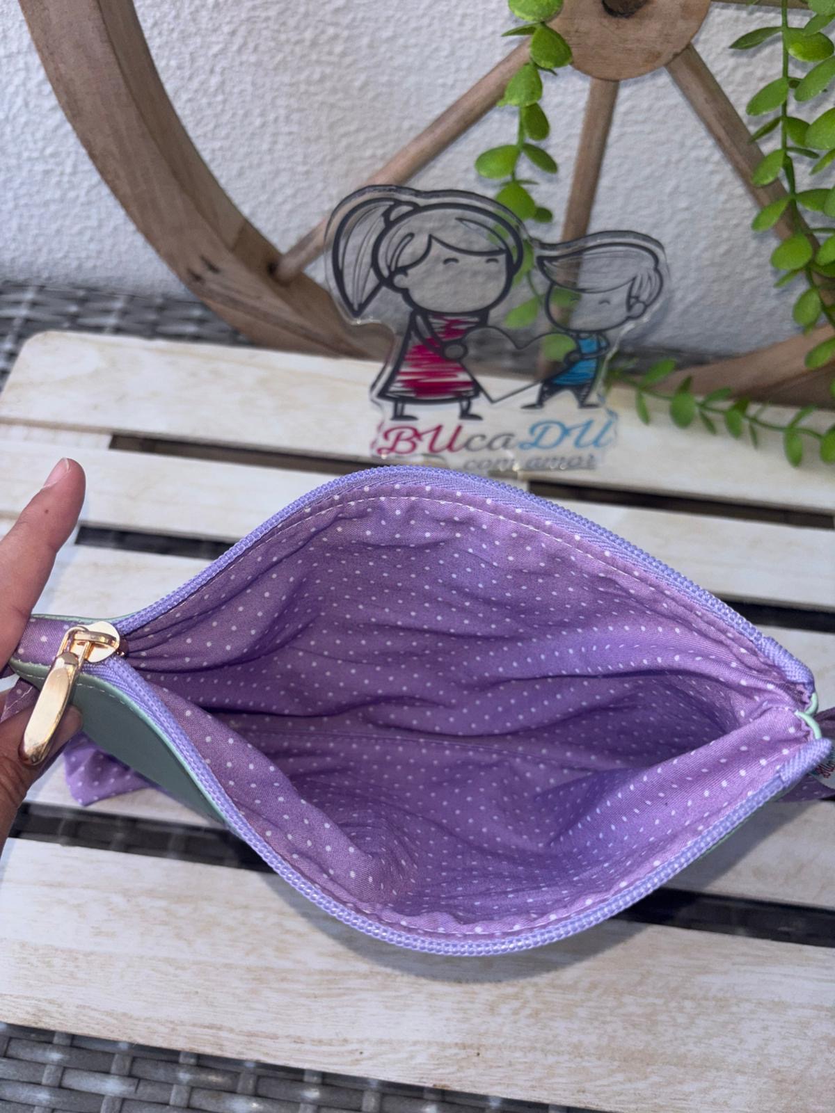 • Bolsa pequena lilás com interior de pontos brancos e fecho dourado