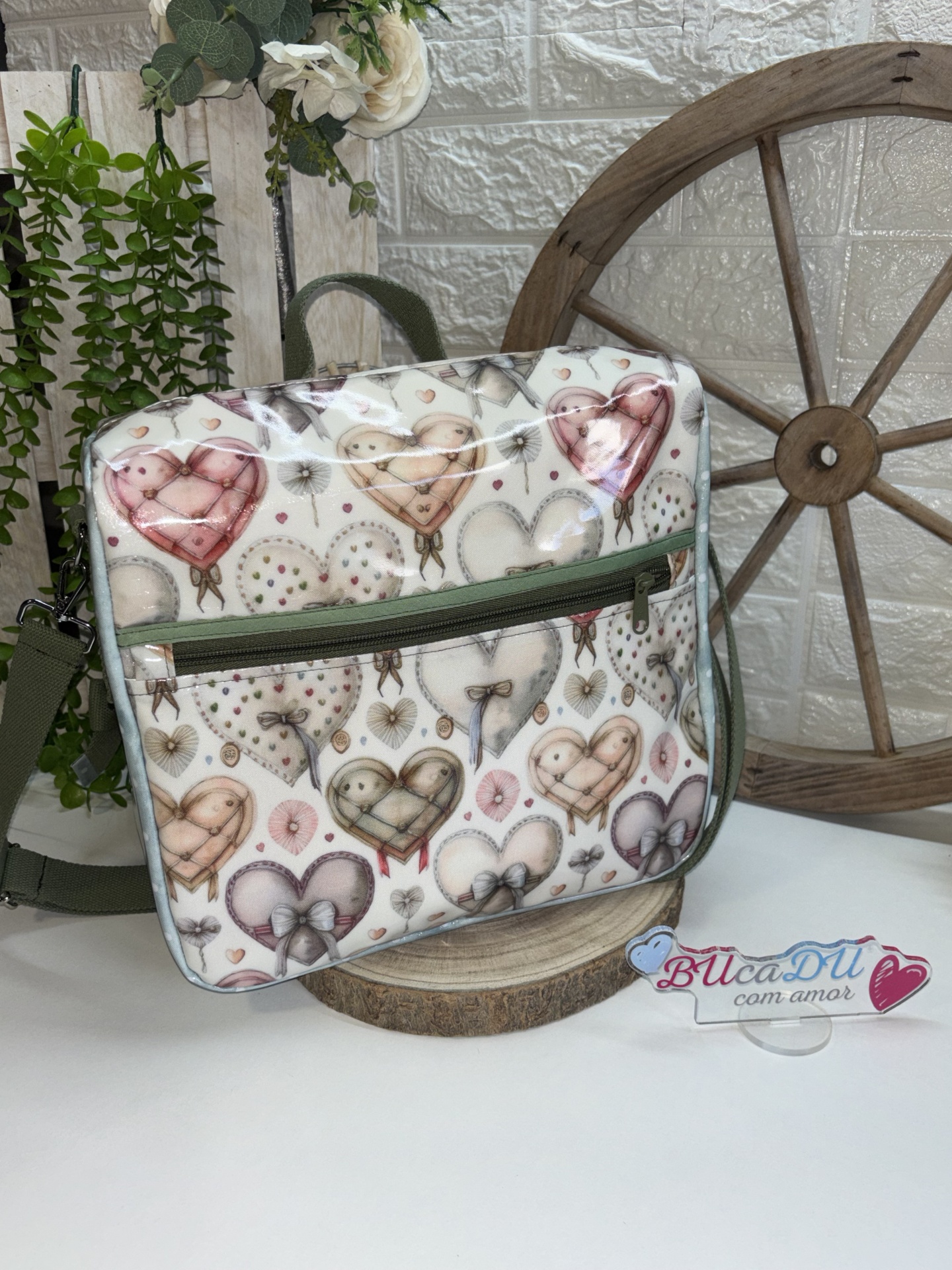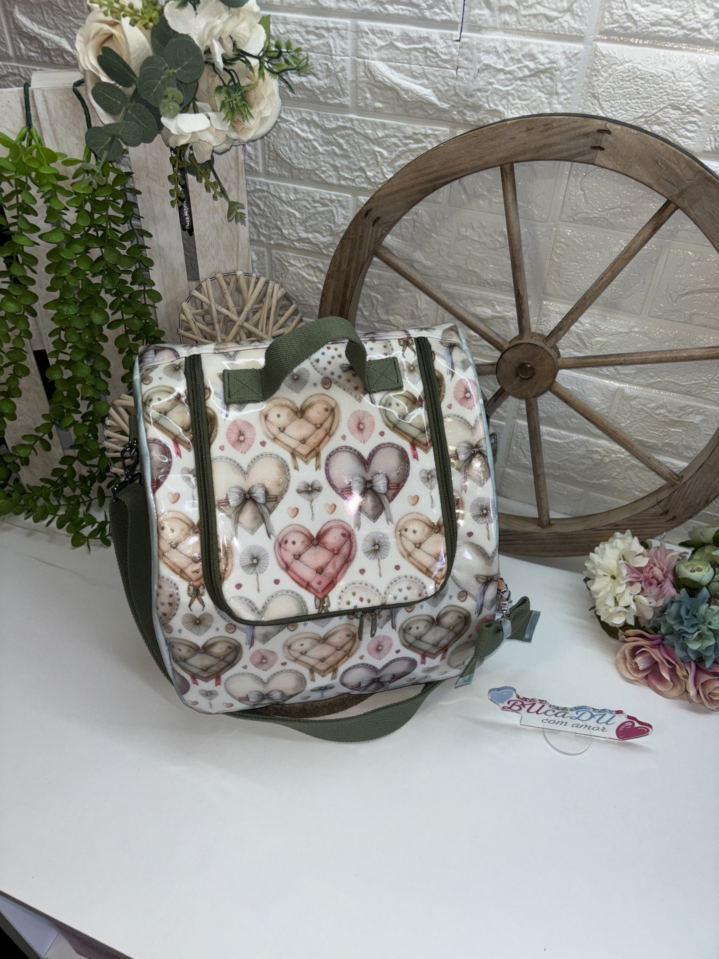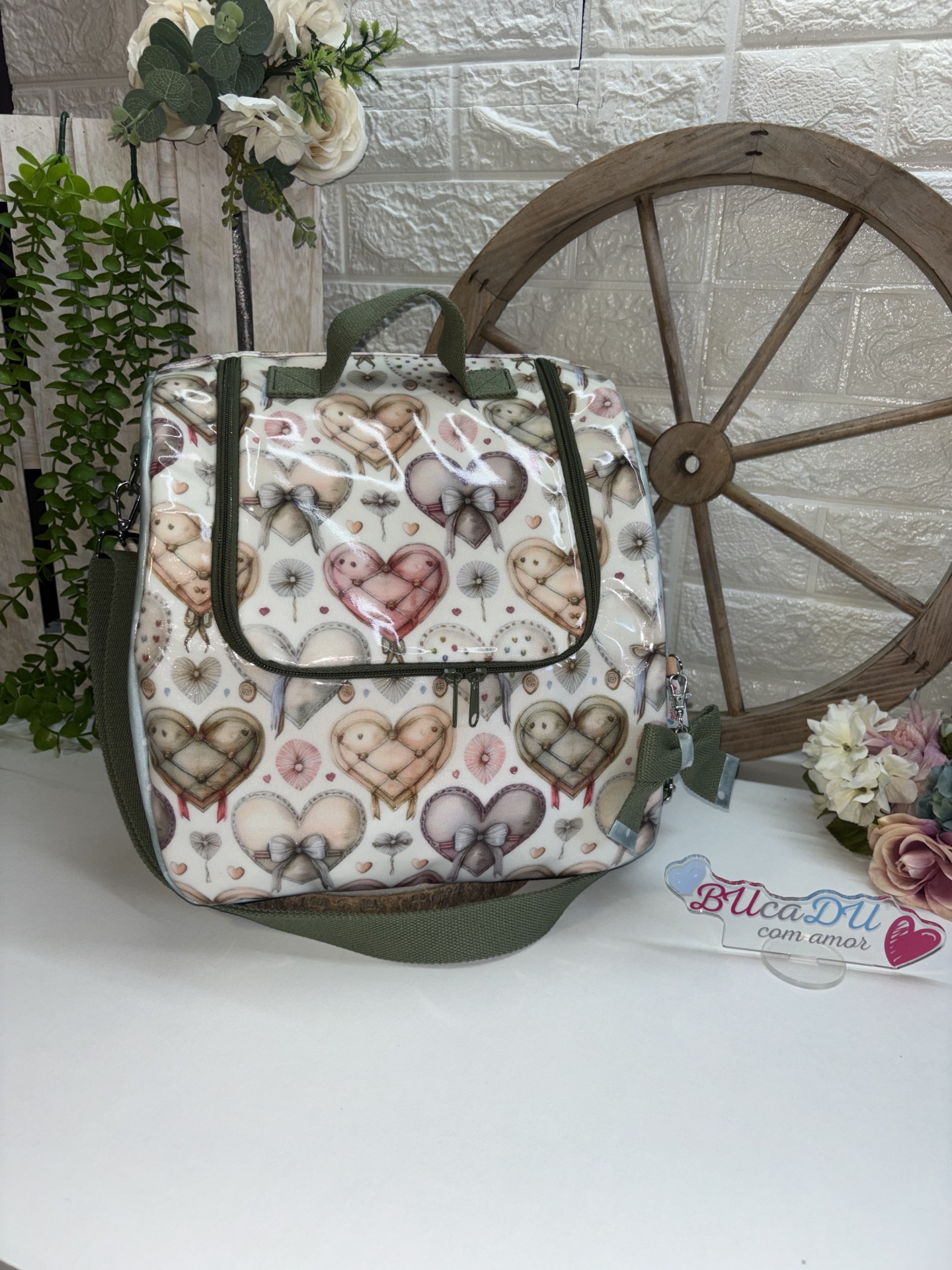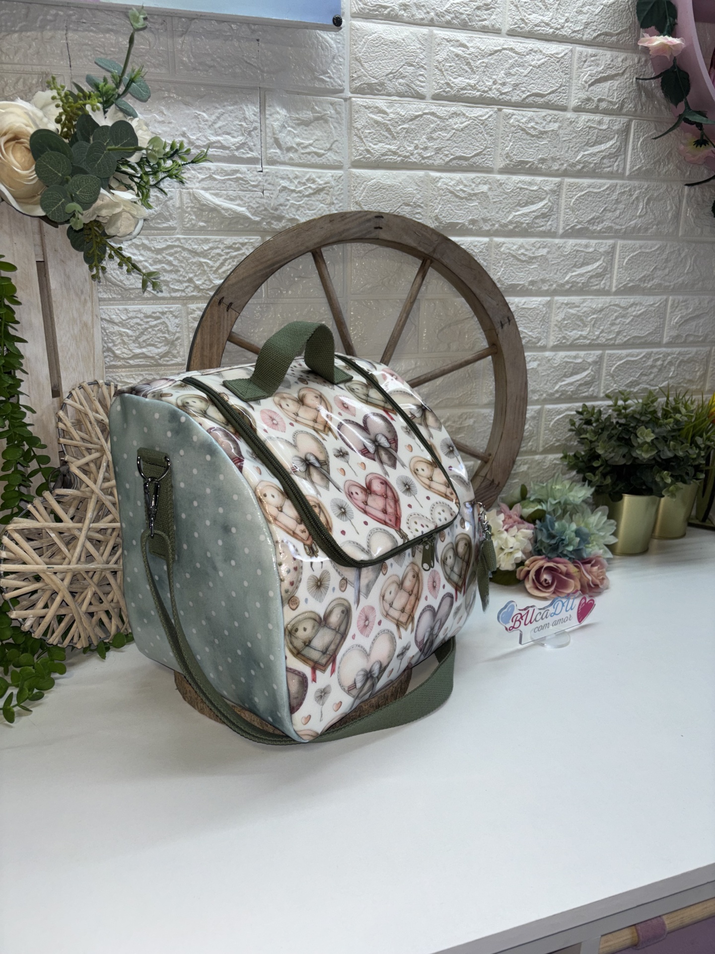 • Mala térmica estampada com corações e coelhos sobre mesa branca com decoração de plantas