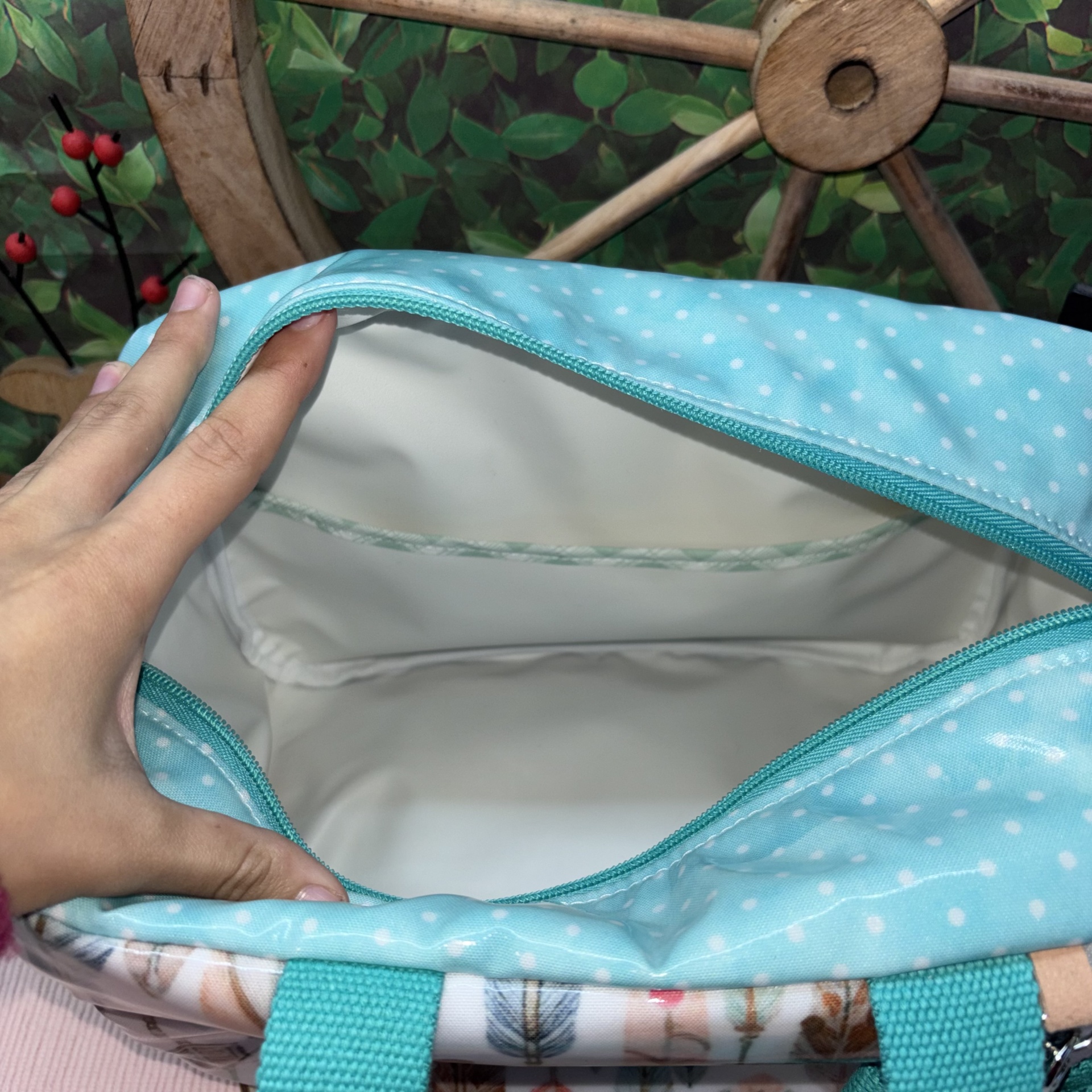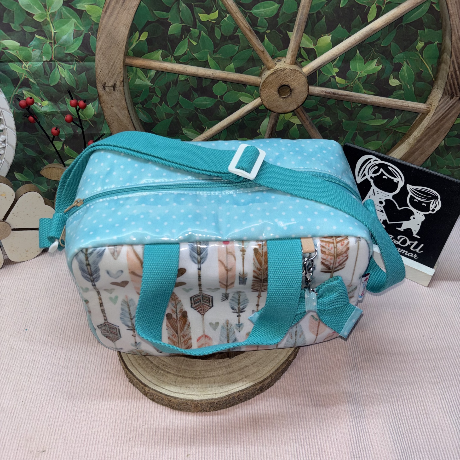 • Mala pequena azul com padrão de penas coloridas e bolinhas
