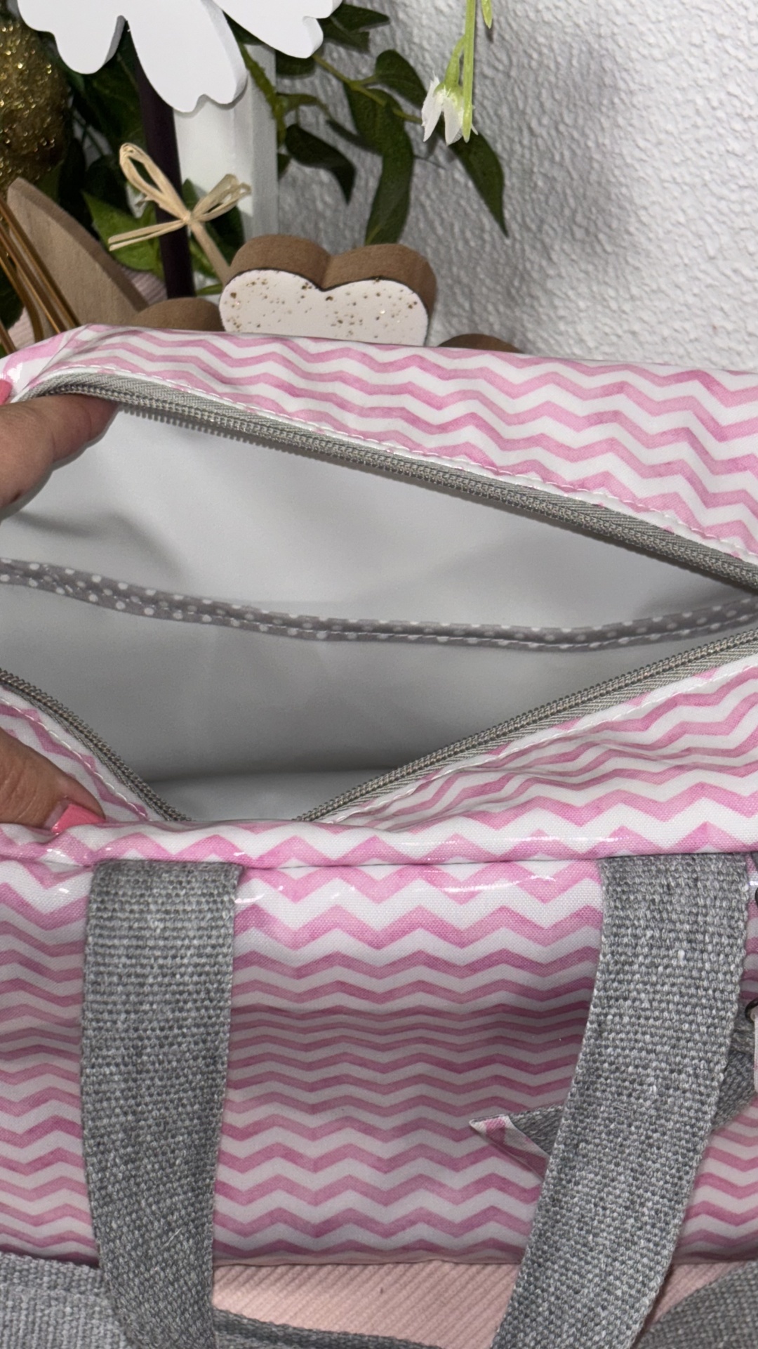 • Bolsa ziguezague rosa e branco com alças cinzentas, aberta com interior cinzento claro