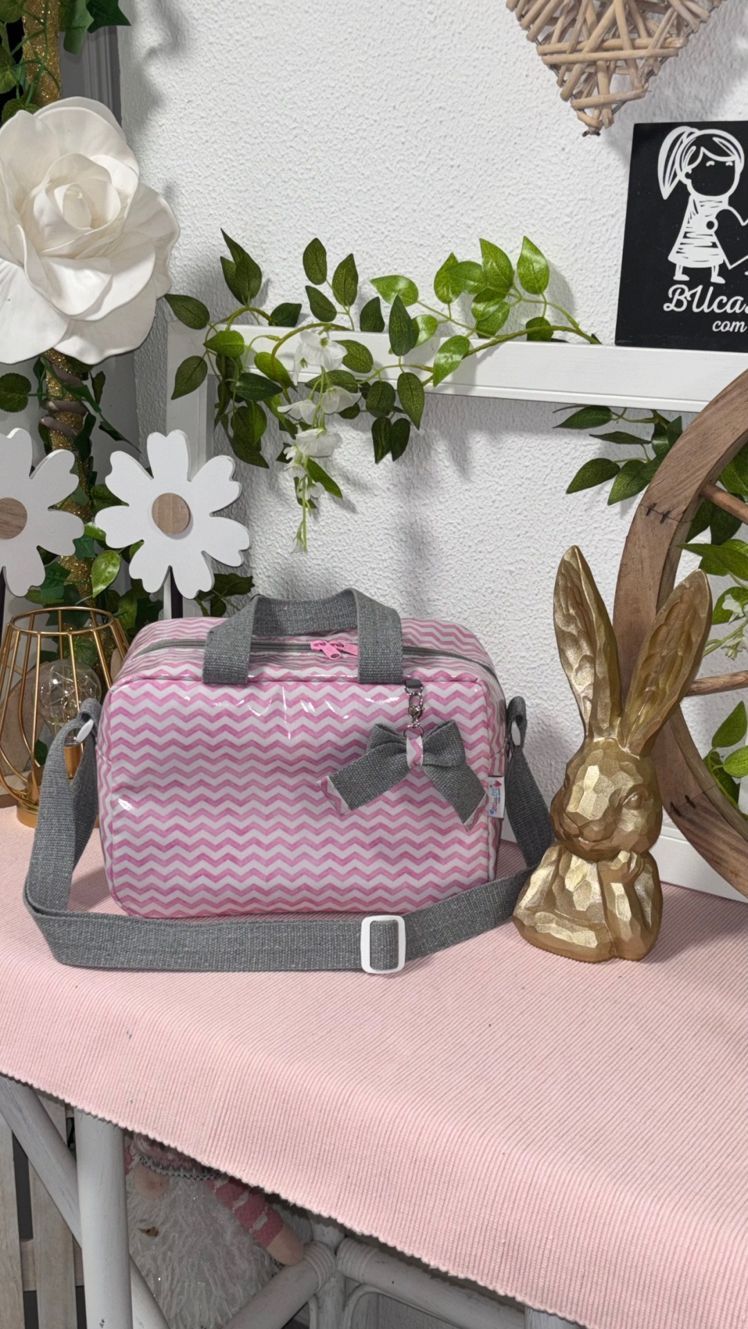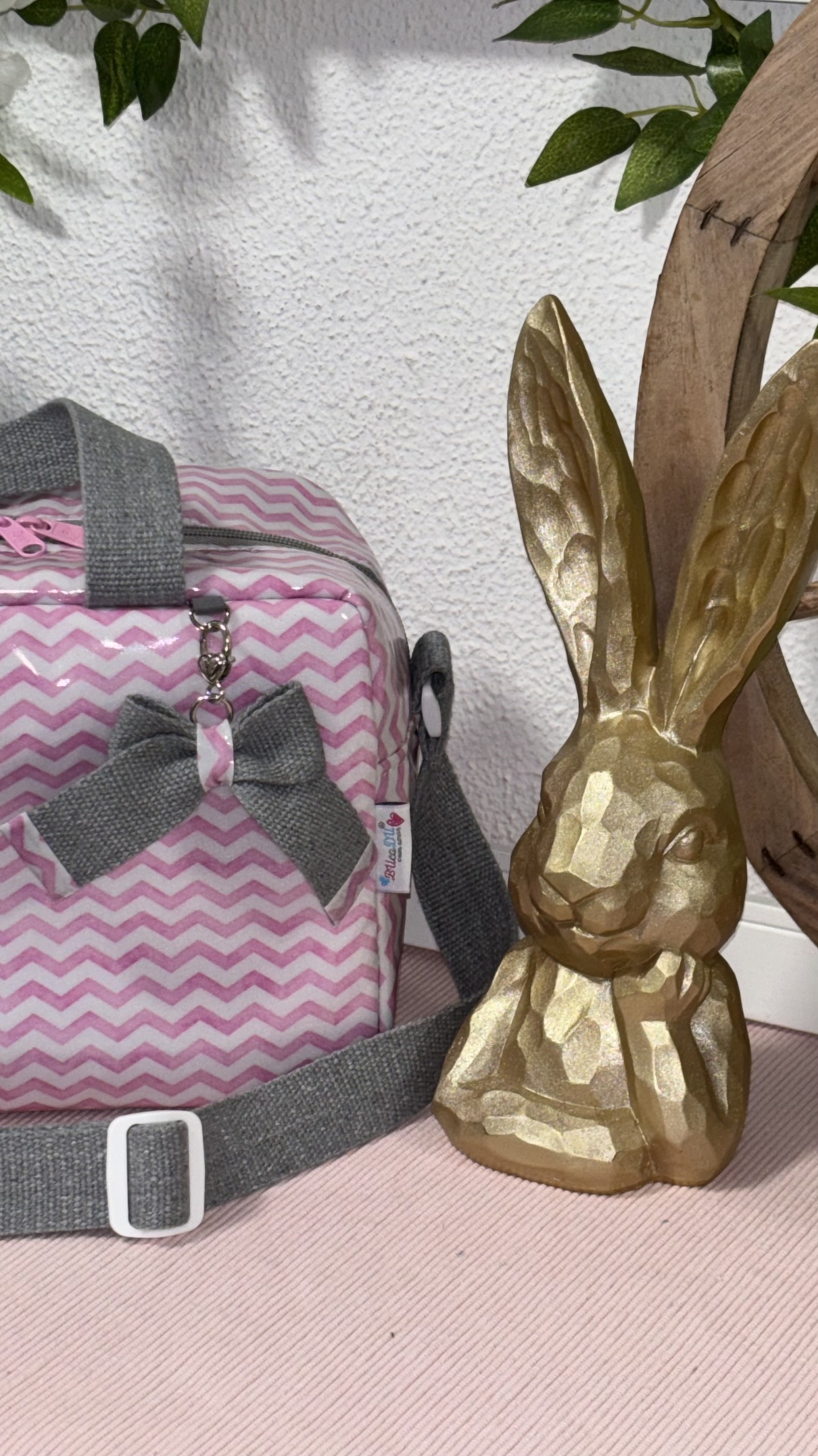 • Bolsa rosa para criança com padrão ziguezague e alça cinza junto a decoração com coelho dourado e flores.