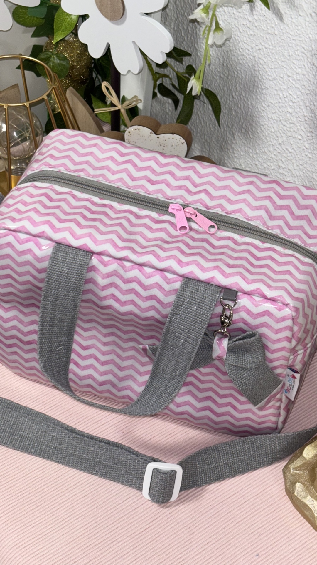 • Bolsa retangular rosa com padrão zig zag e alças cinzentas