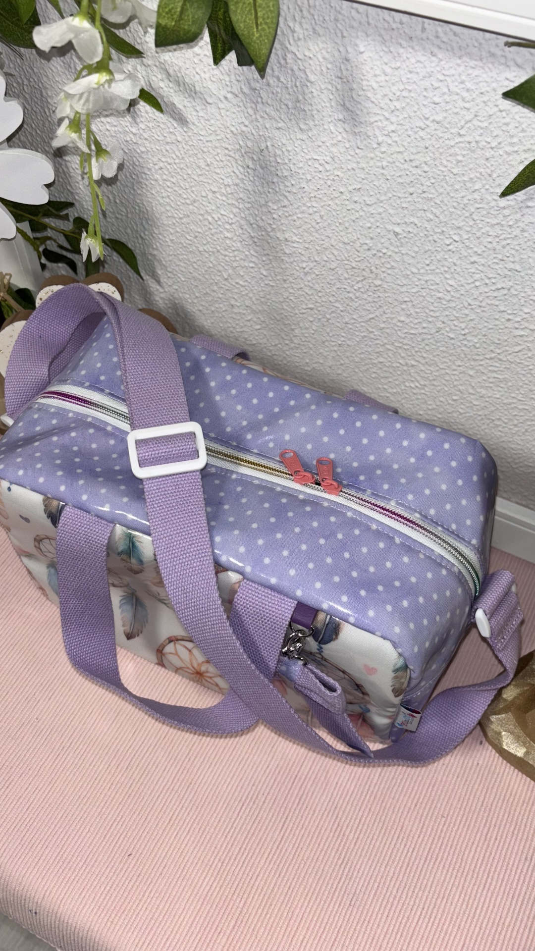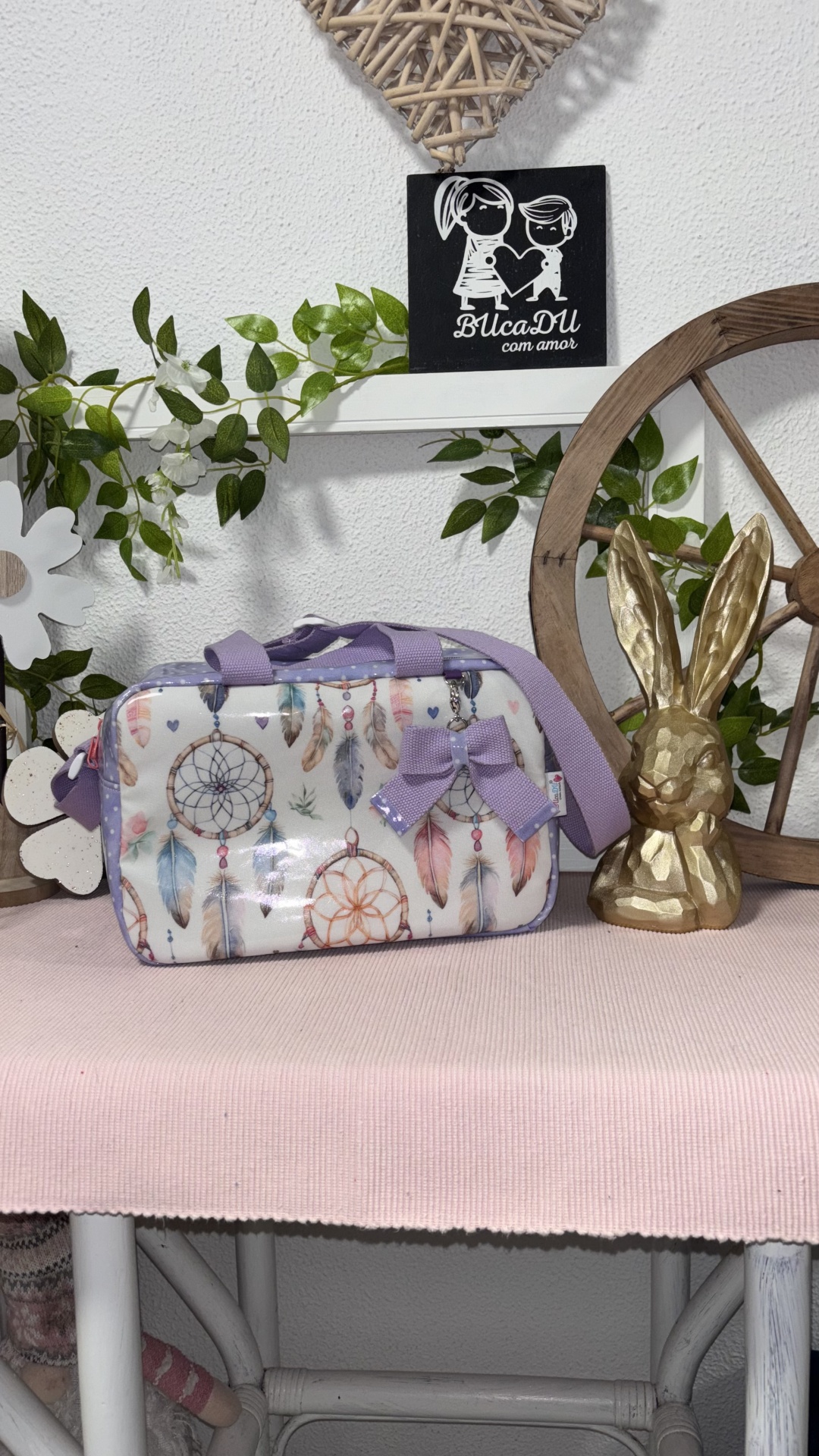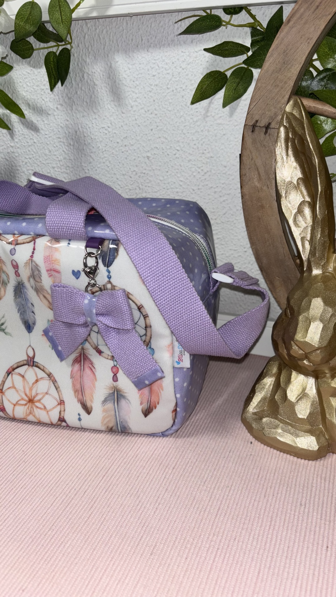 • Mala pequena lilás com padrão de penas e apanhadores de sonho e alça lilás