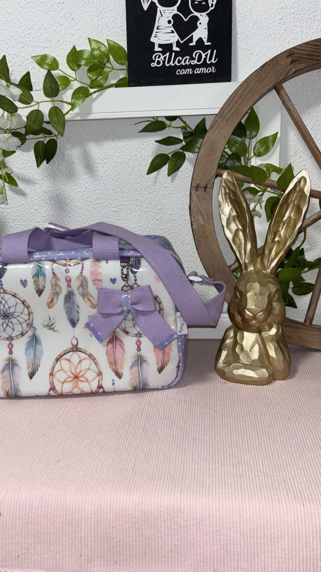 Mala decorativa com padrão de apanhadores de sonhos em tons lilás e creme