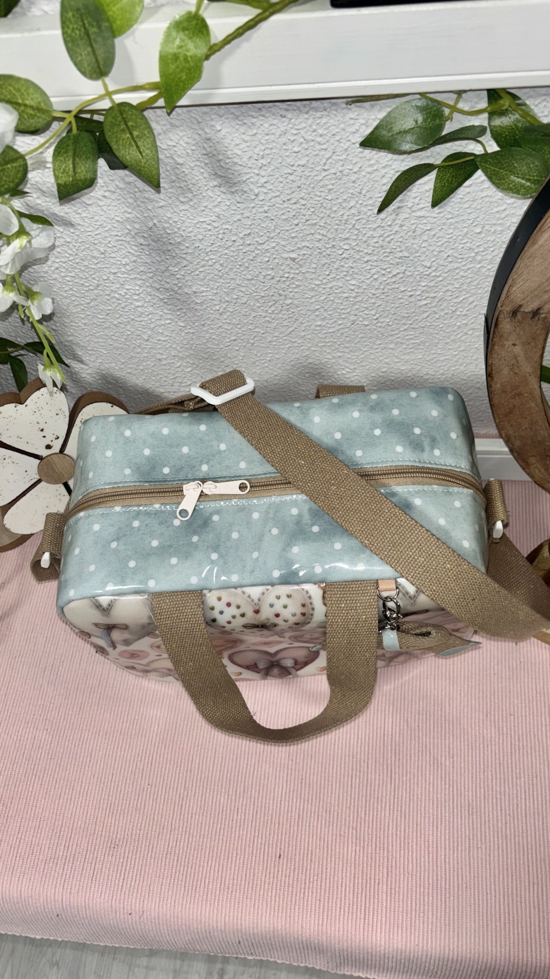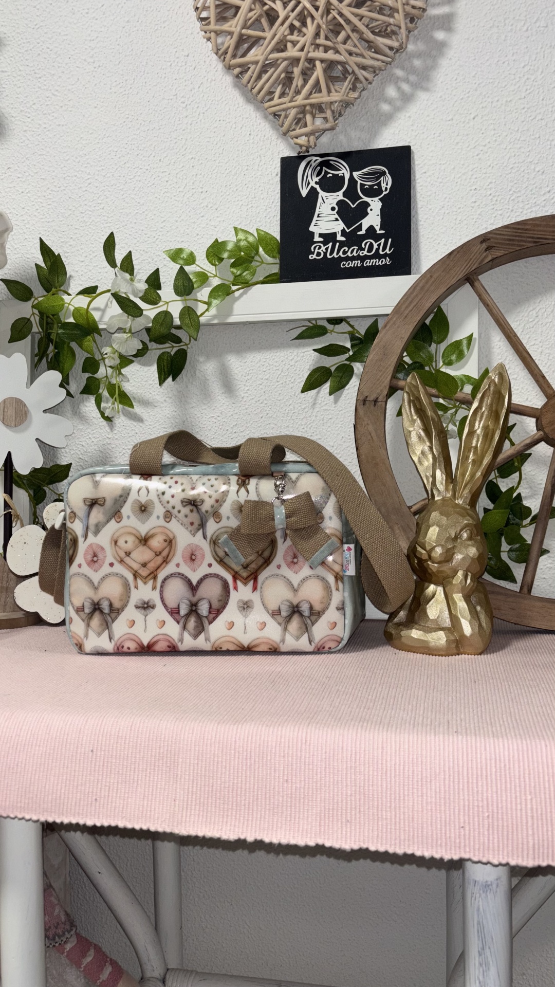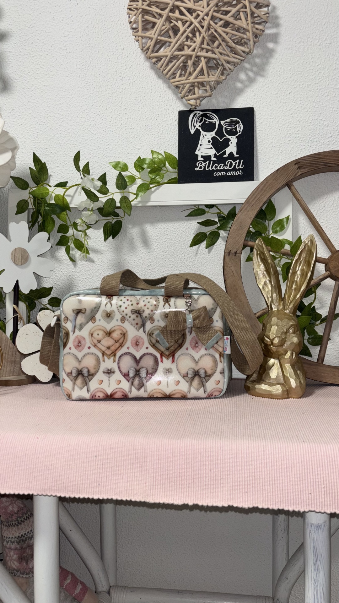• Bolsa com padrão de corações em tons pastel sobre mesa rosa com decoração verde, coração de vime, placa preta com texto e cabeça de coelho dourada