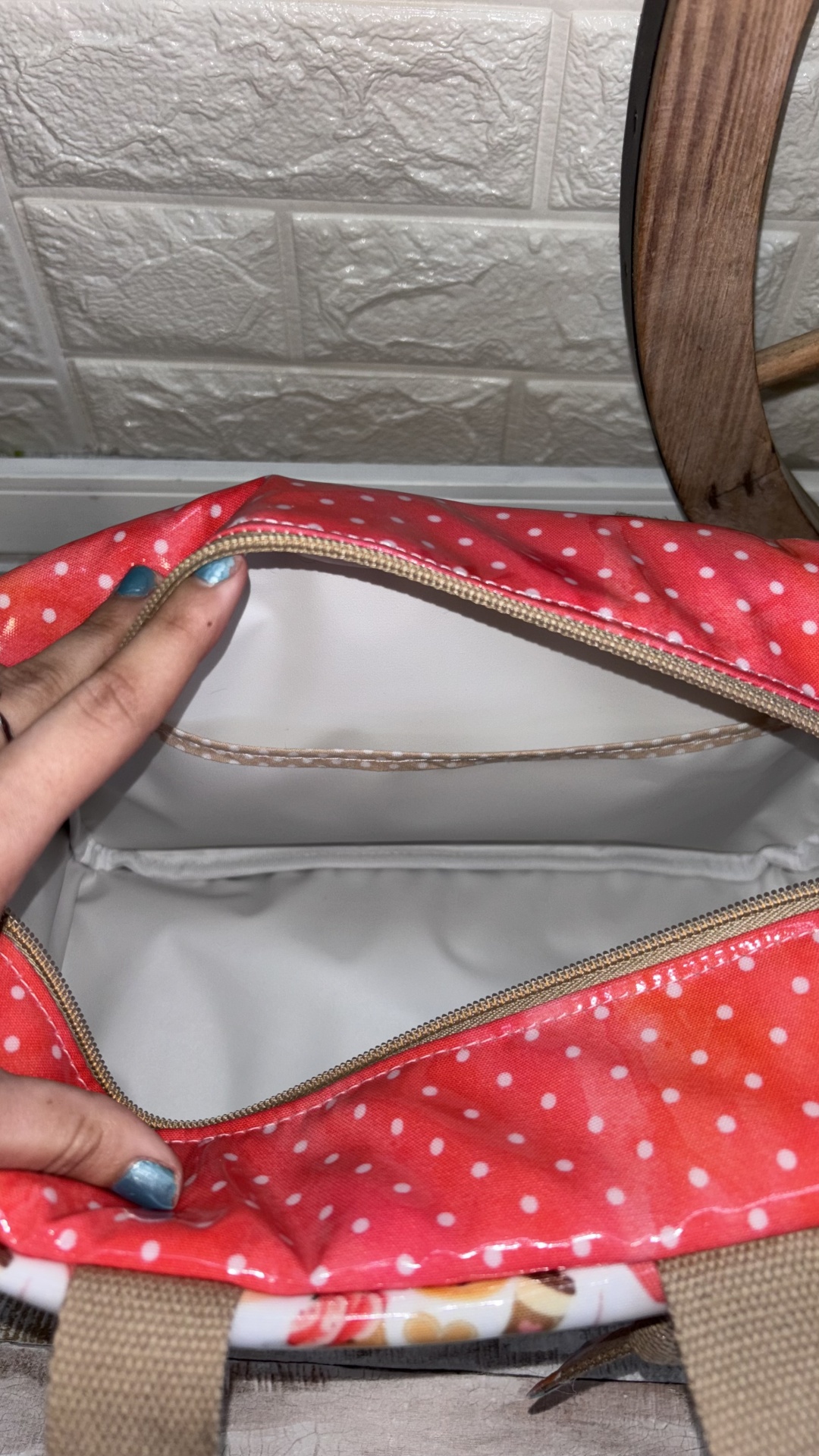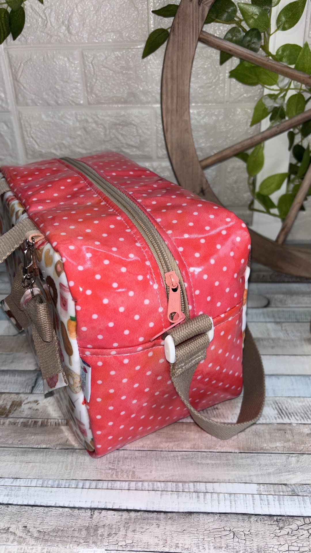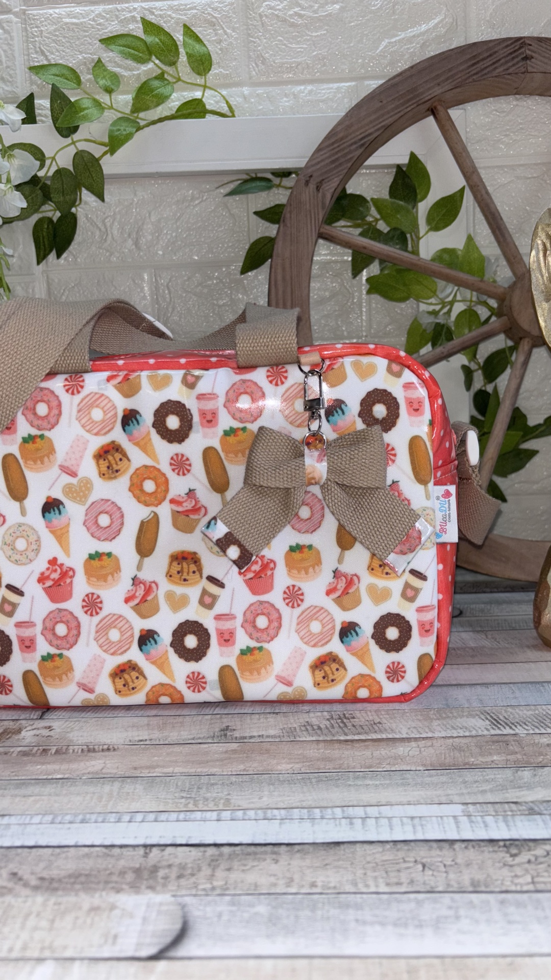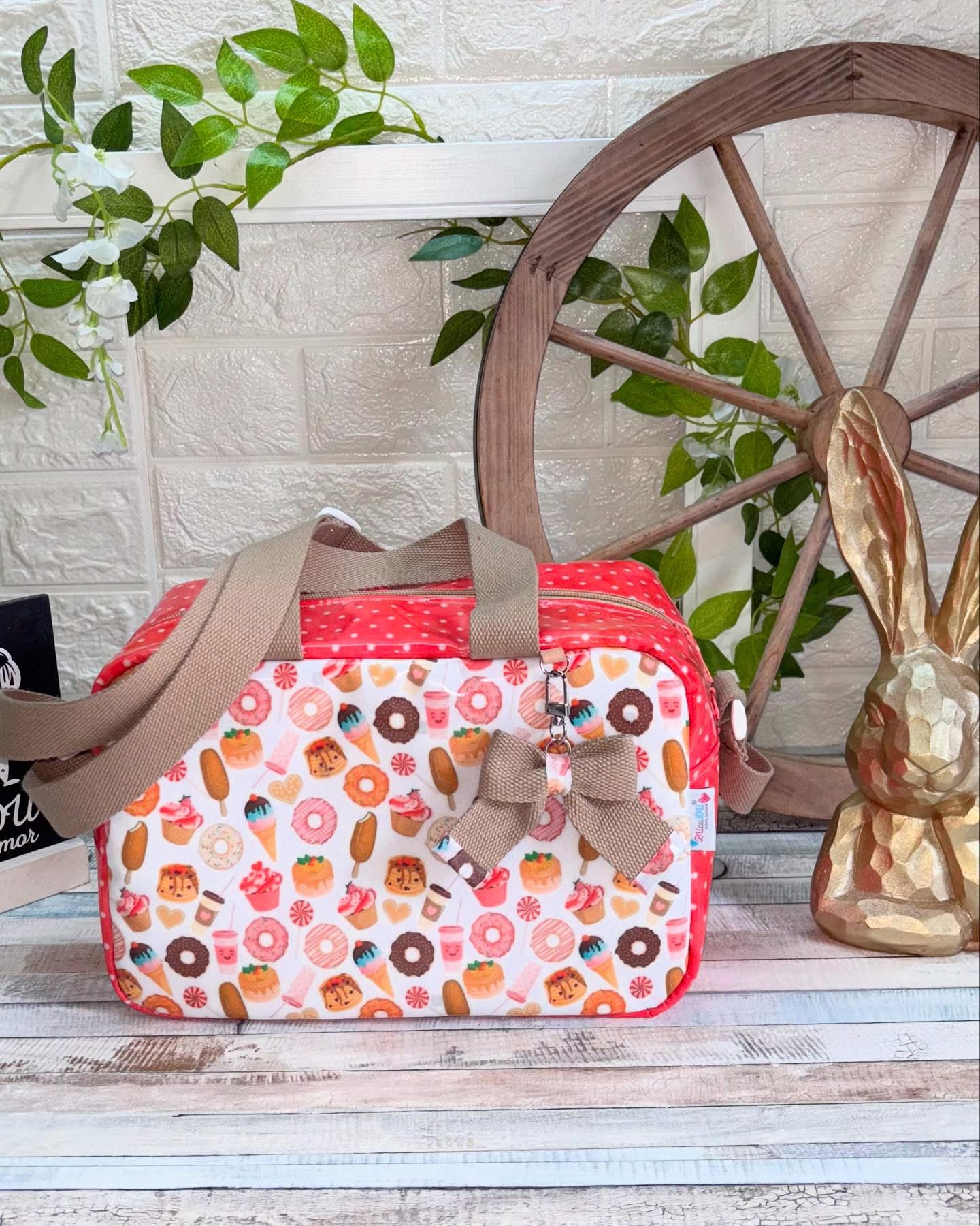 Lancheira Sandy 31,50 € Desconto de %. Partilhar Comprar Contactar 1 unidades em stock | SKU: LS119 Lancheira Sandy Térmicas e Plastificadas no Exterior e Interior Alça de Mão e de Ombro Bolso no Interior Doces, Vermelho Bolas Brancas, Alça Camel Medidas: 28x15x19 (8 Litros) Produto Artesanal Marca Bucadu com Amor Tags lancheirastérmicavermelhocremeDoces