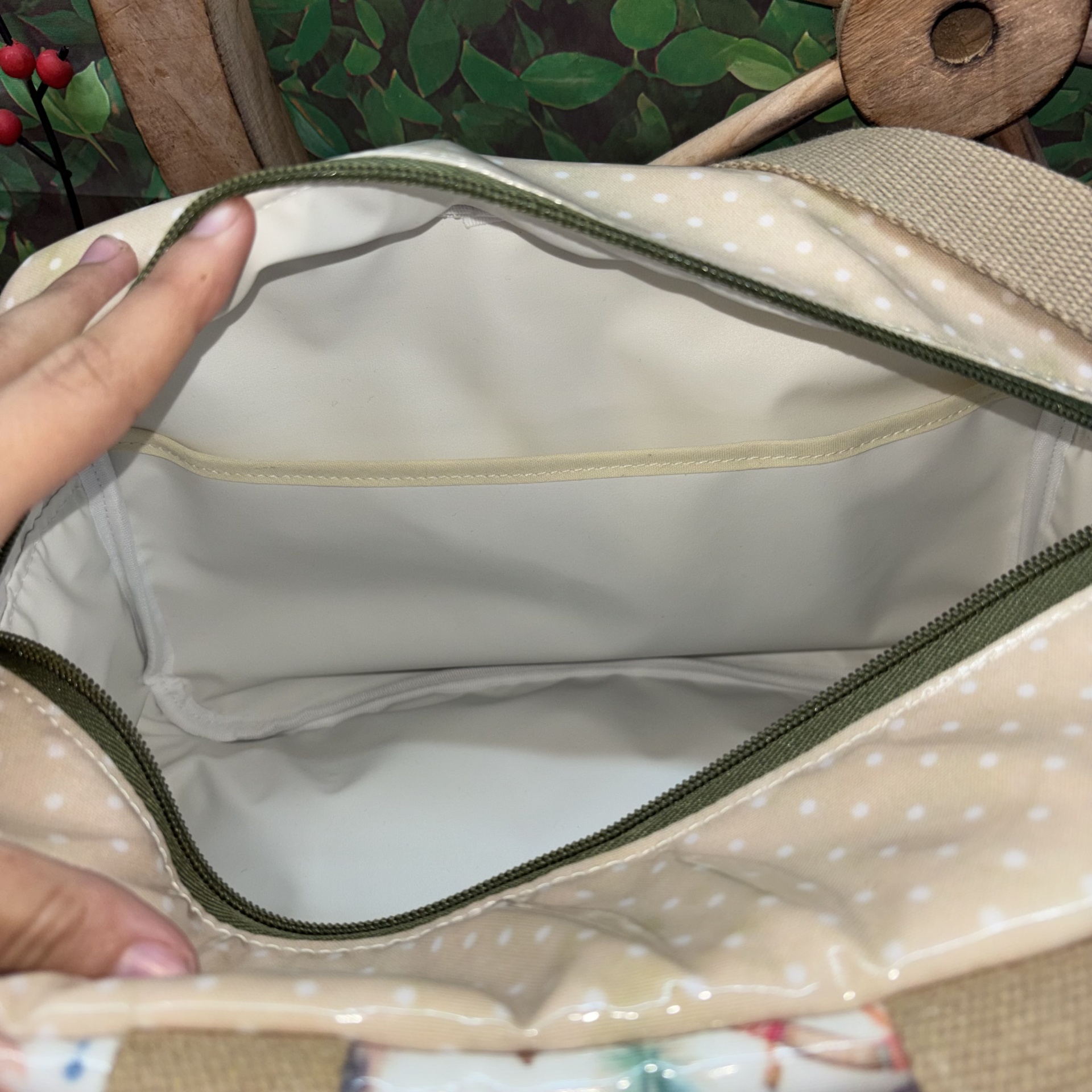 • Interior de mala bege com bolinhas brancas e fecho verde aberta mostrando bolso interno