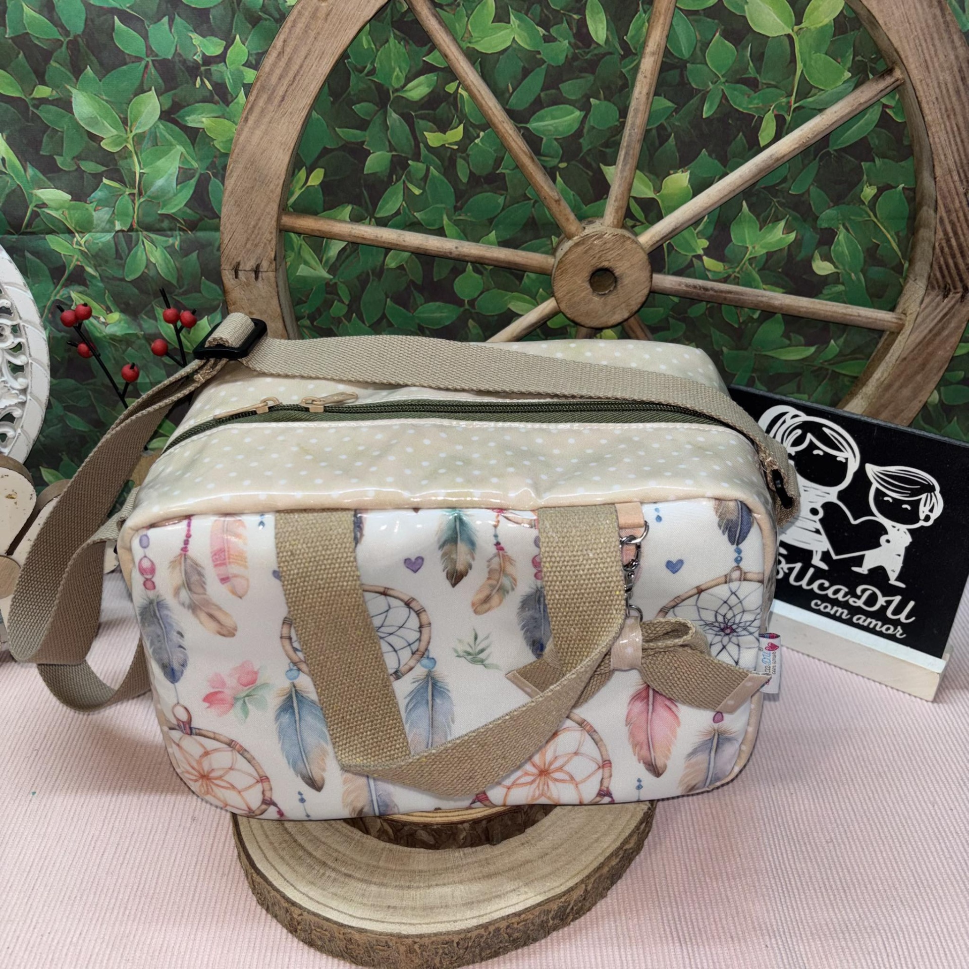 Mala retangular creme com padrão de captores de sonhos e penas coloridas, com alças bege em tecido sobre suporte de madeira