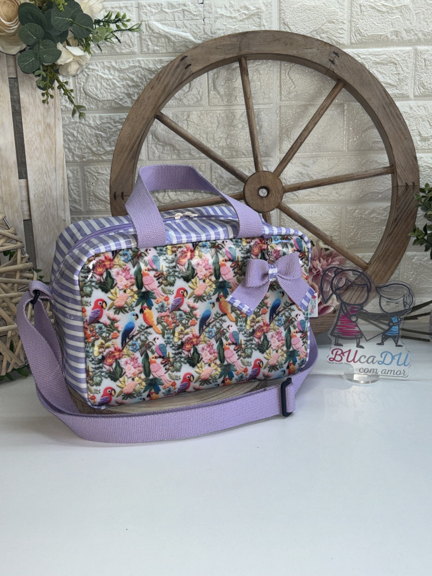 Mala com pássaros coloridos, alças lilás e laço decorativo