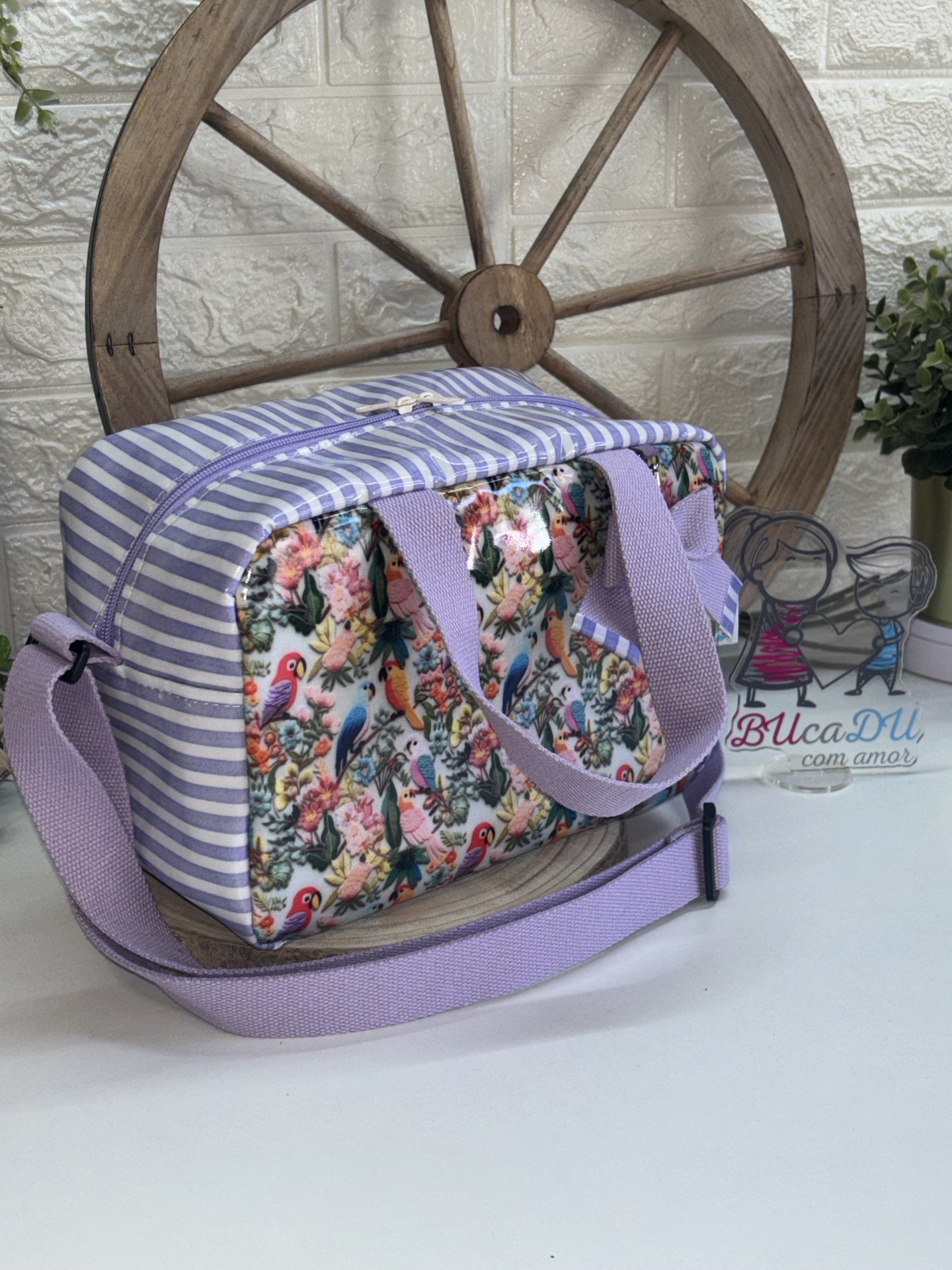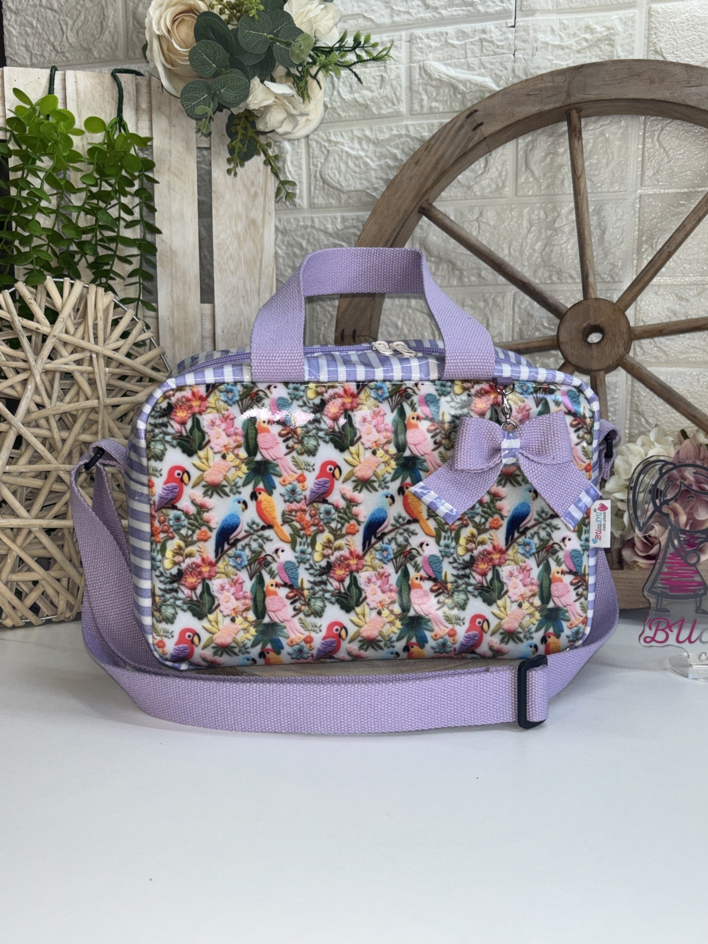 • Mala com pássaros coloridos, alças lilás e laço decorativo
