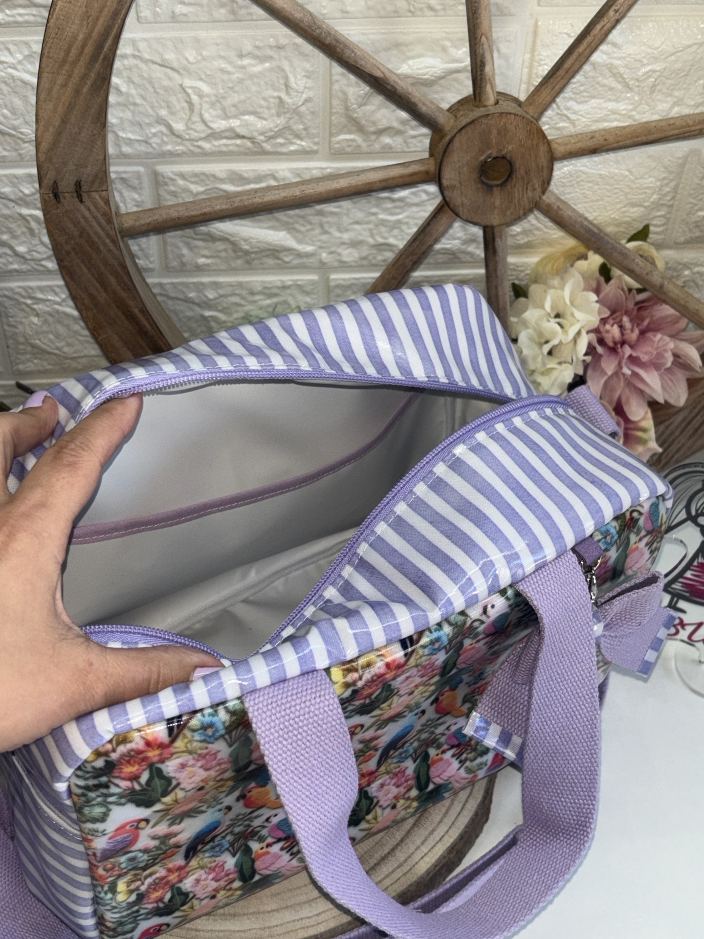• Mala com padrão de pássaros e flores, alças lilás e laço decorativo