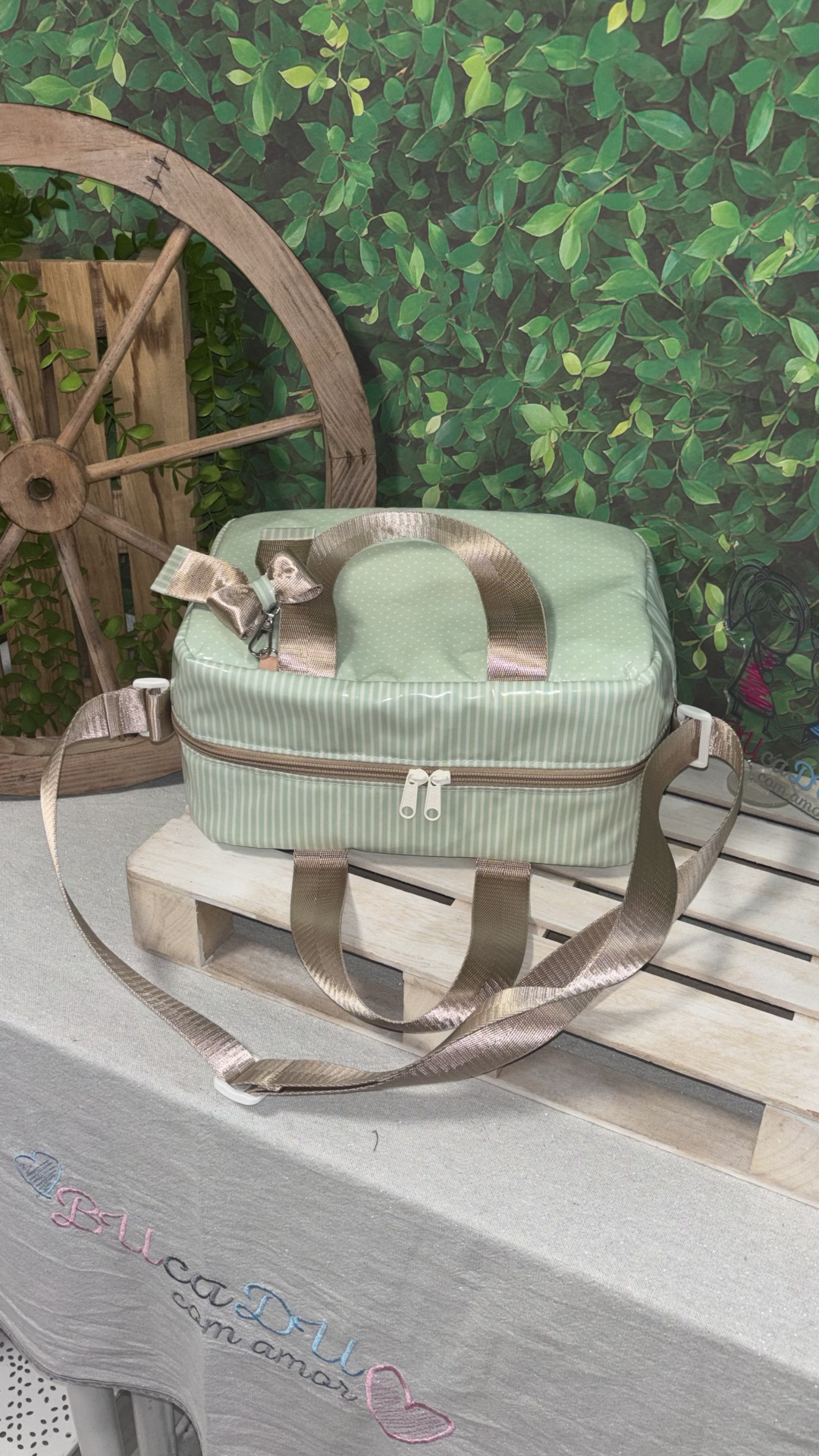 Lancheira Sandy Preço sob consulta Desconto de %. Partilhar Comprar Contactar SKU: LS103 Lancheira Sandy Térmicas e Plastificadas no Exterior e Interior Alça de Mão e de Ombro Bolso no Interior Verde Água Risca e Pintas, Alça Creme Medidas: 28x15x19 (8 Litros) Produto Artesanal Marca Bucadu com Amor Tags térmicalancheirasAdultocriança Características