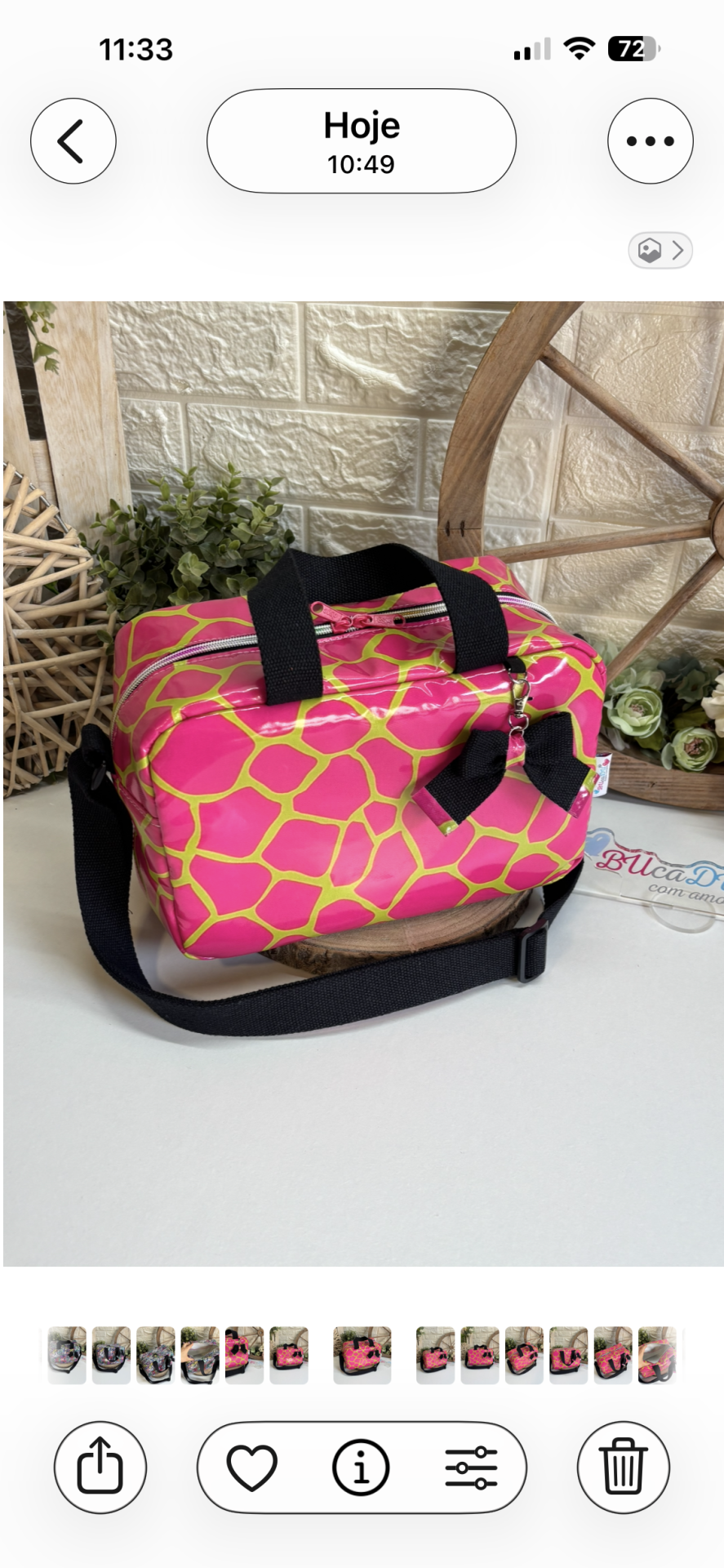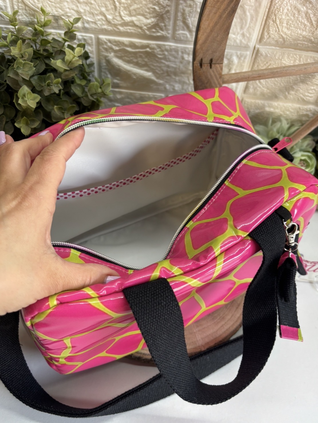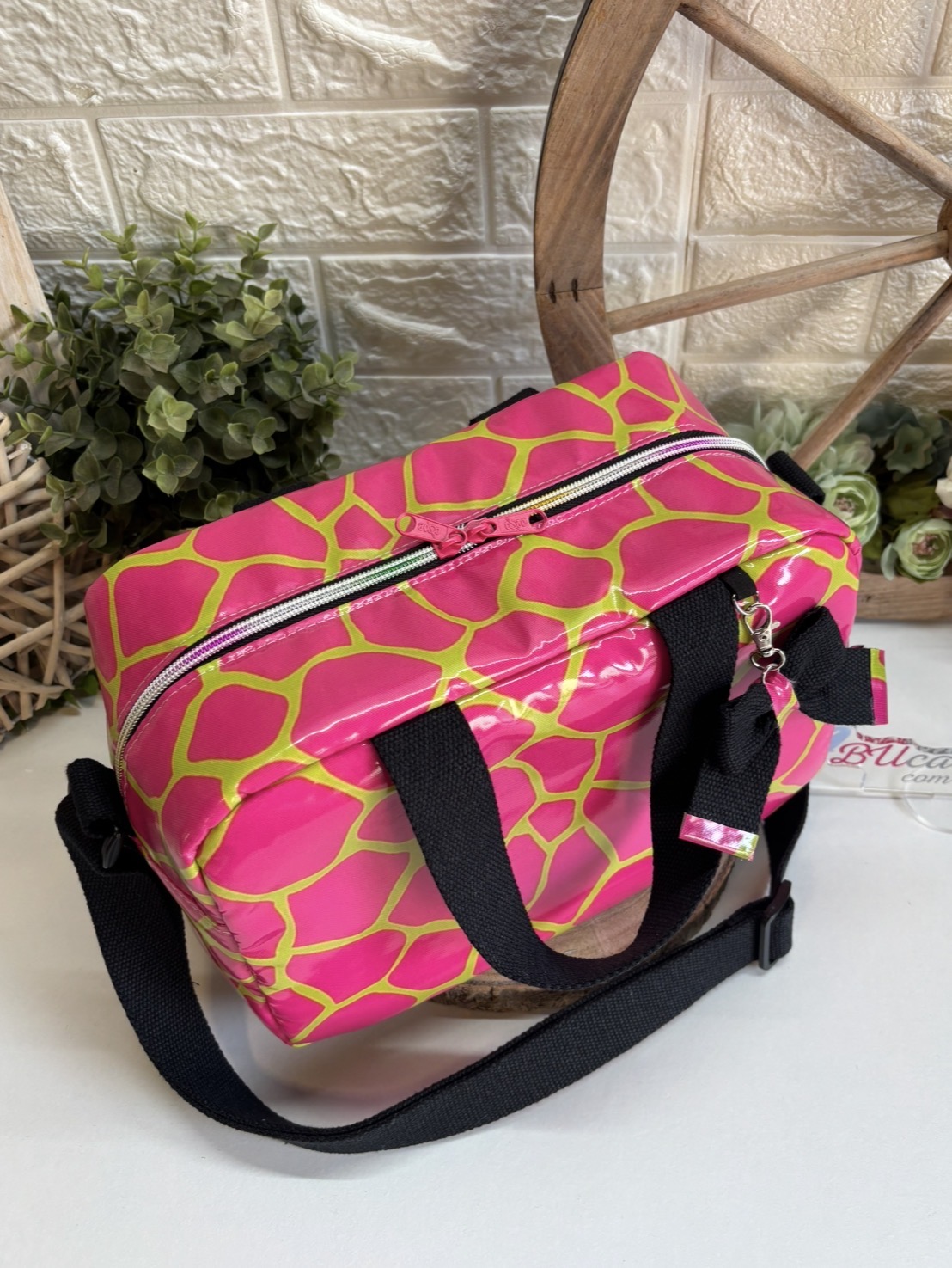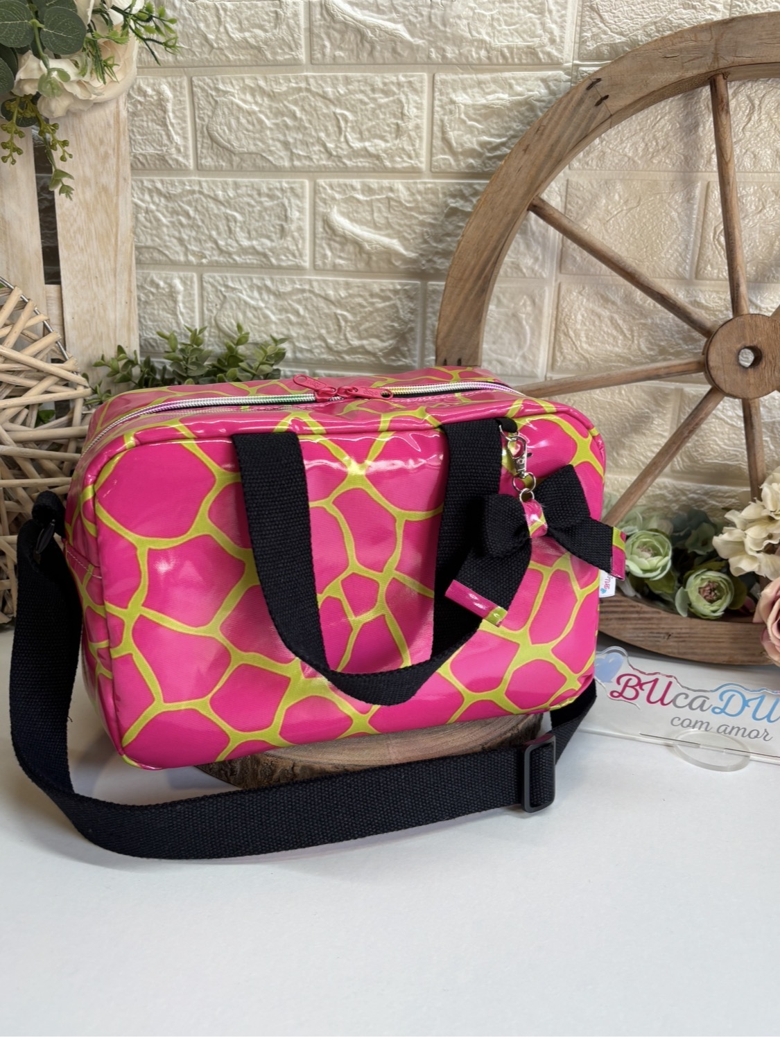 • Mala rosa com padrão amarelo e alça preta sobre superfície branca com plantas e roda de madeira