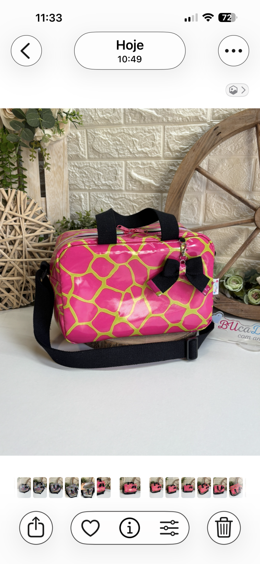 • Bolsa rosa com padrão amarelo, alça preta e laço preto decorativo