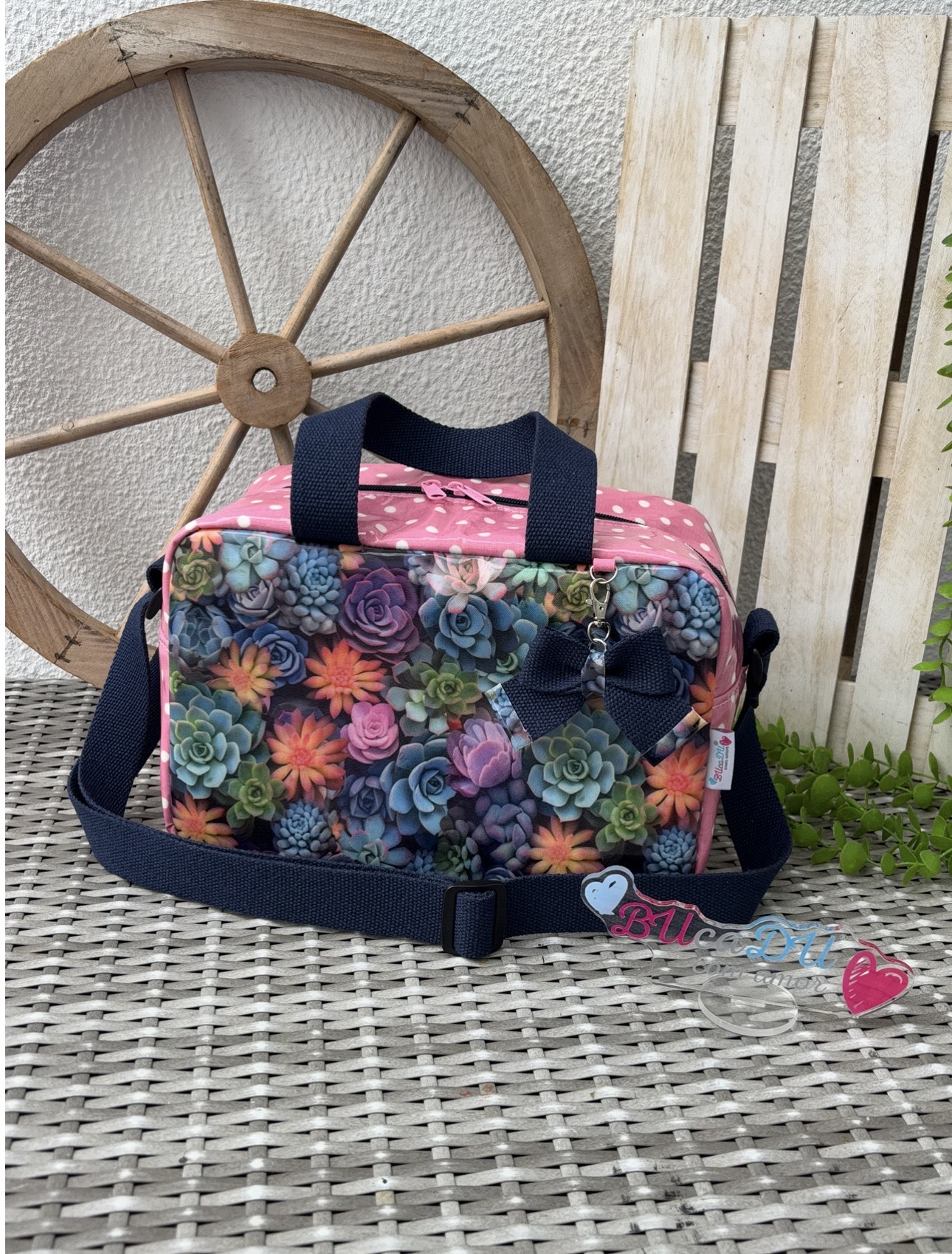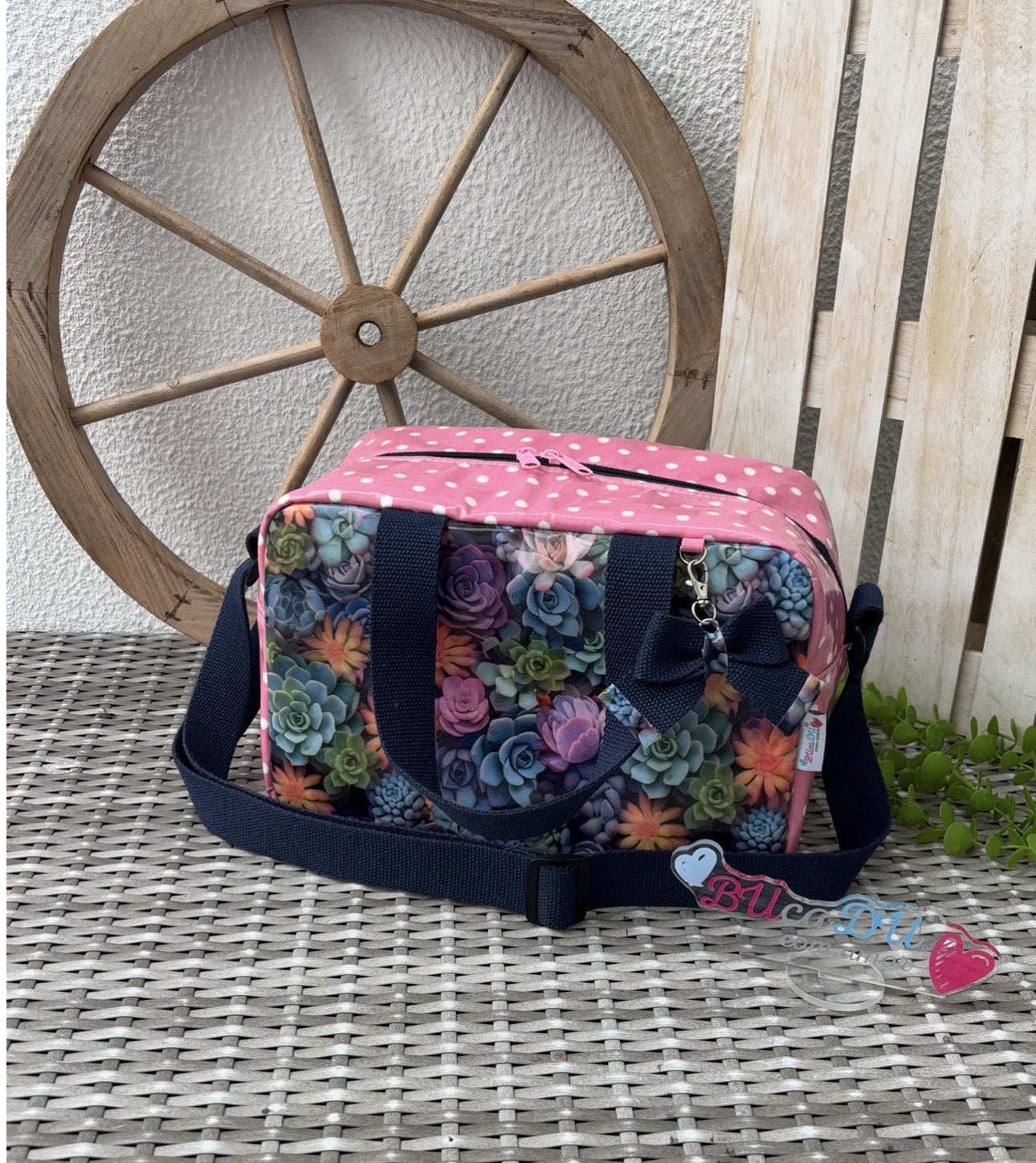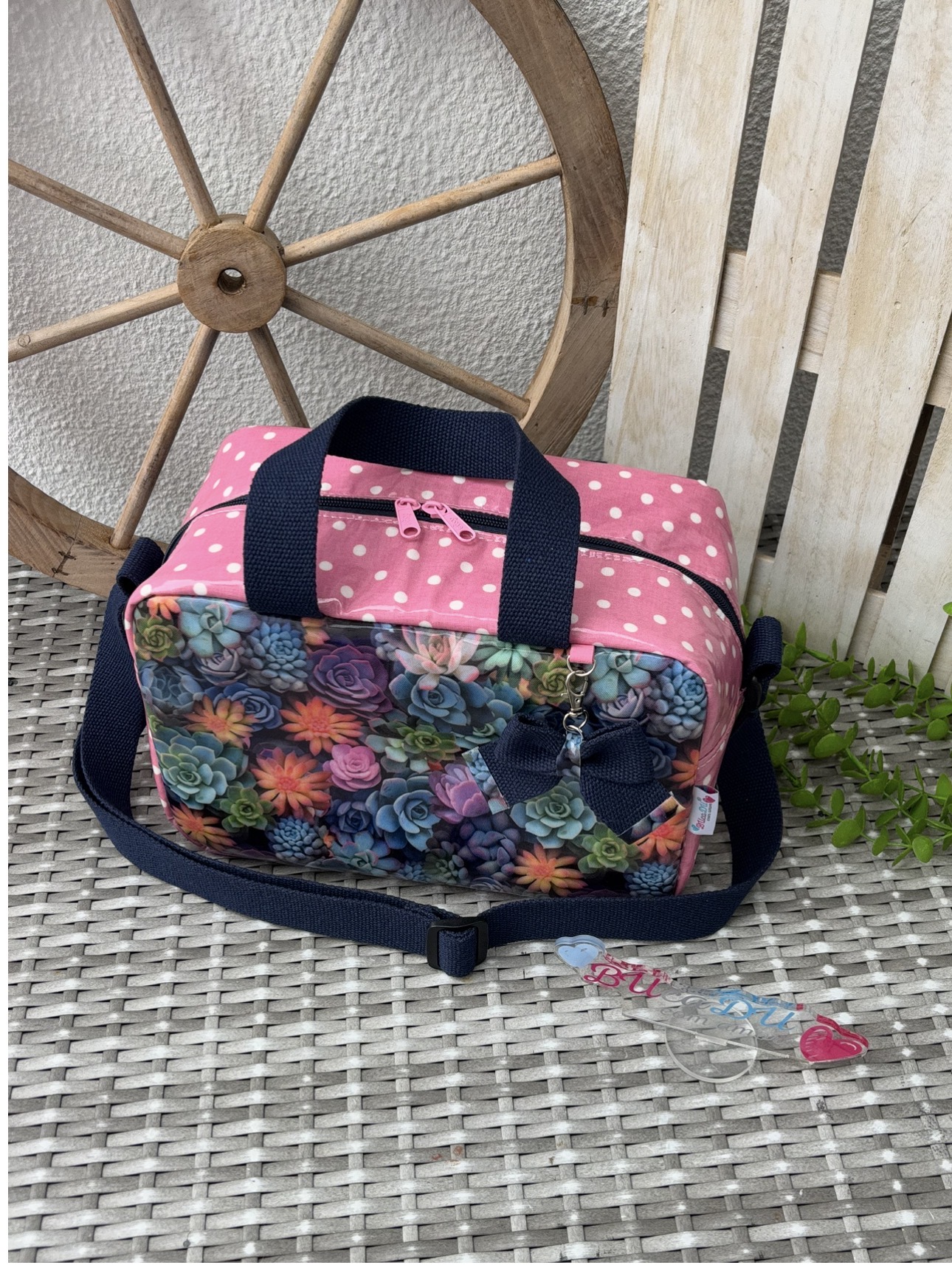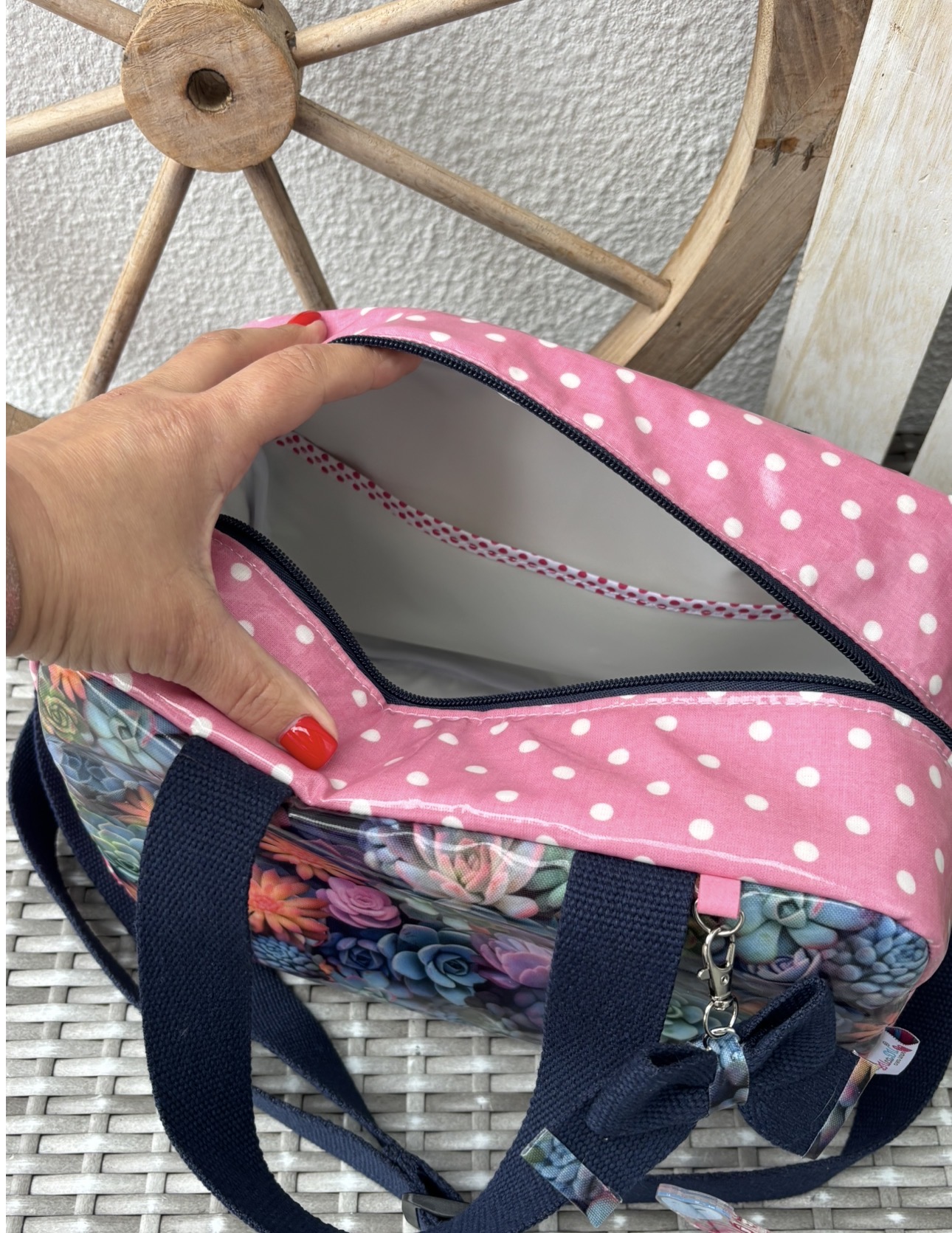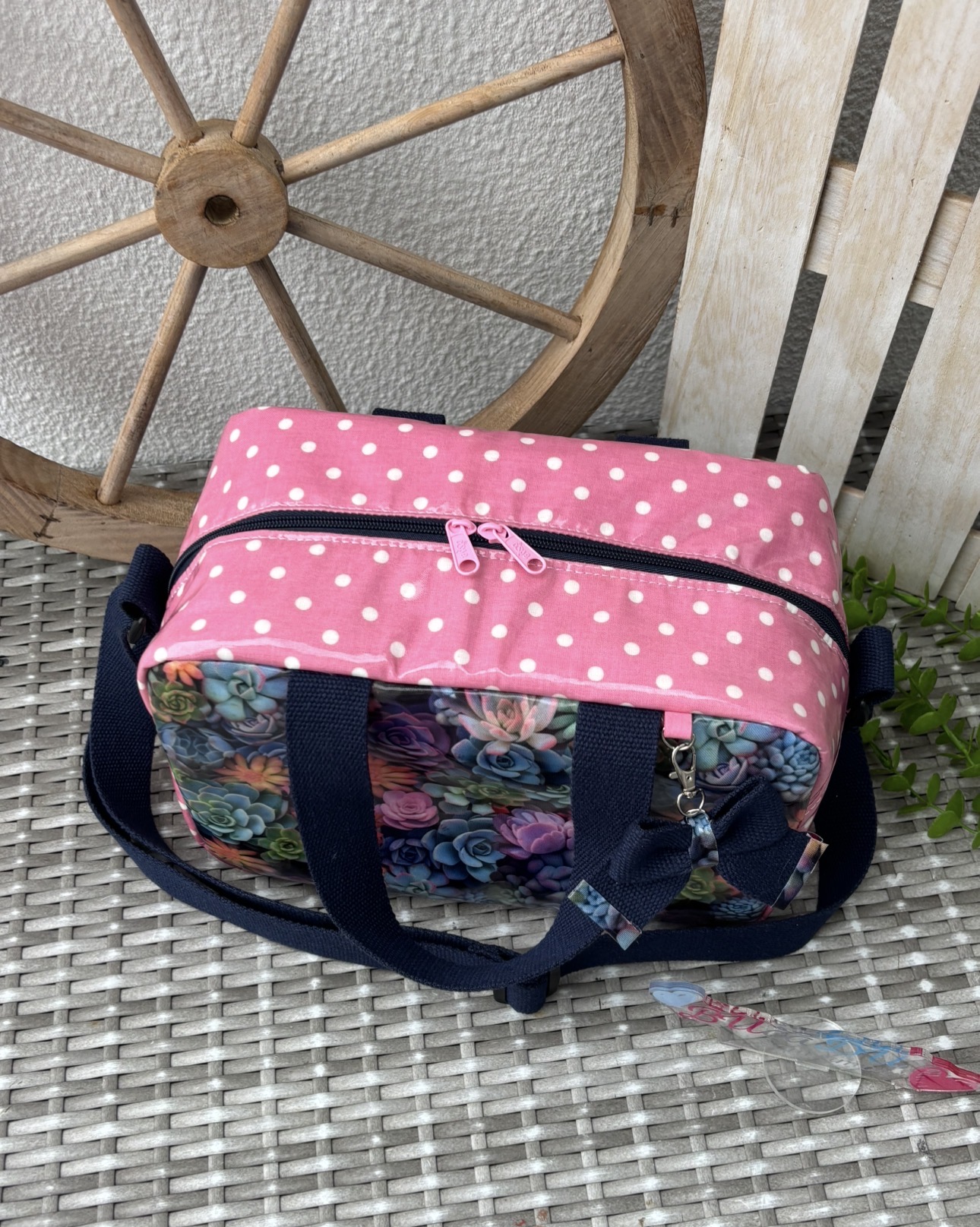 • Mala rosa com bolinhas brancas e estampa colorida de suculentas com interior branco e pega azul escura em tecido.