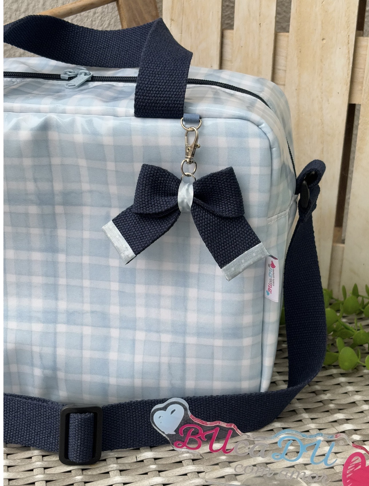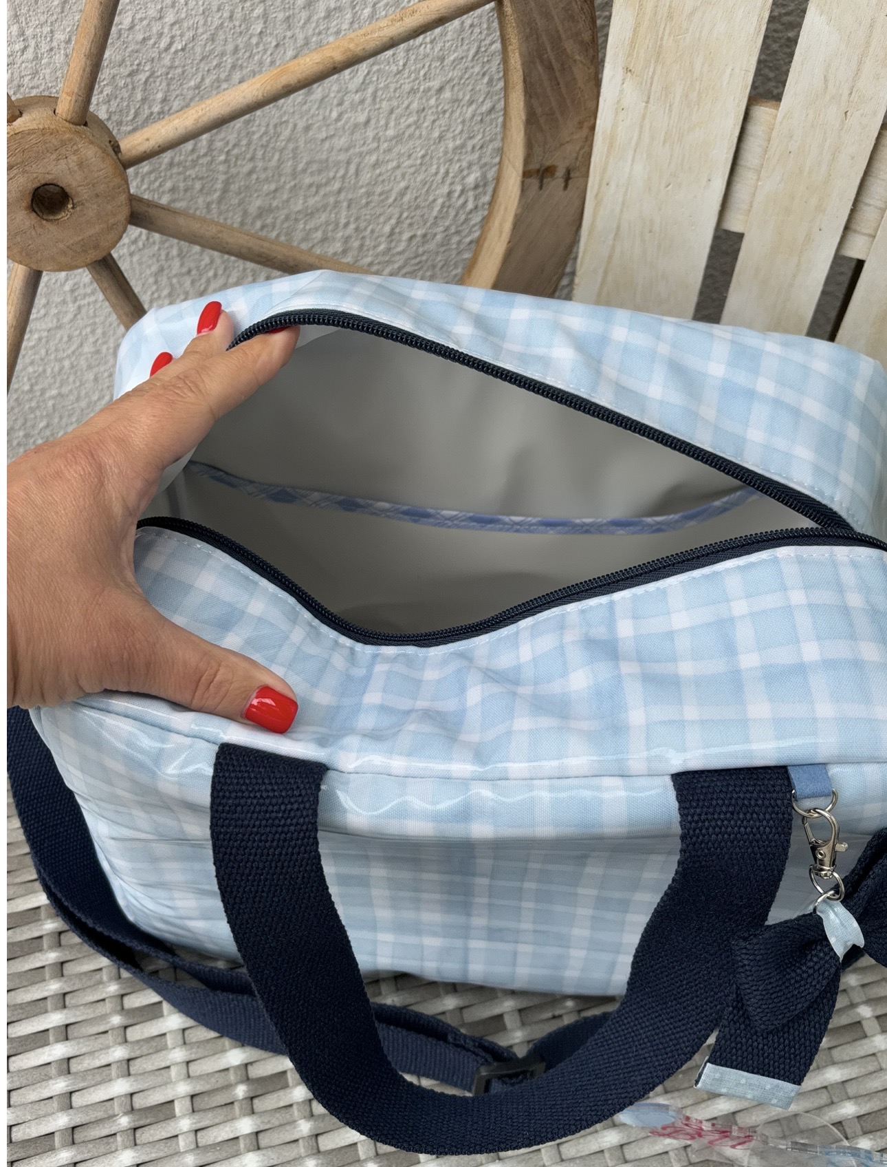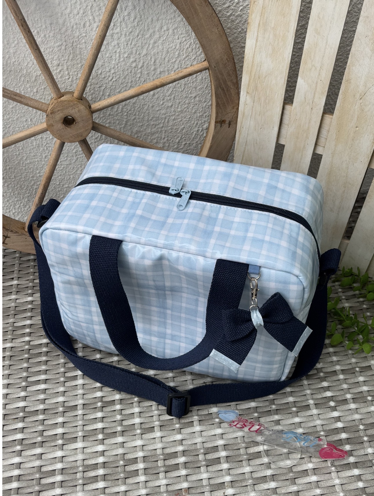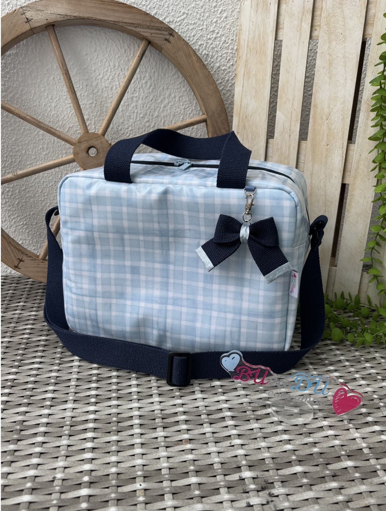 • Mala azul clara com padrão xadrez e alça azul escura com laço