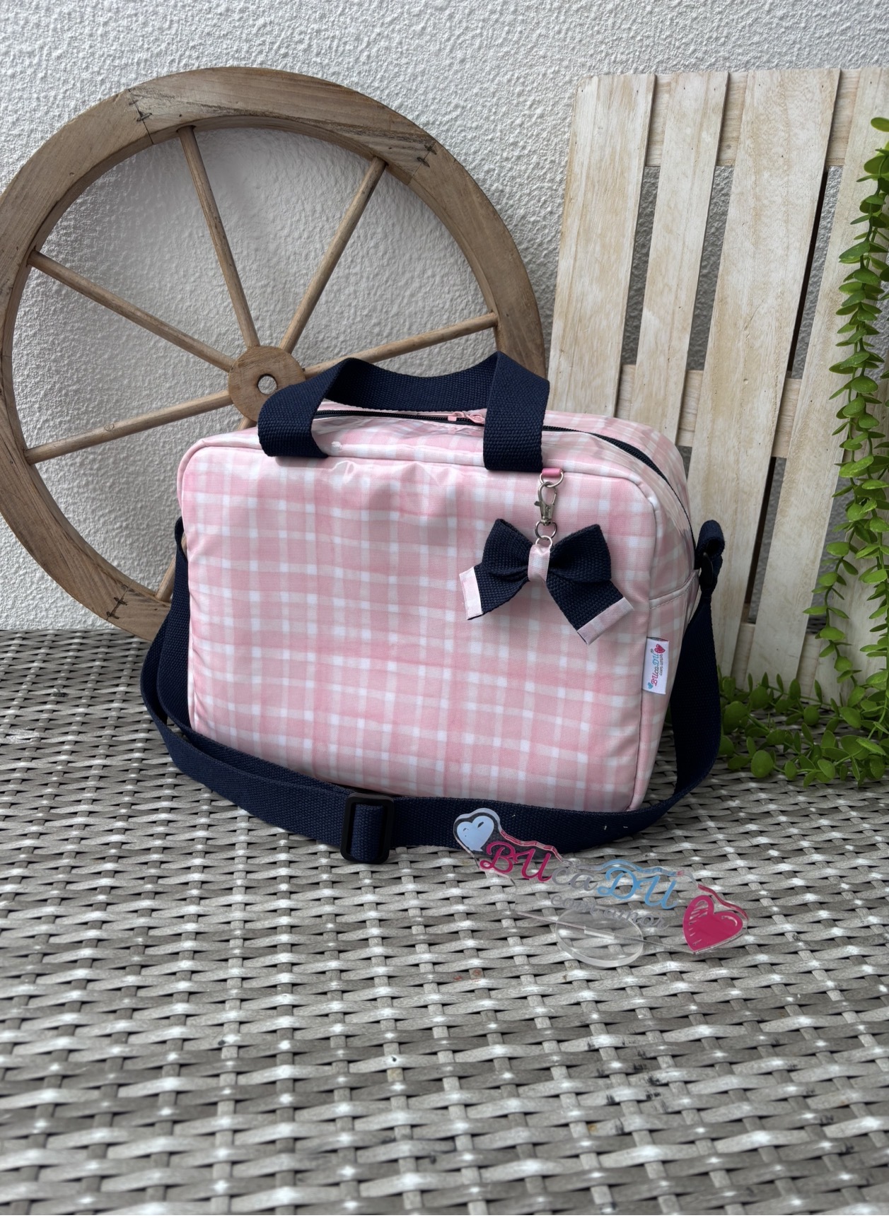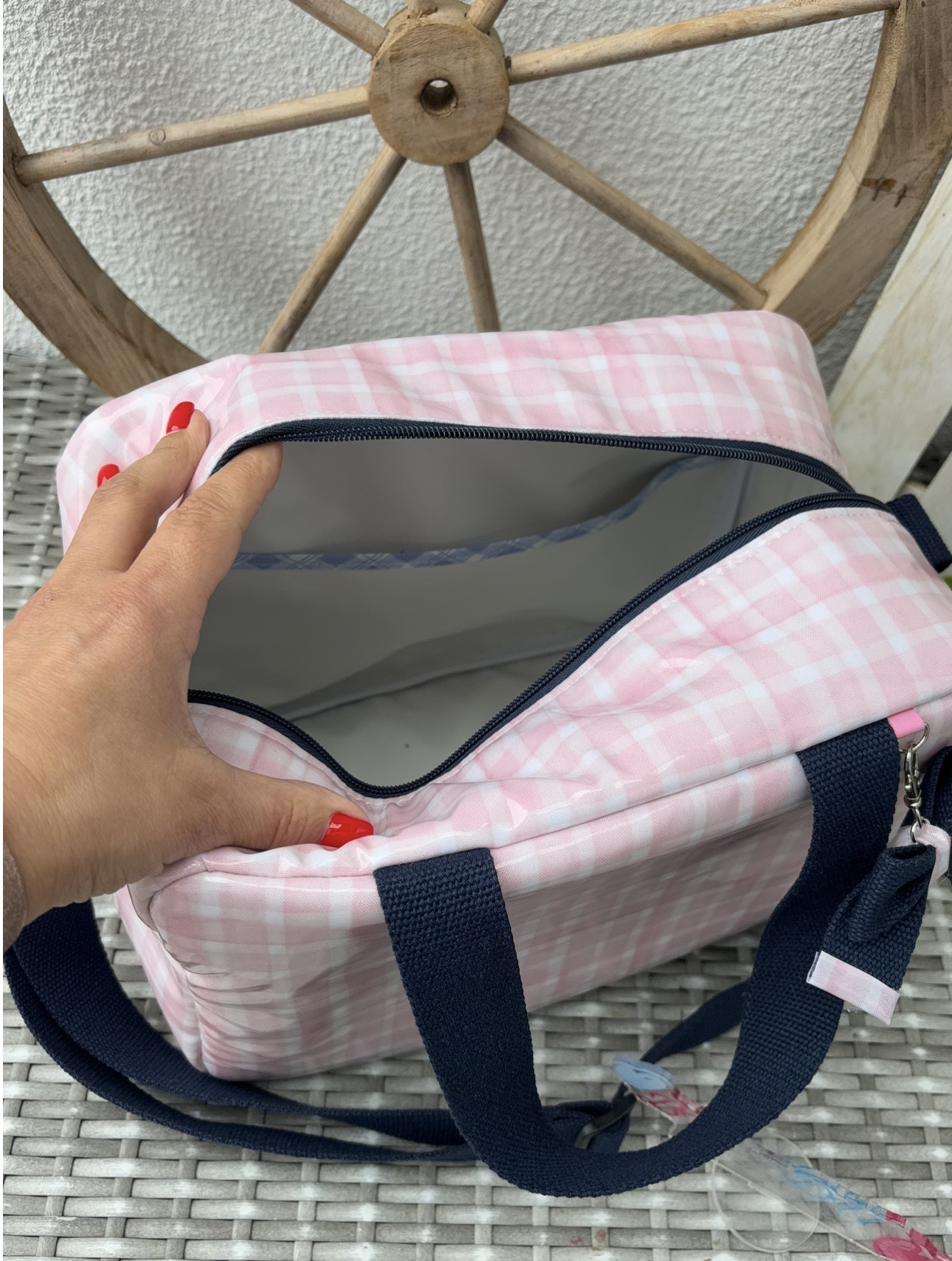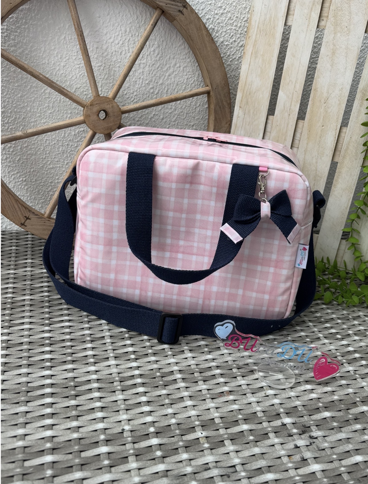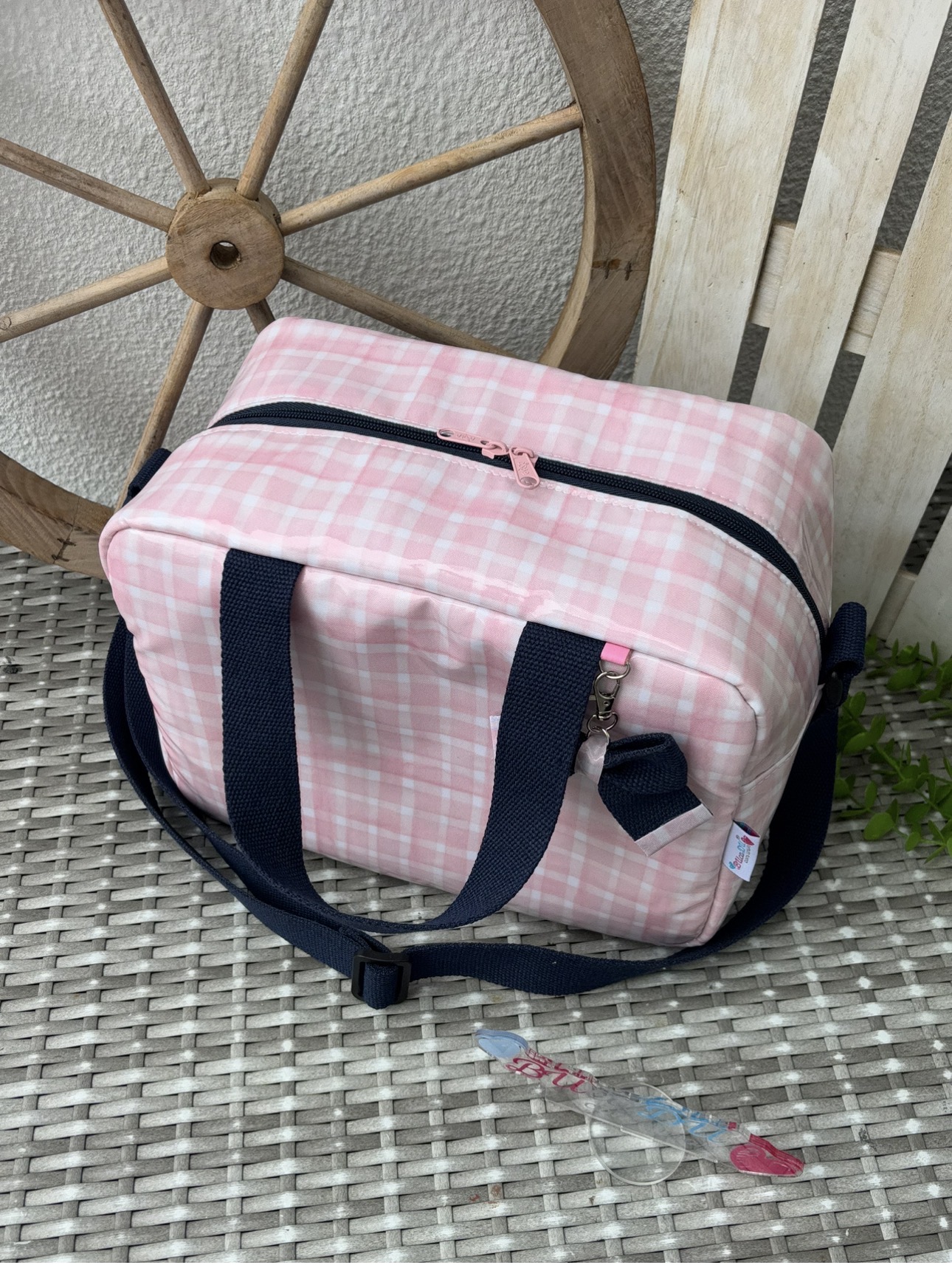 • Bolsa rosa claro xadrez com alças azuis escuras e fecho rosa sobre superfície de vime cinza com roda de madeira atrás