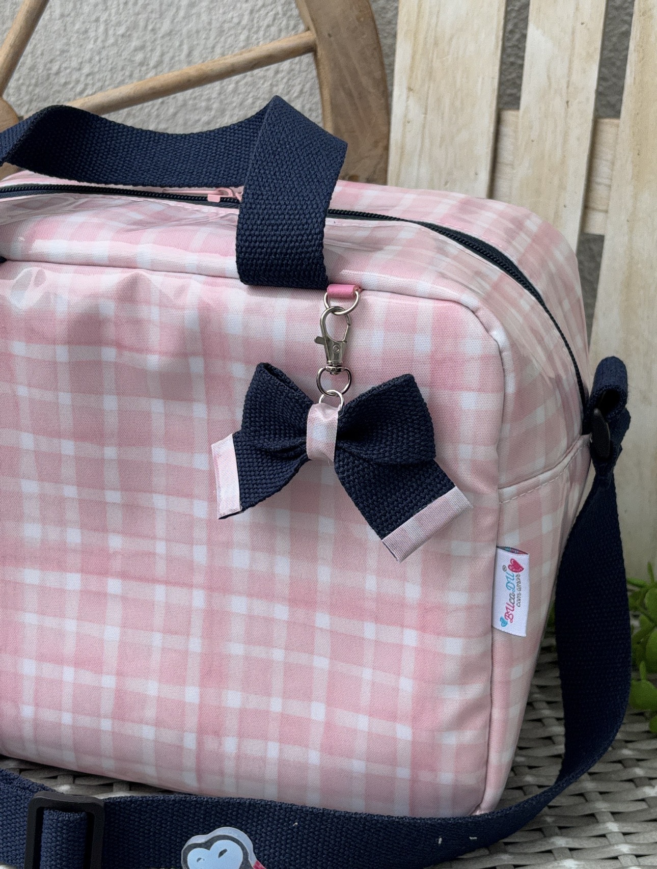 • Mala rosa claro com padrão xadrez e alças azul escuro com laço, sobre superfície cinzenta de verga