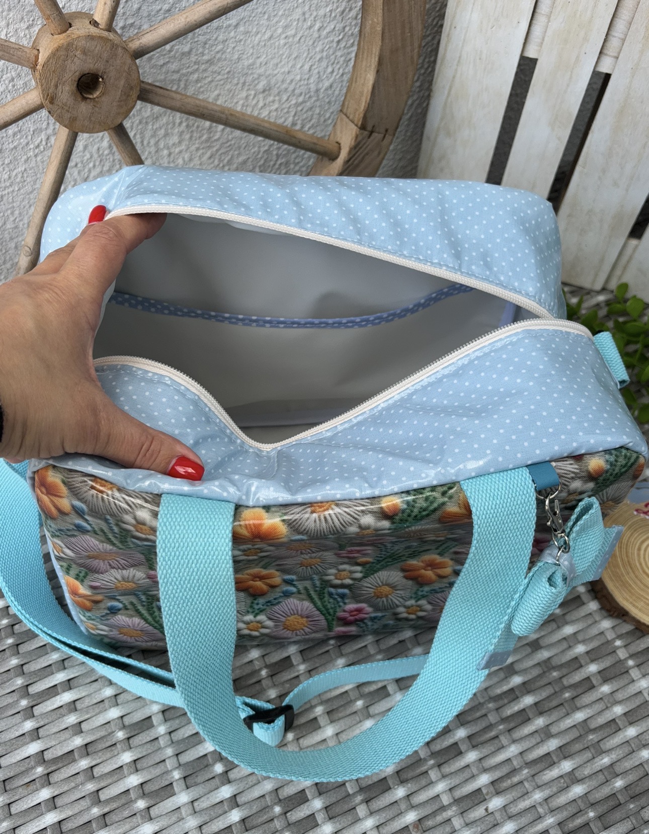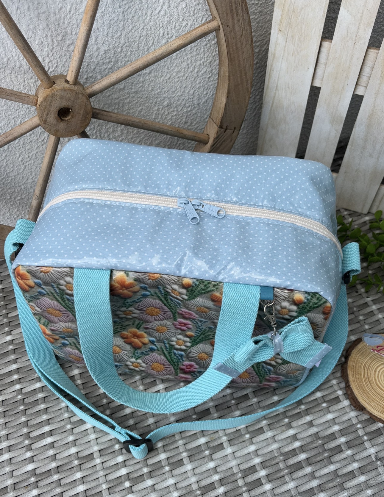 • Mala azul com padrão bolinhas e flores, alças azuis, sobre fundo cinza e roda de madeira