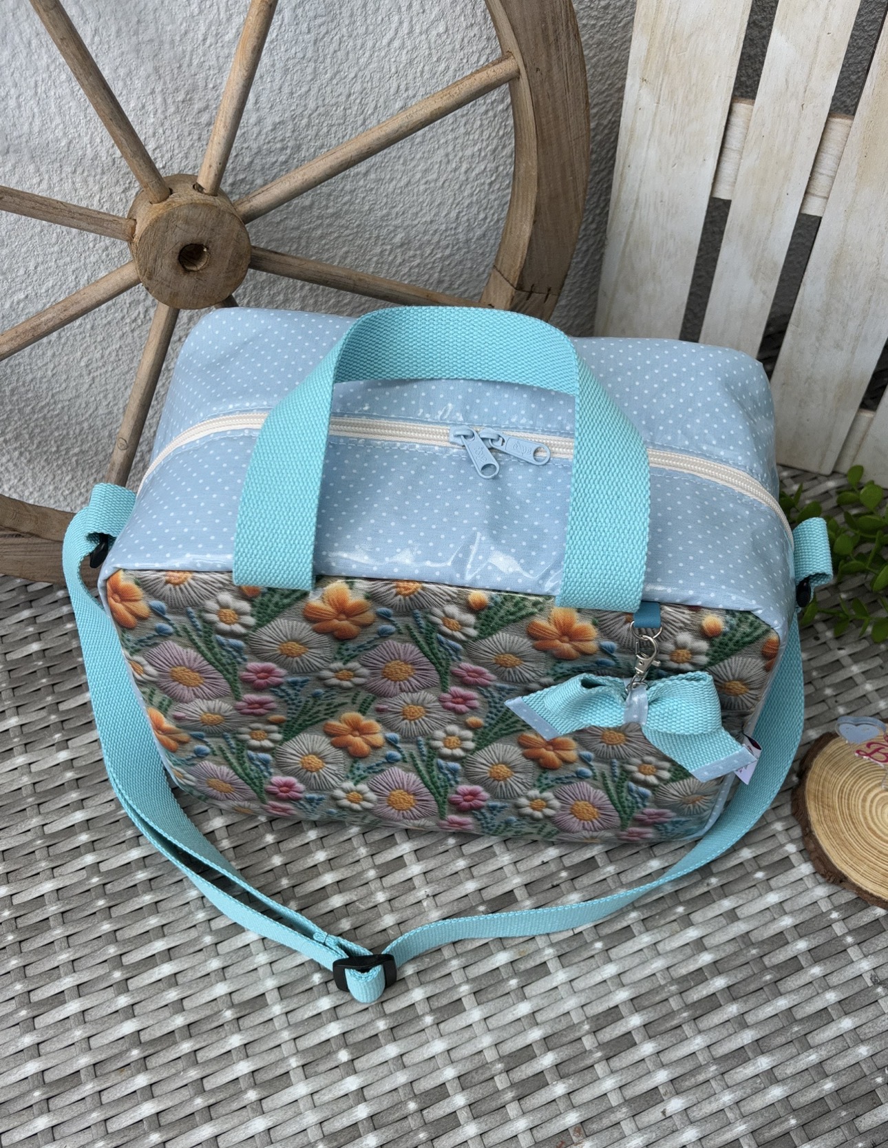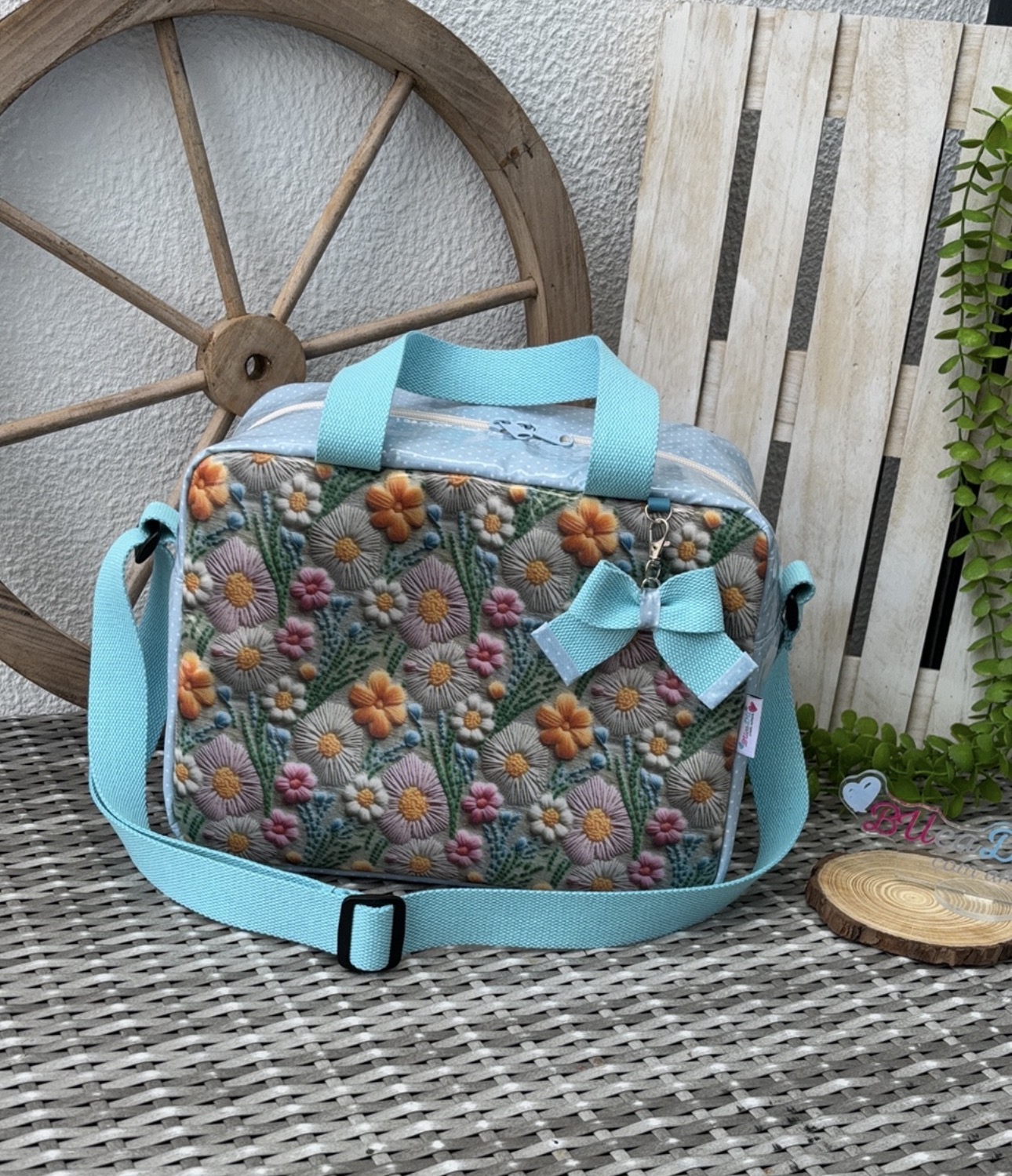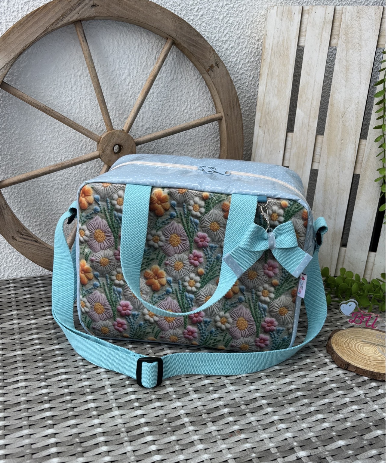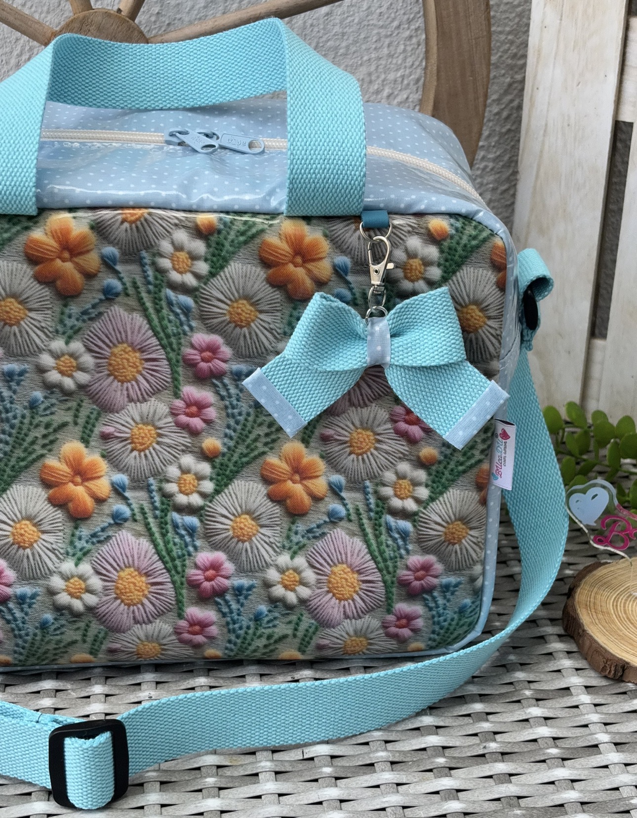 • Mala azul claro bordada com flores coloridas e laço, colocada sobre superfície cinza entre roda e palete de madeira