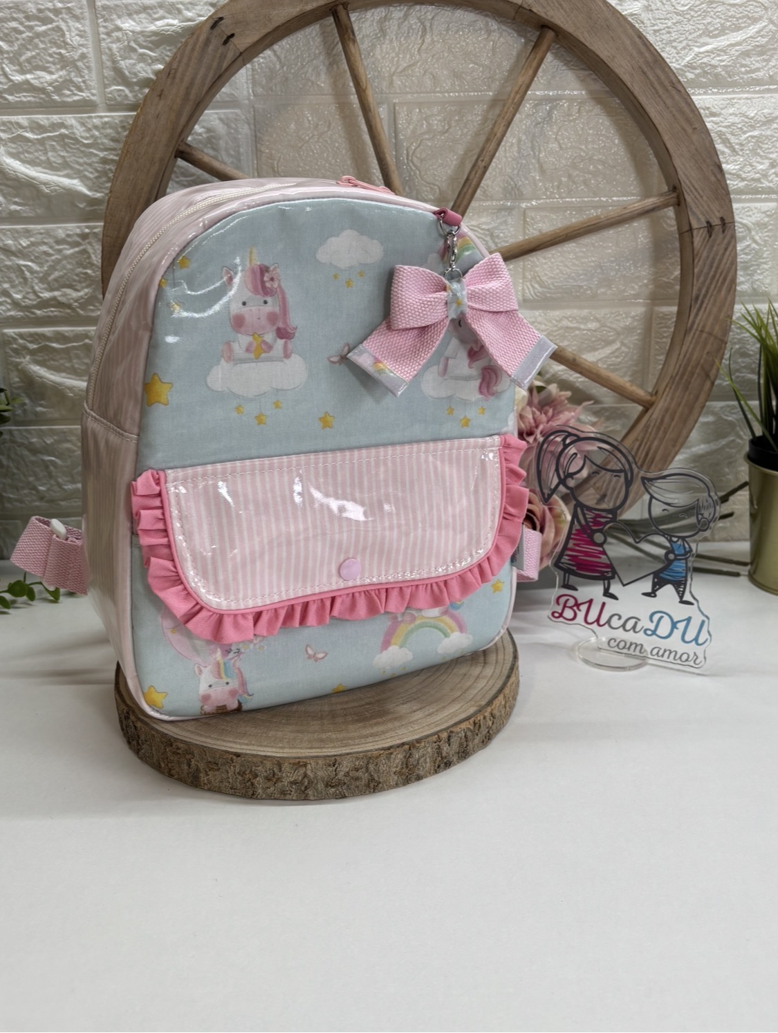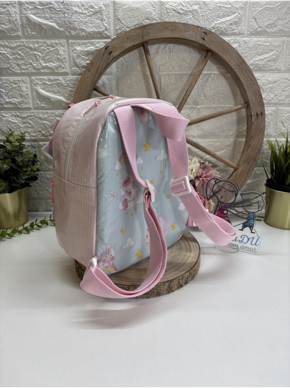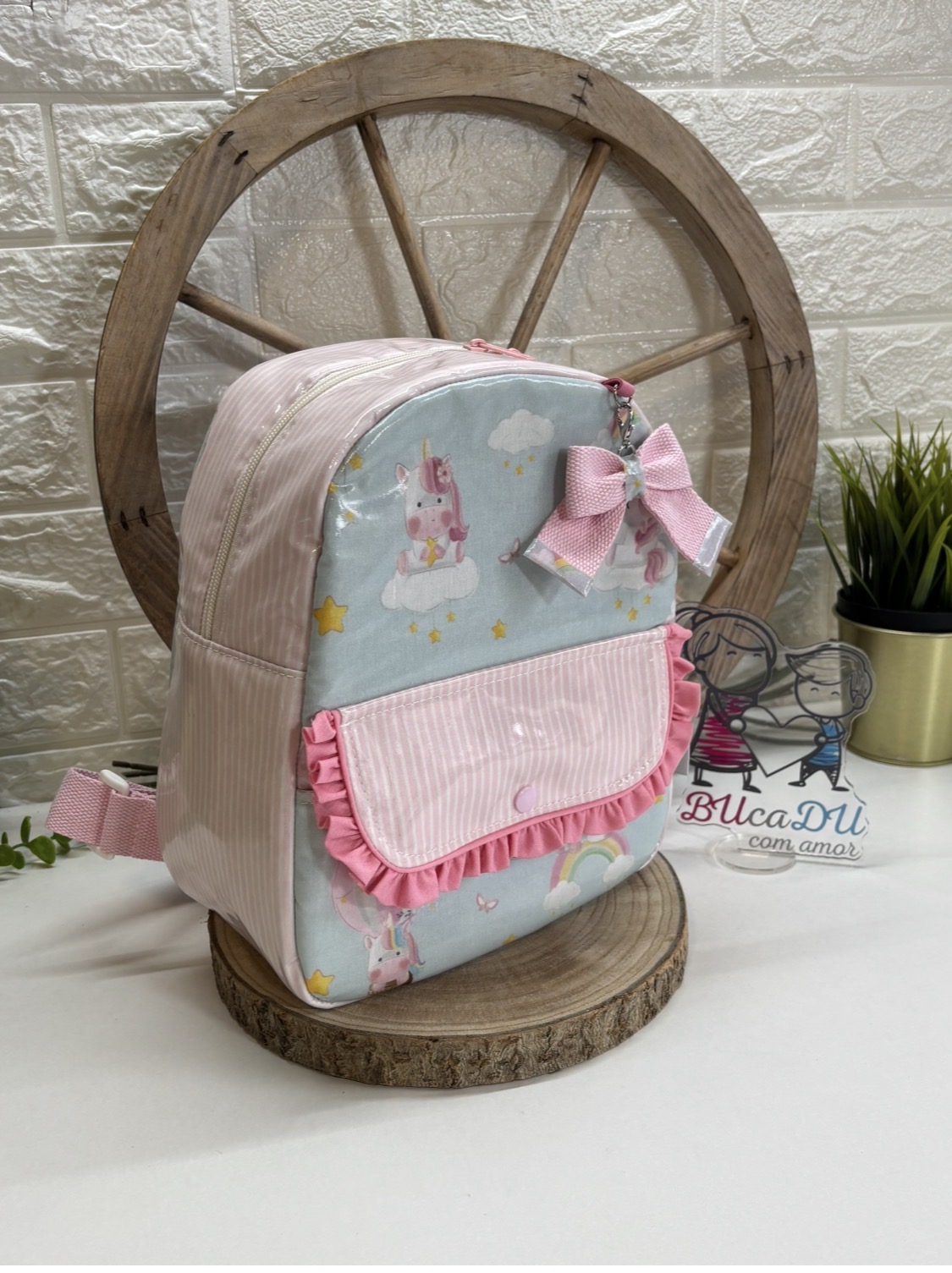 • Mochila infantil rosa com padrão de unicórnios e detalhes em fita e folhos