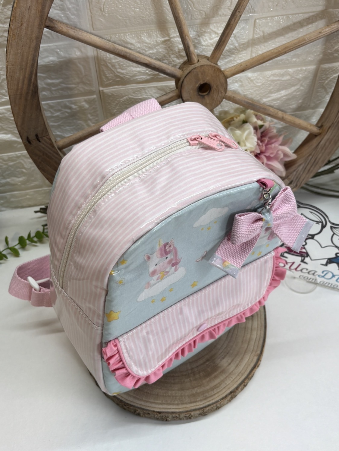 • Mochila infantil azul e rosa com unicórnios e laço cor-de-rosa